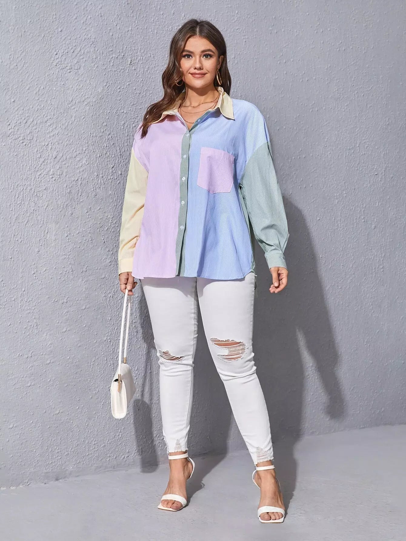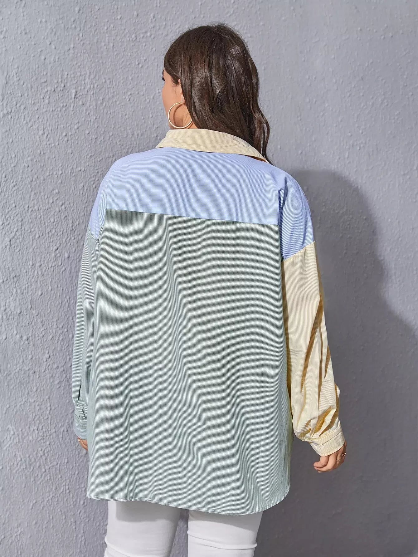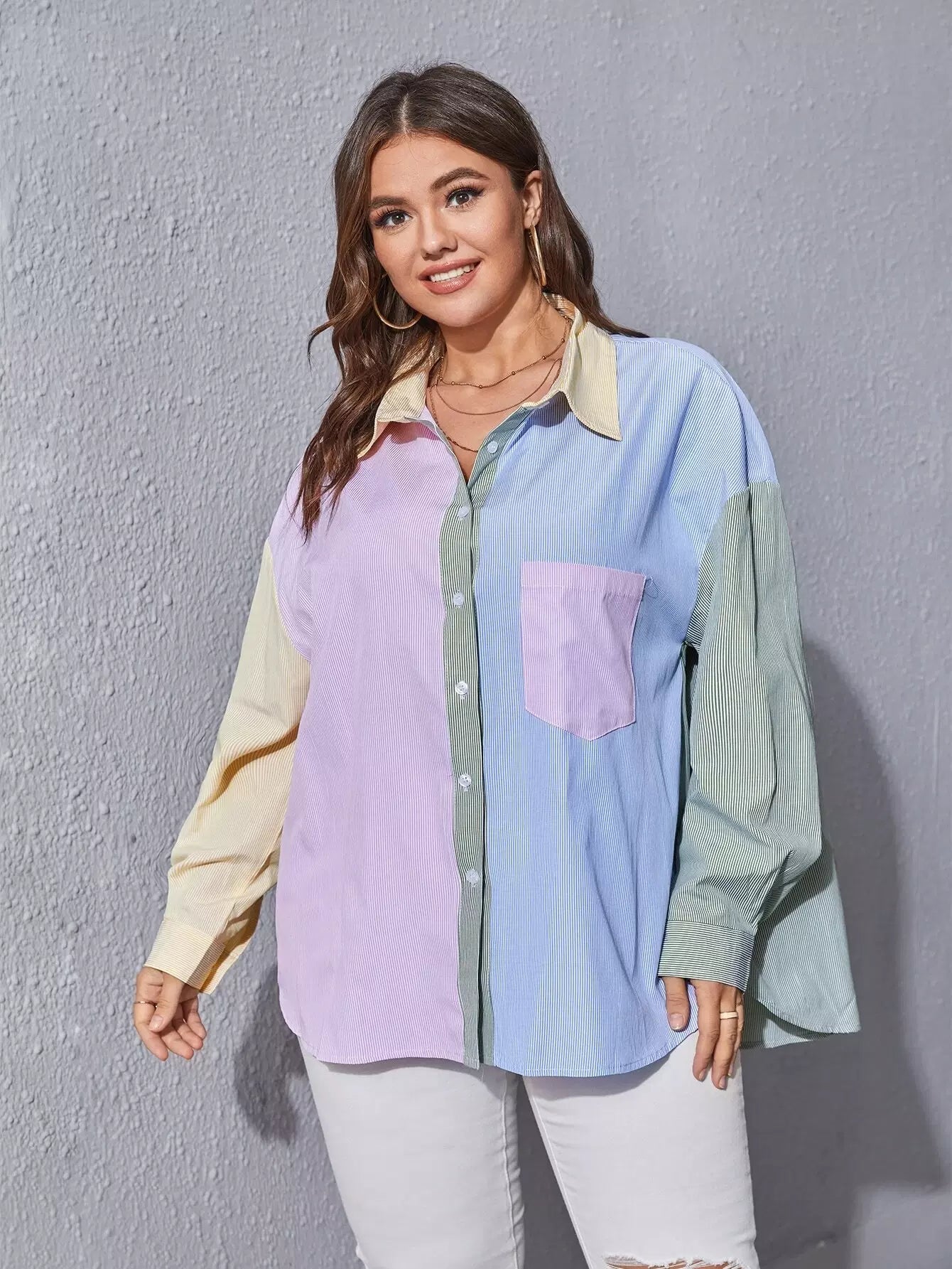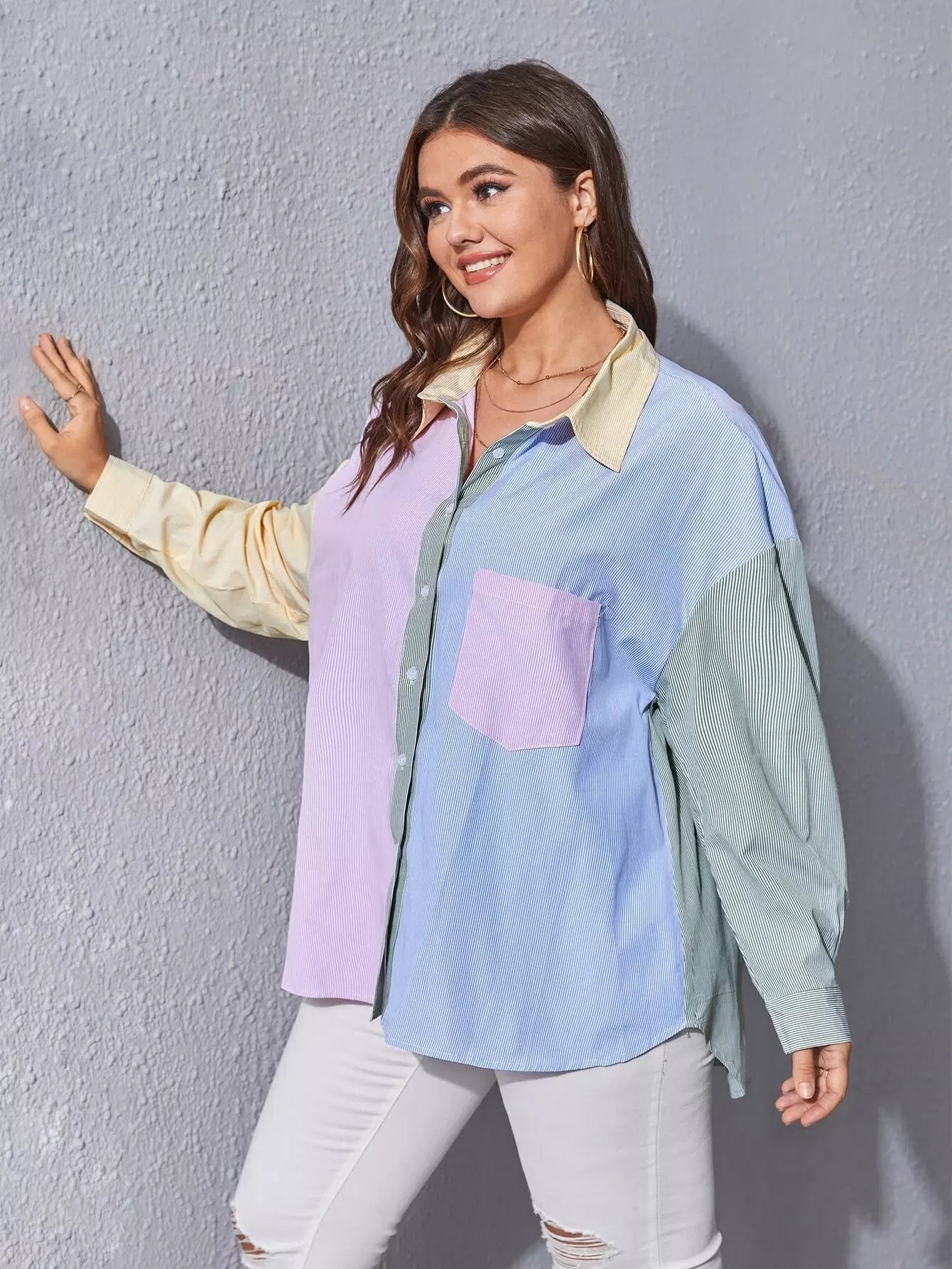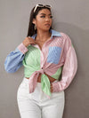 Plus Color-block Striped Pocket Front Blouse