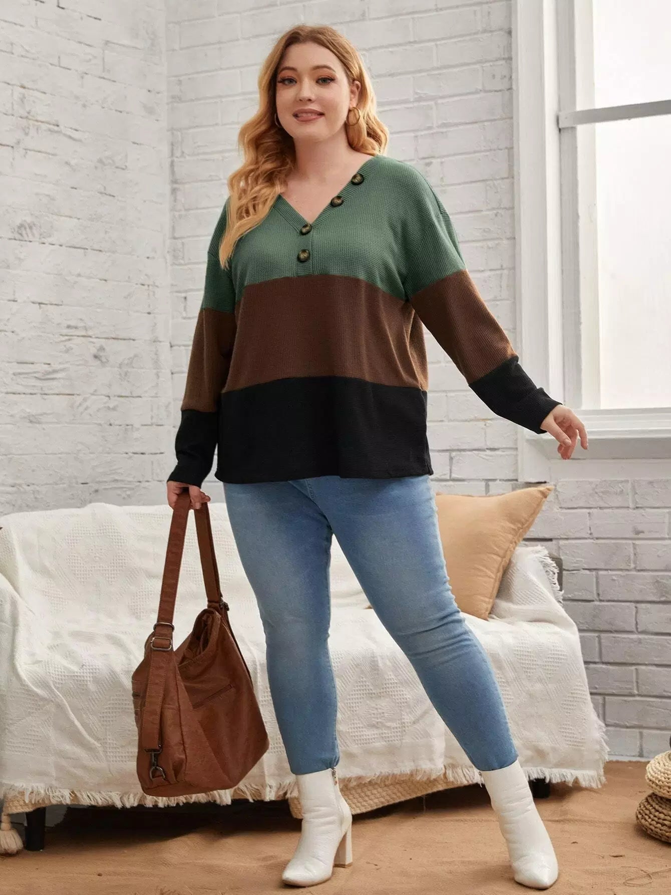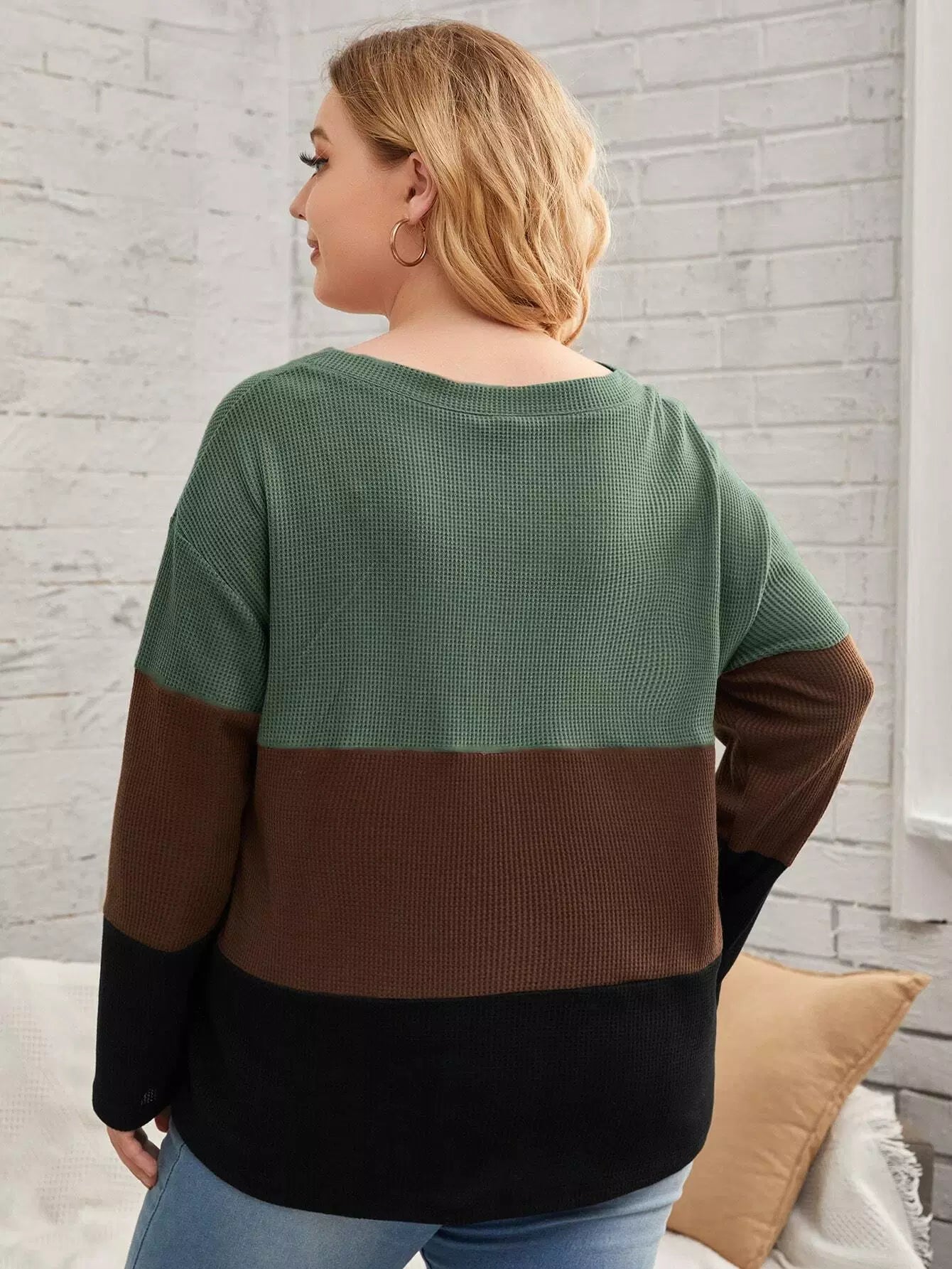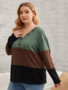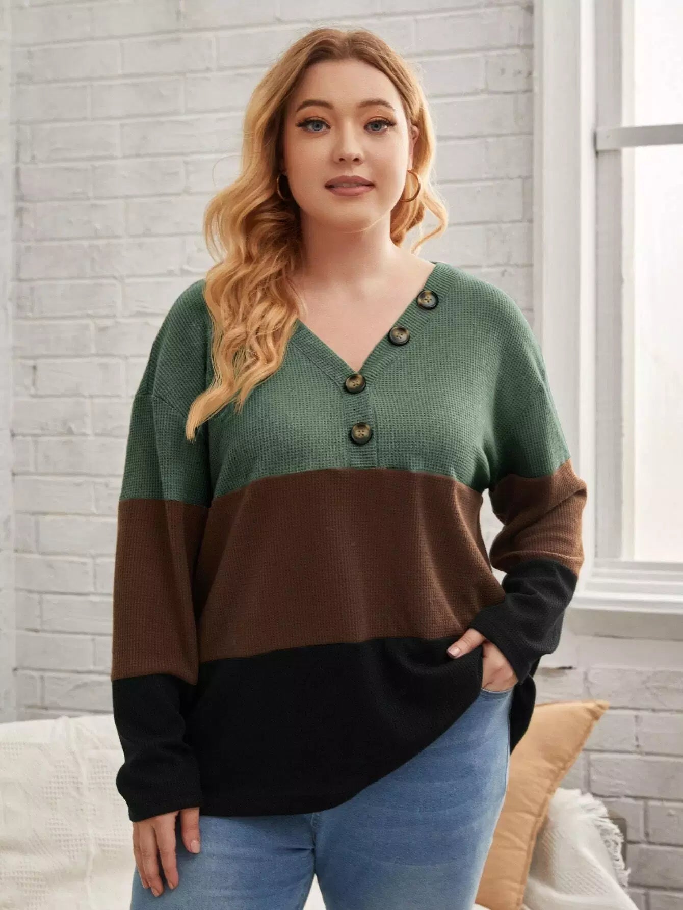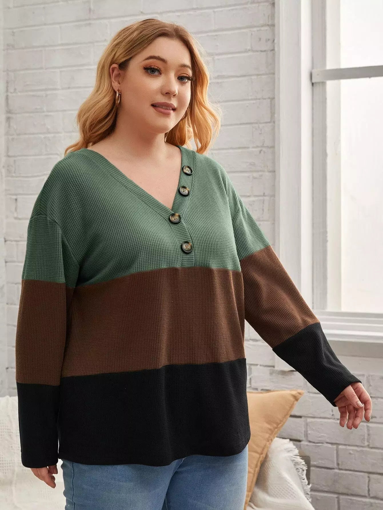 Plus Color Block Waffle Knit Button Detail Drop Shoulder Tee