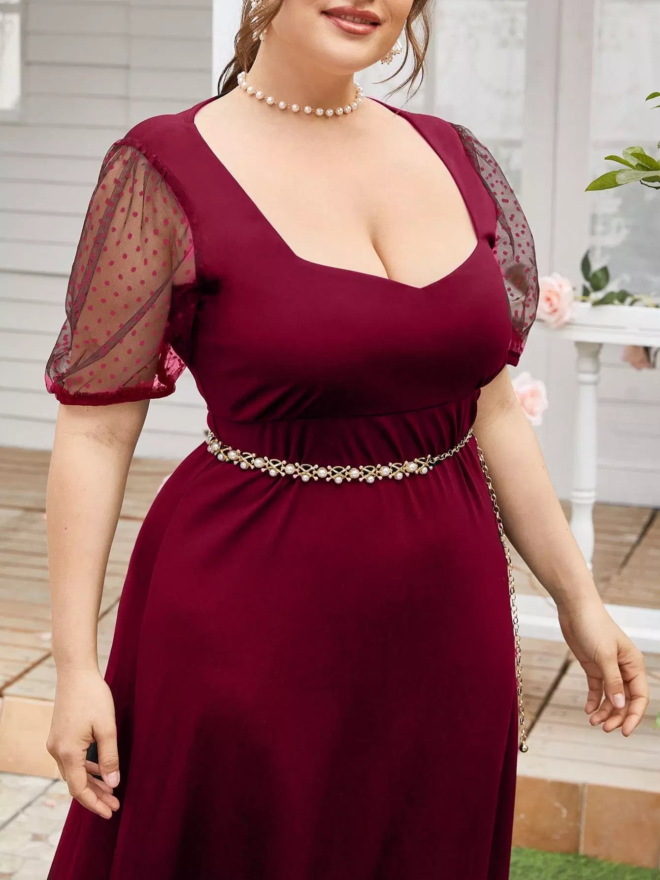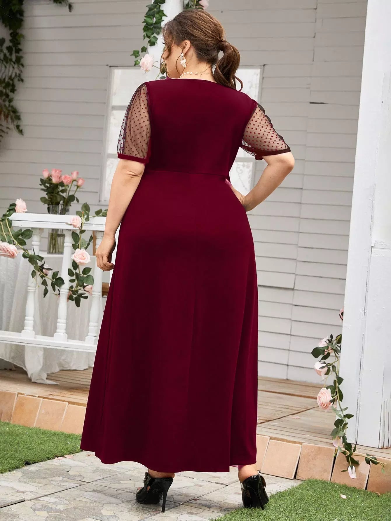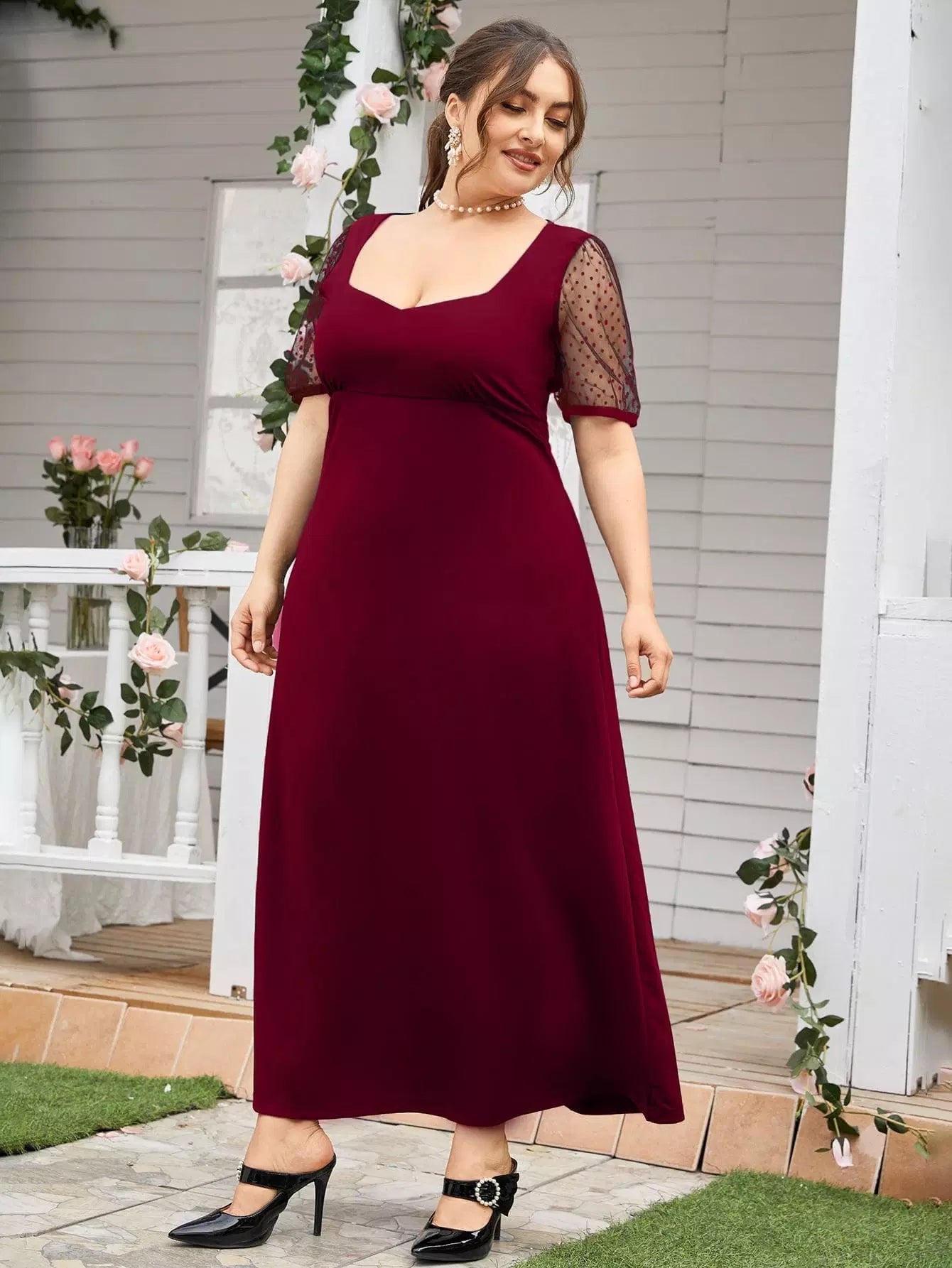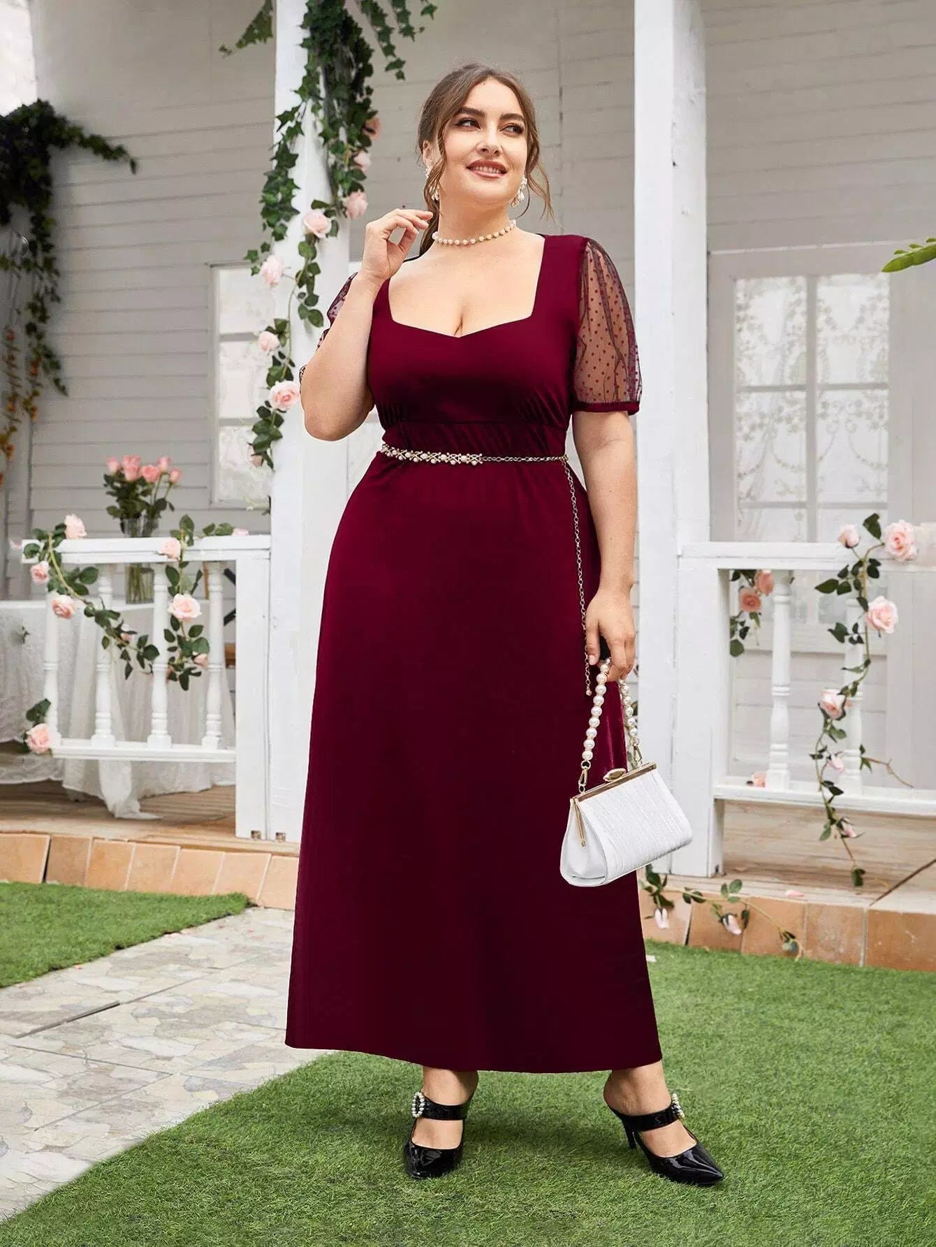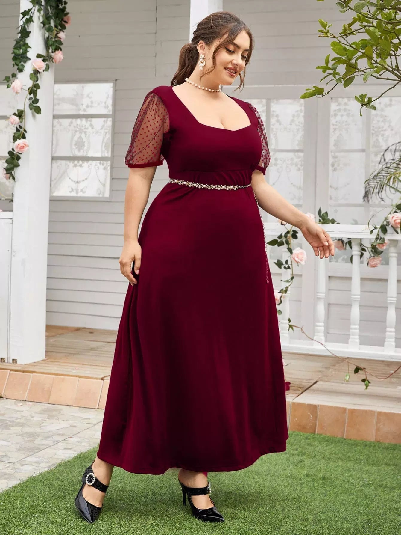 Plus Contrast Dobby Mesh Sleeve Sweetheart Neck Dress Without Belt