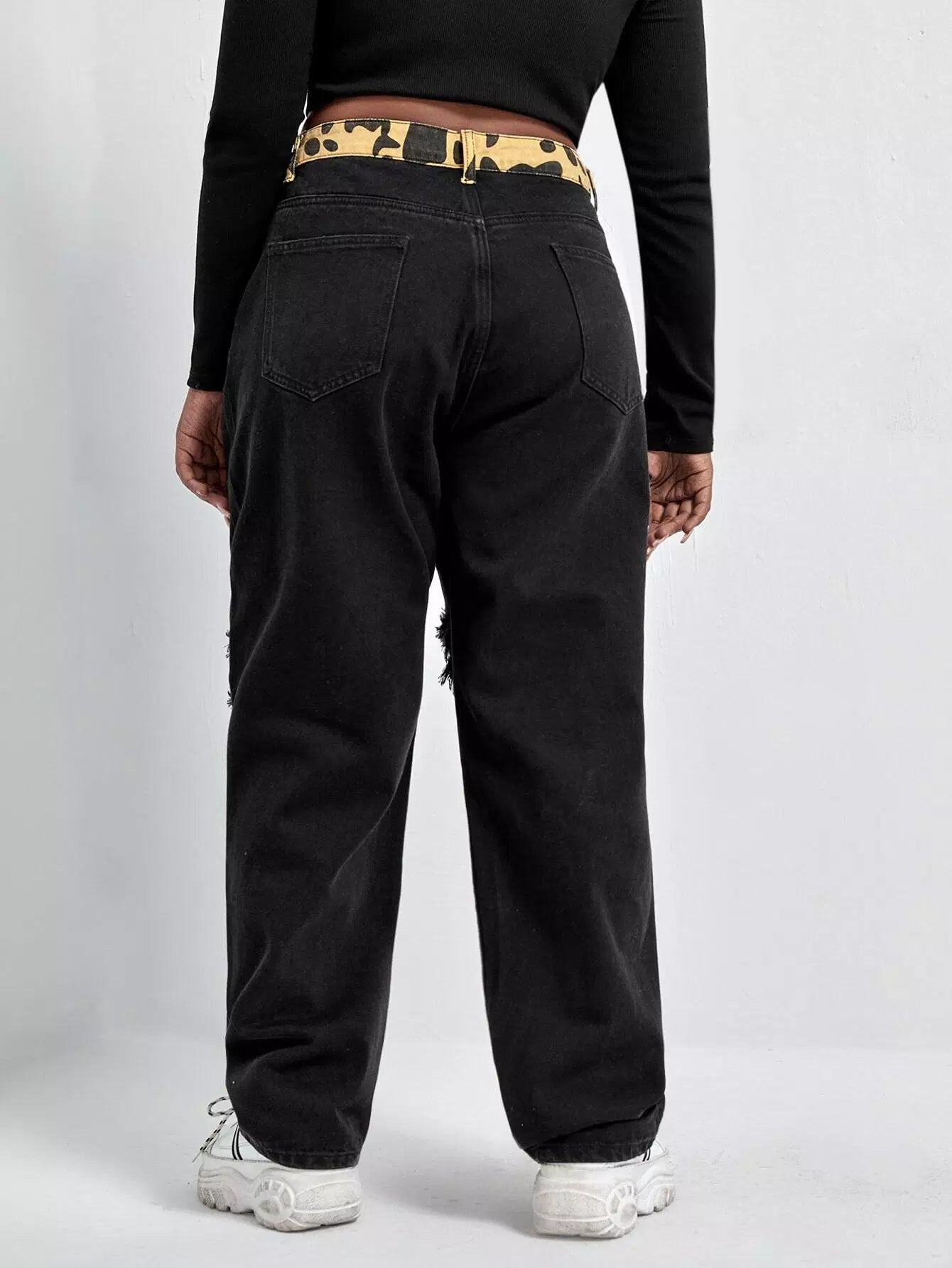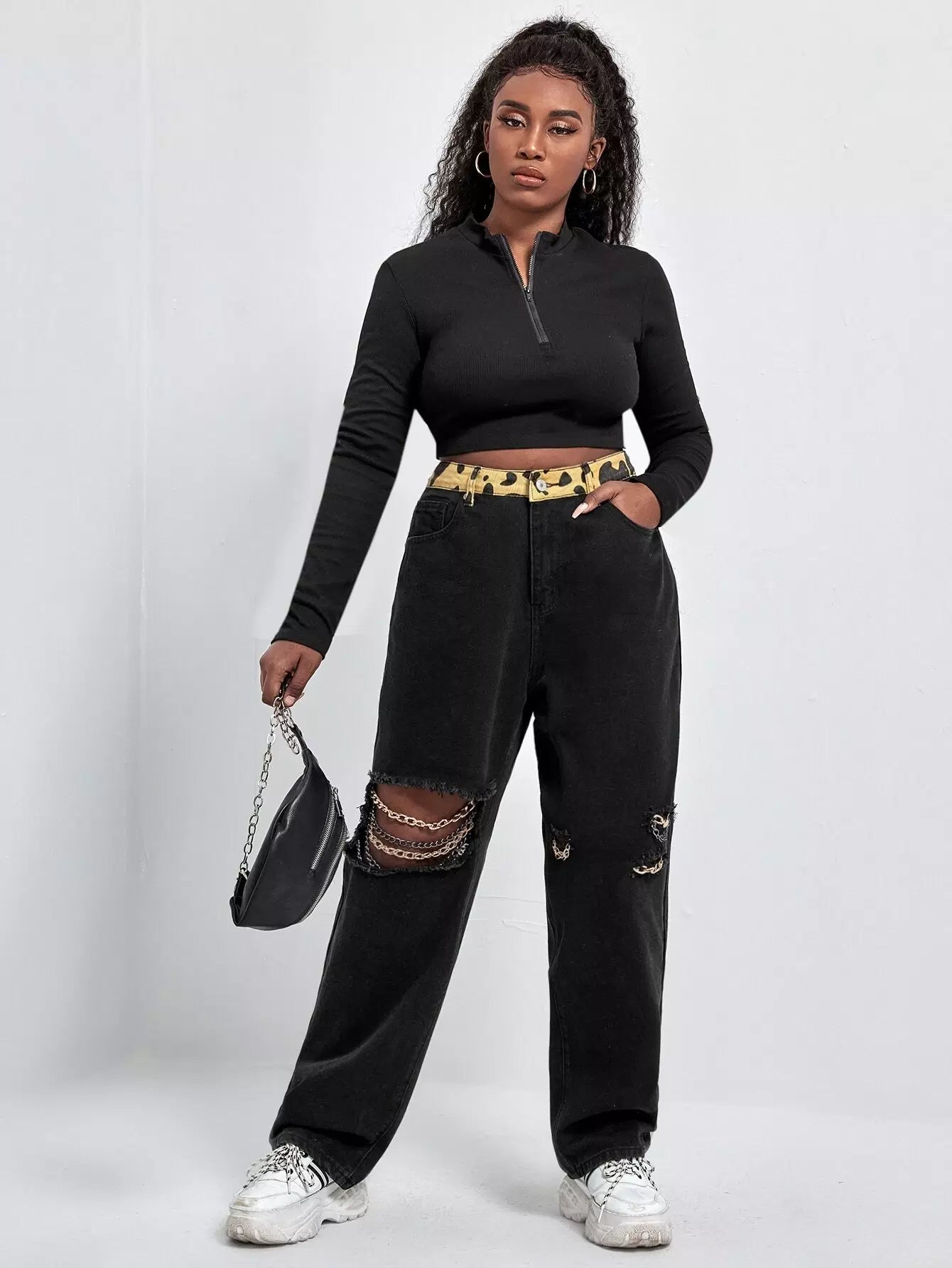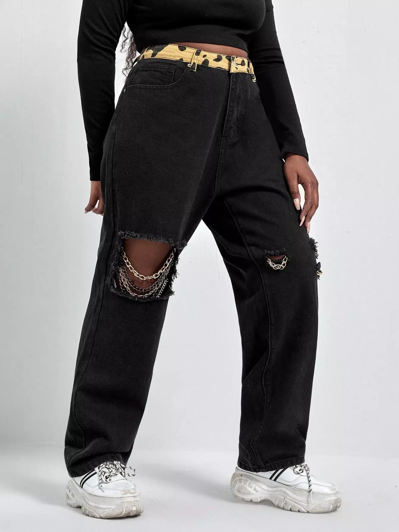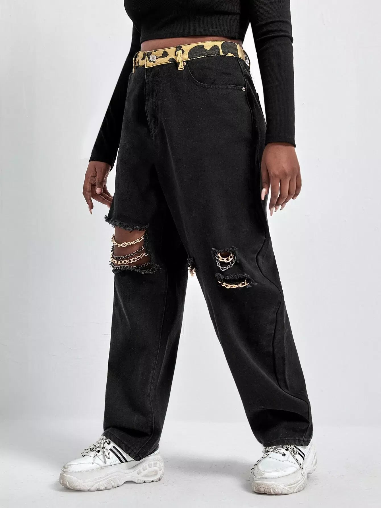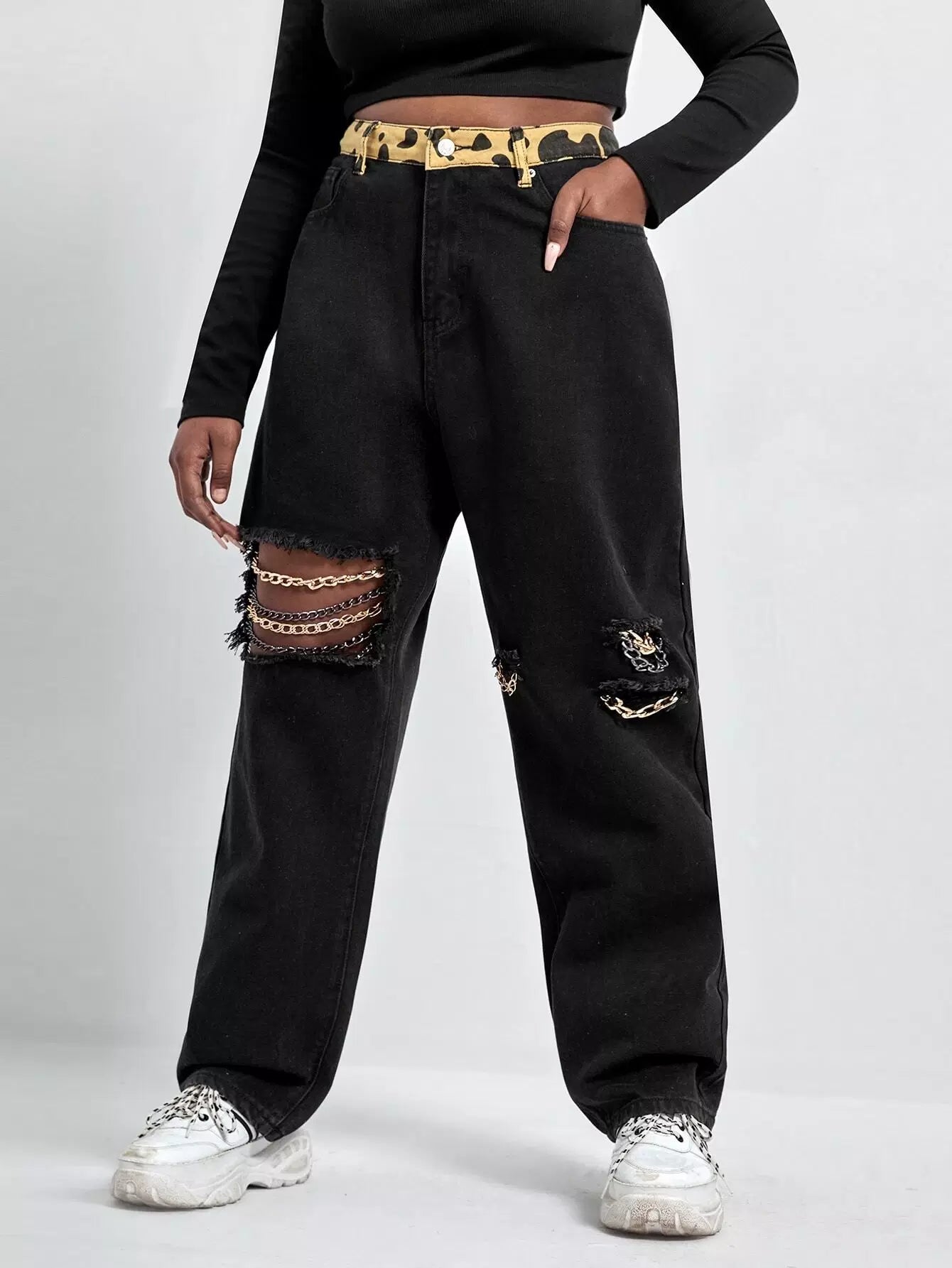 Plus Contrast Waistband Chain Detail Ripped Jeans