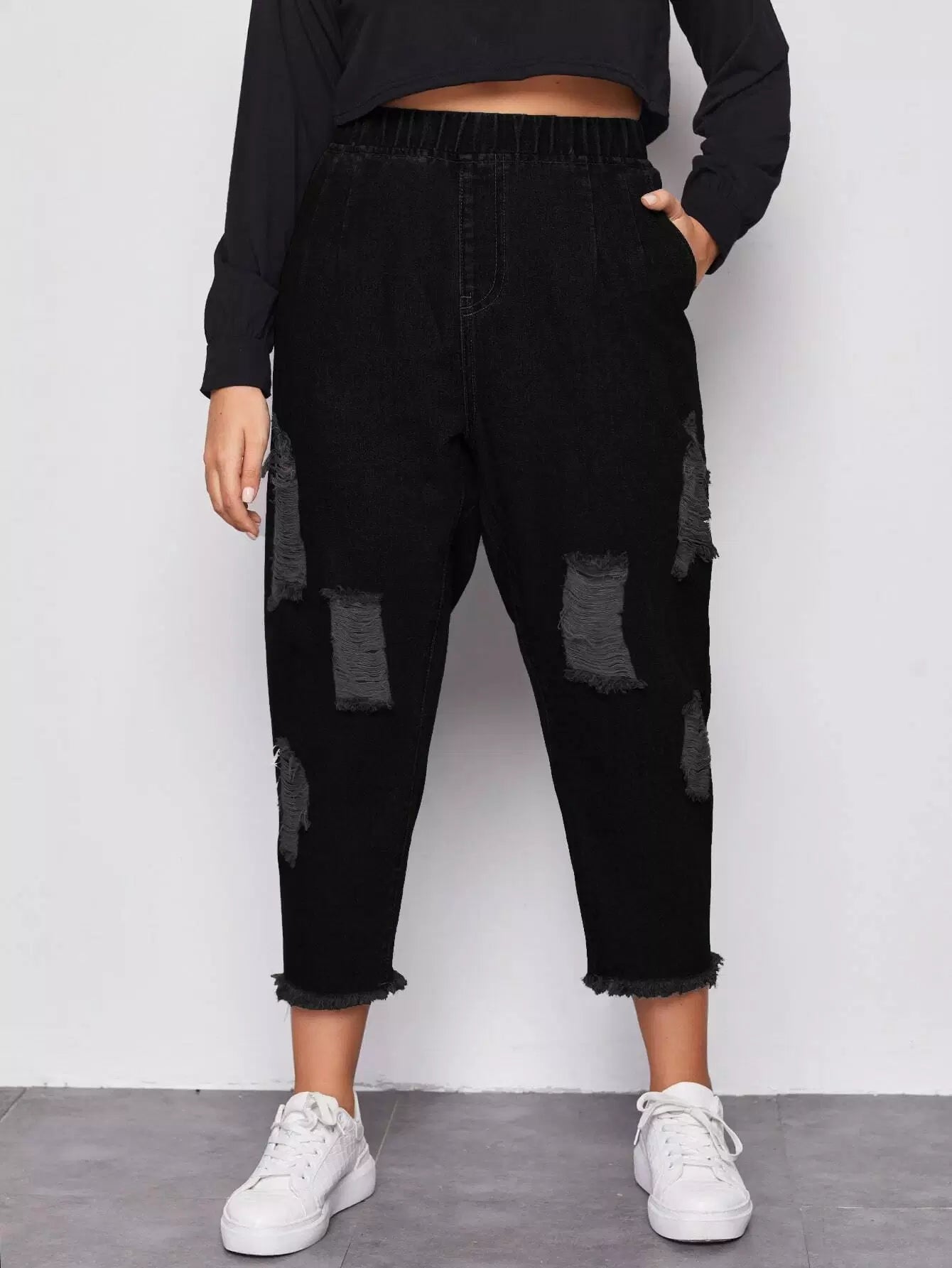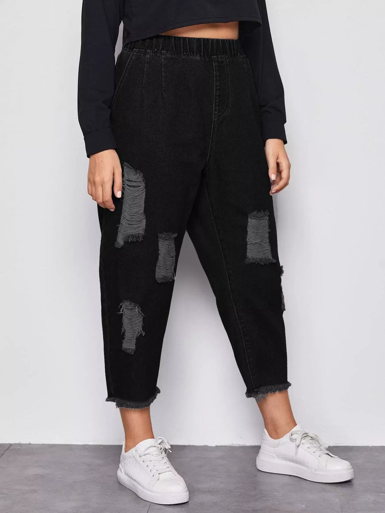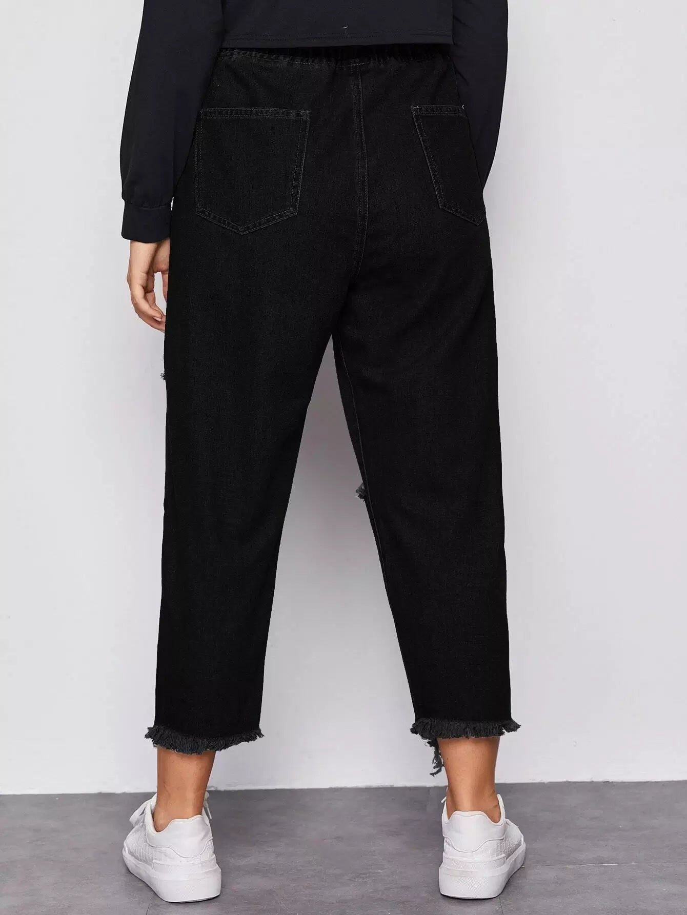 Plus Elastic Waist Ripped Raw Hem Cropped Baggy Jeans