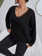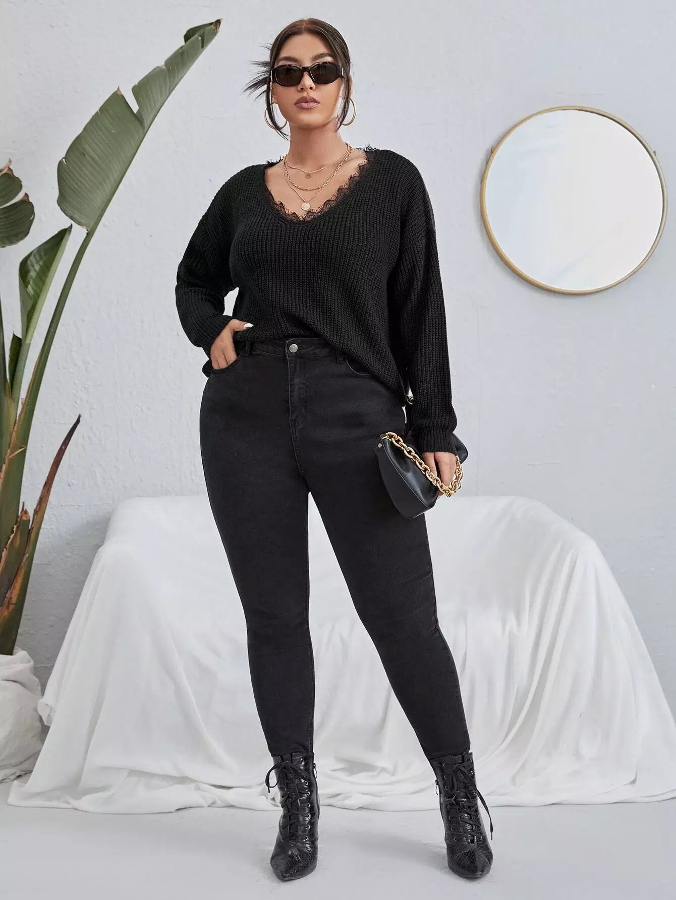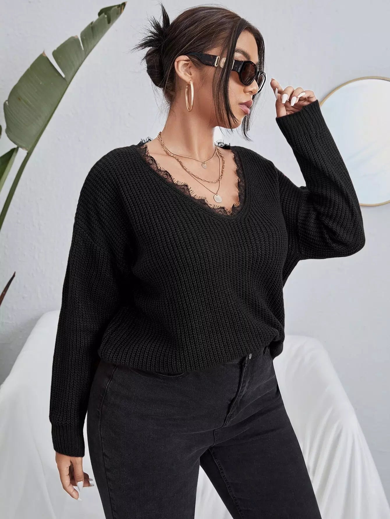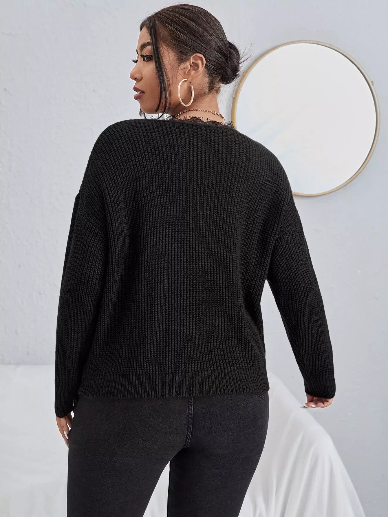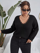 Plus Eyelash Lace Trim Drop Shoulder Ribbed Knit Sweater