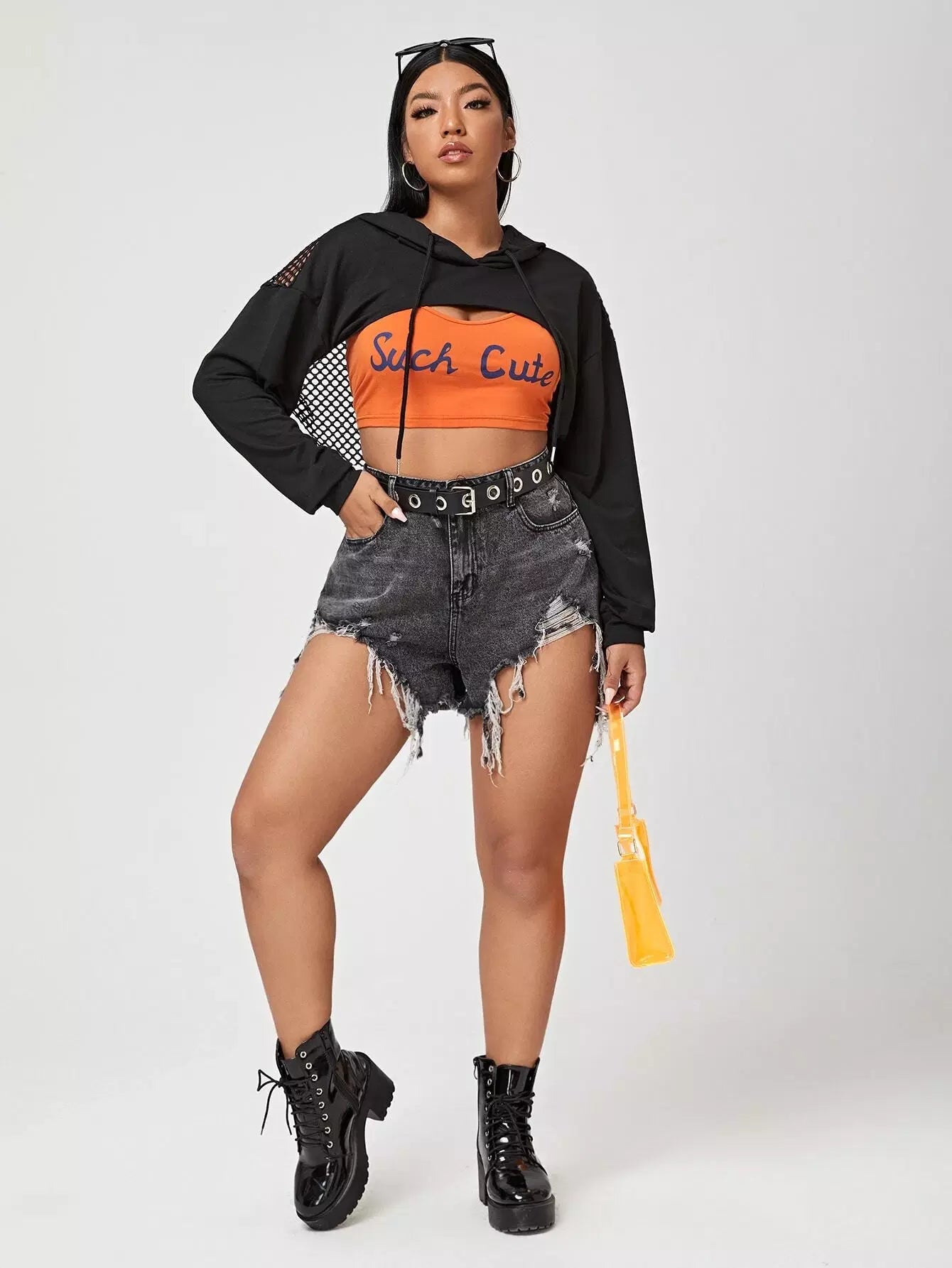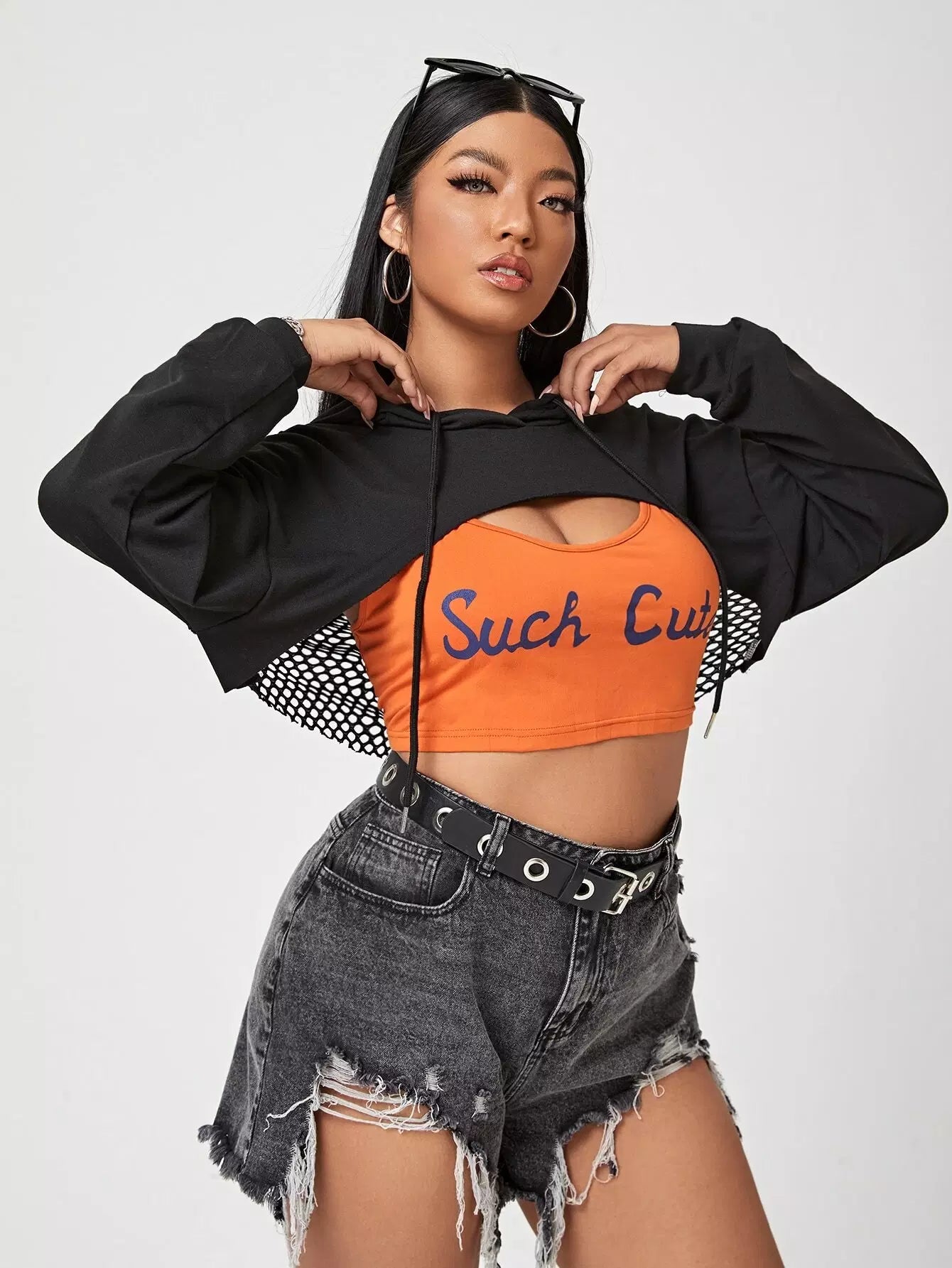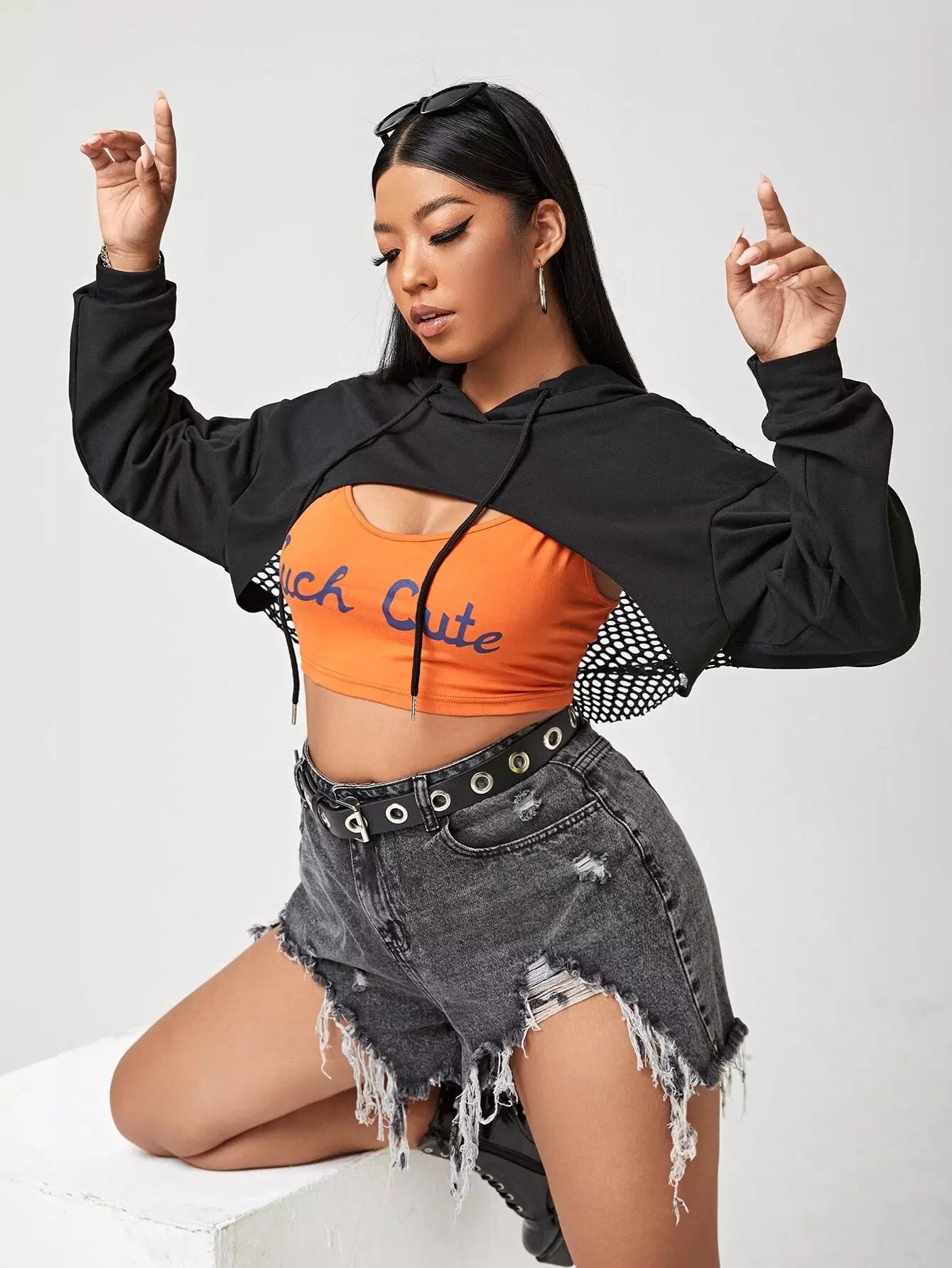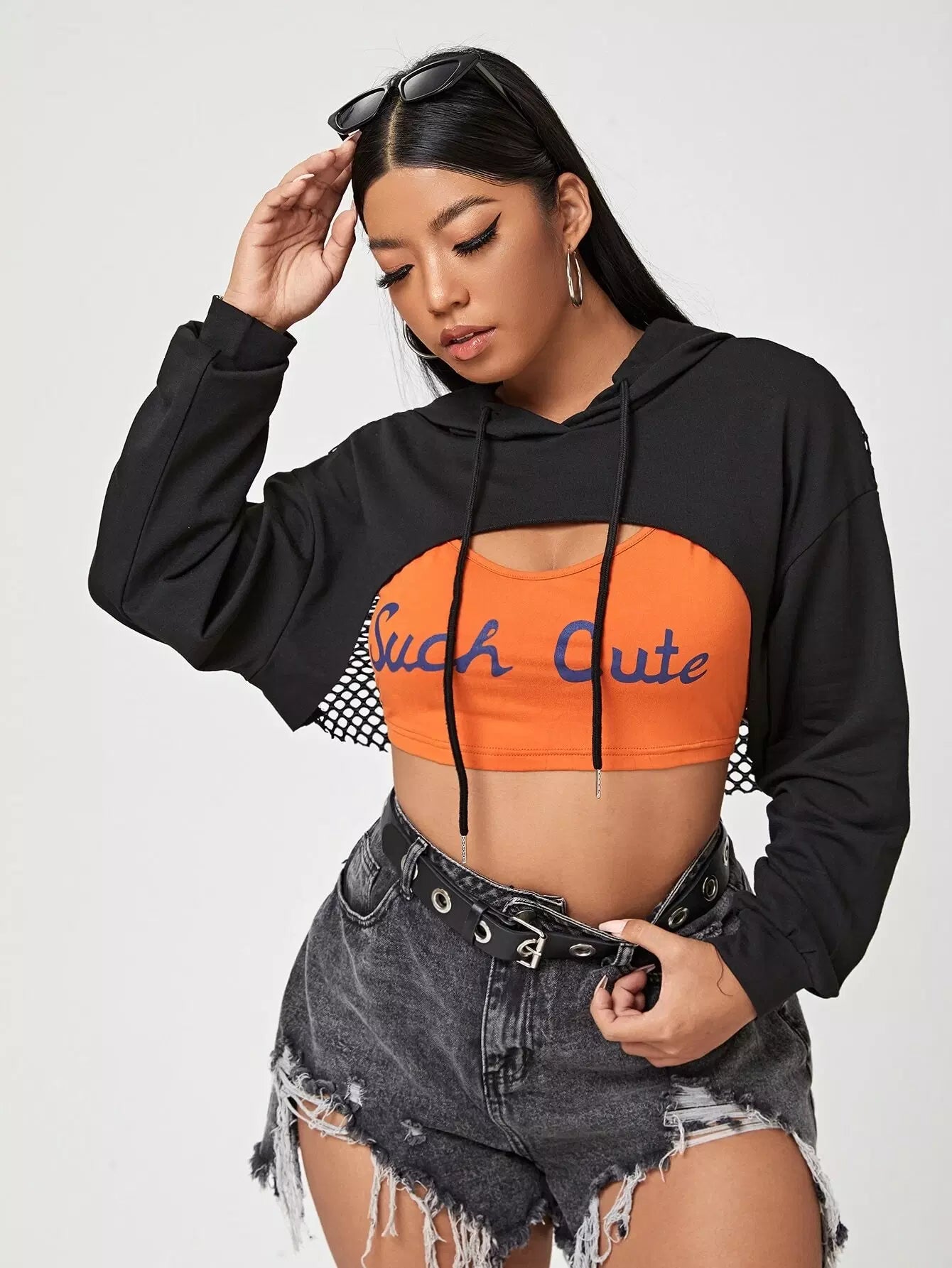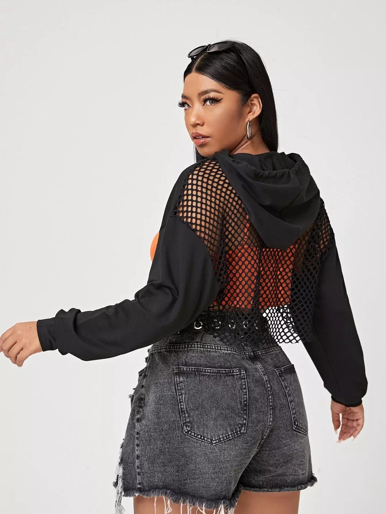 Plus Fish Net Back Drawstring Oversized Super Crop Hoodie