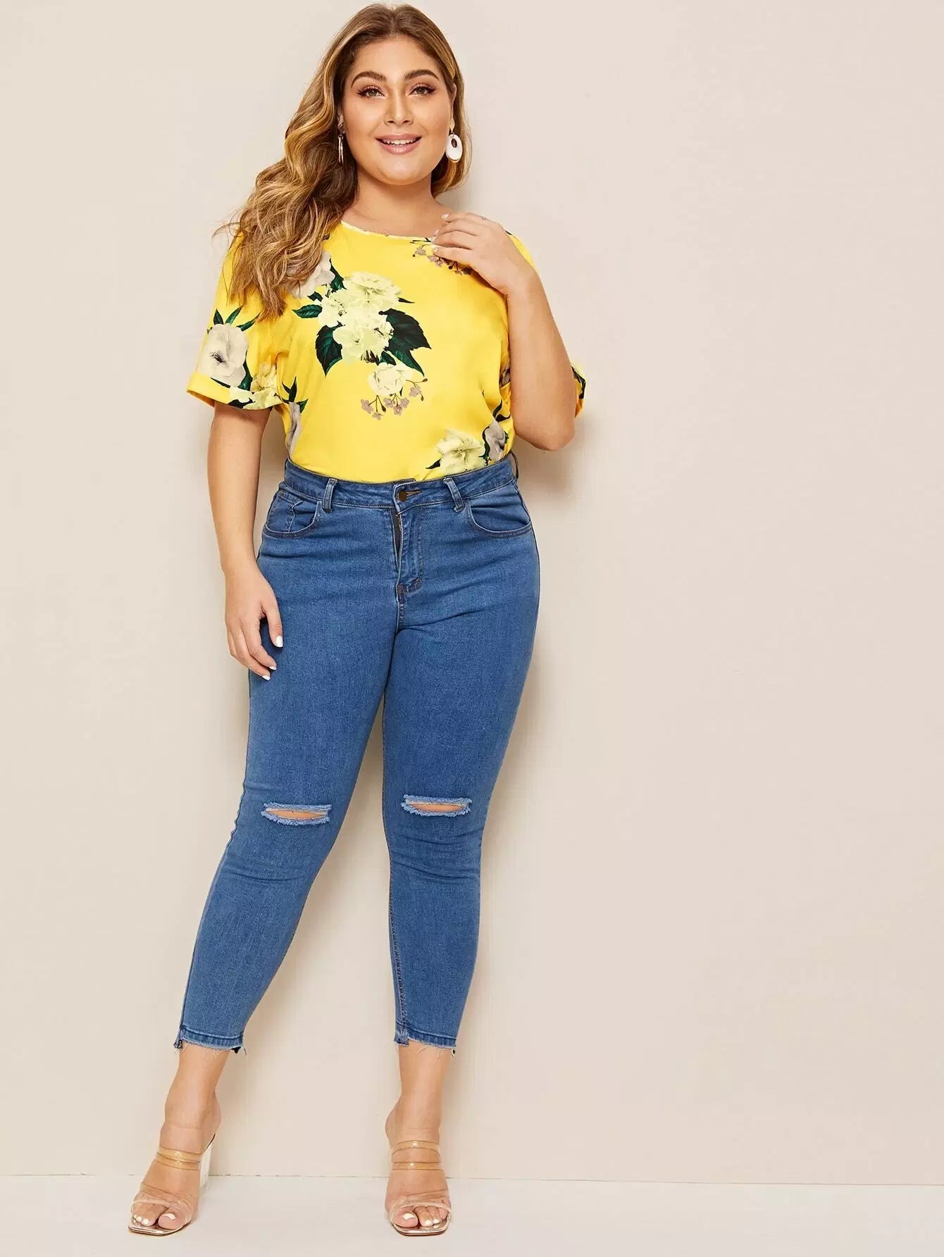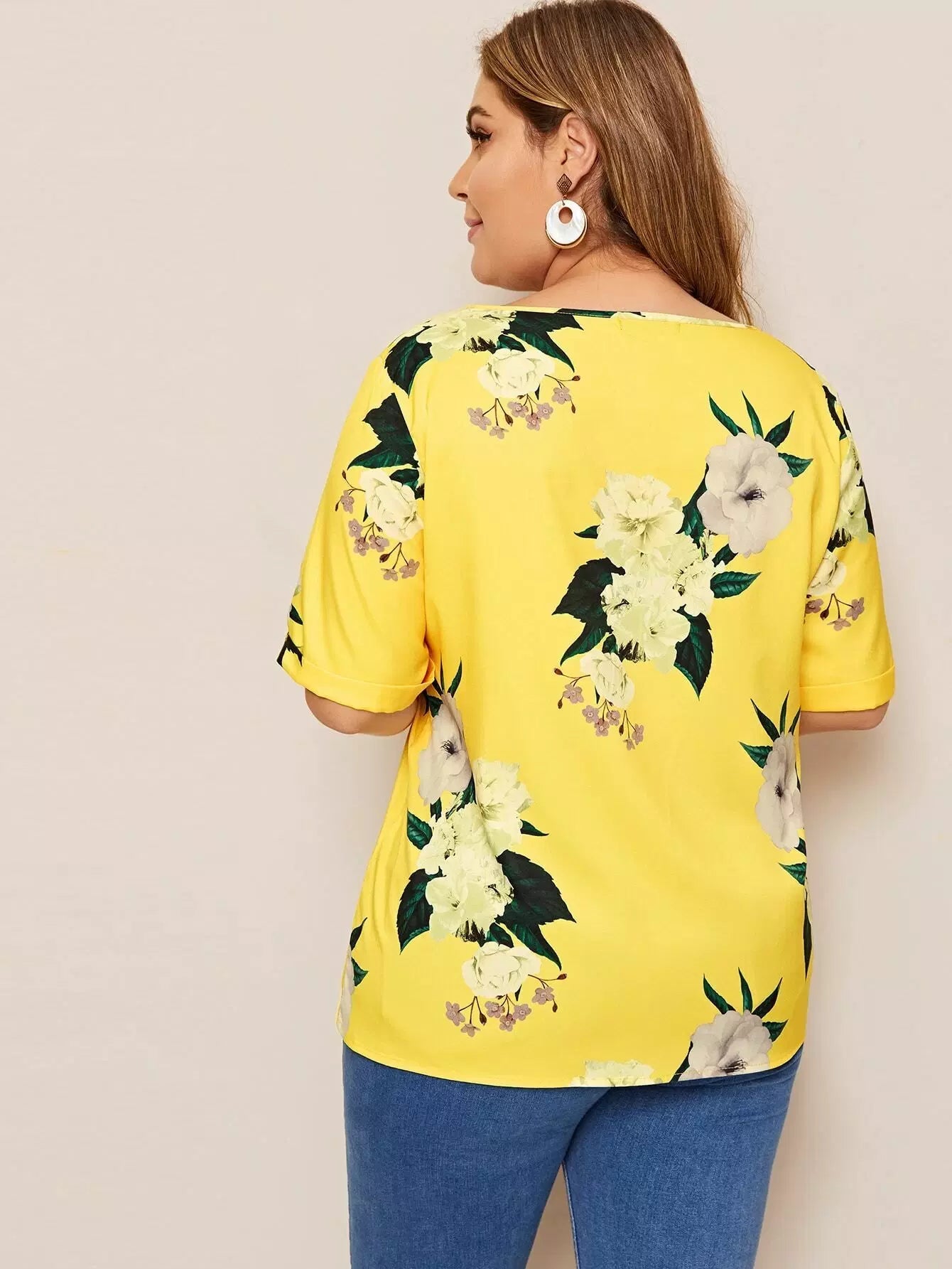 Plus Floral Print Cuffed Sleeve Top