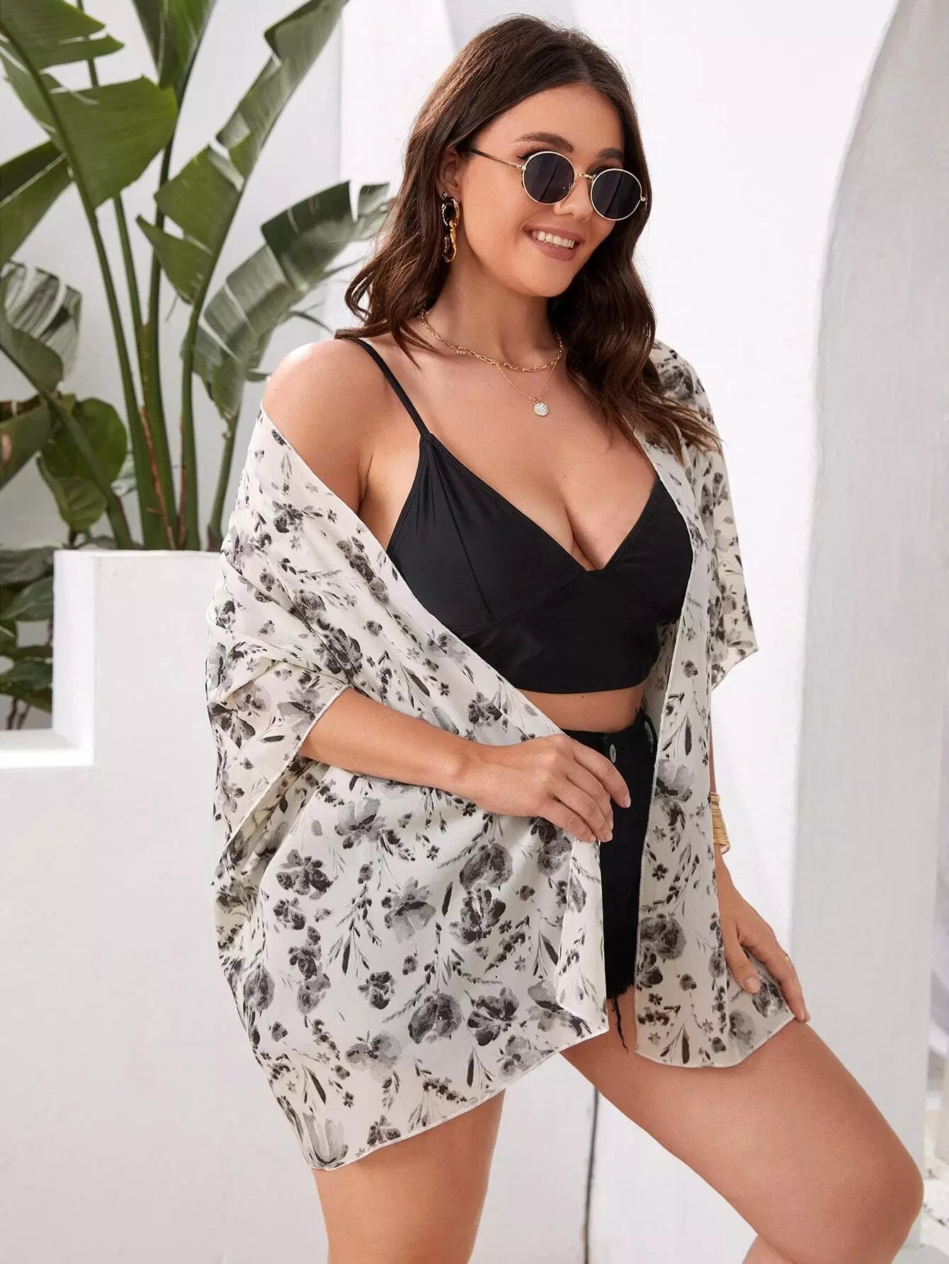 Plus Floral Print Open Front Kimono
