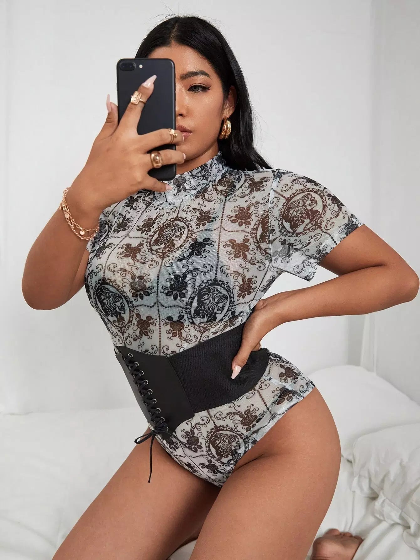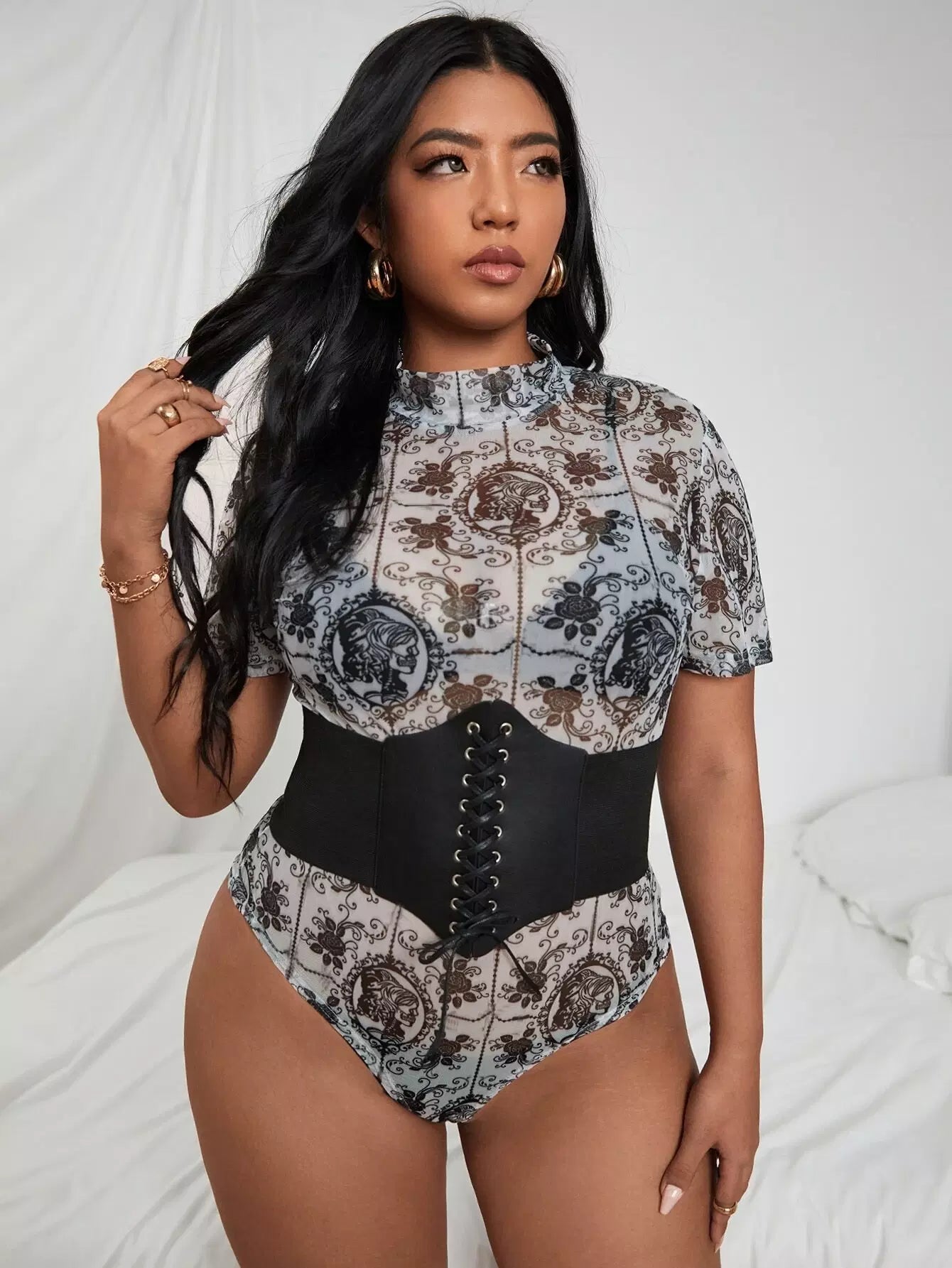 Plus Floral Print Sheer Bodysuit With Lace Up Corset