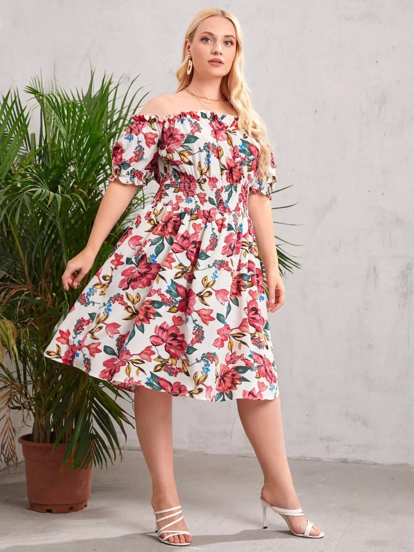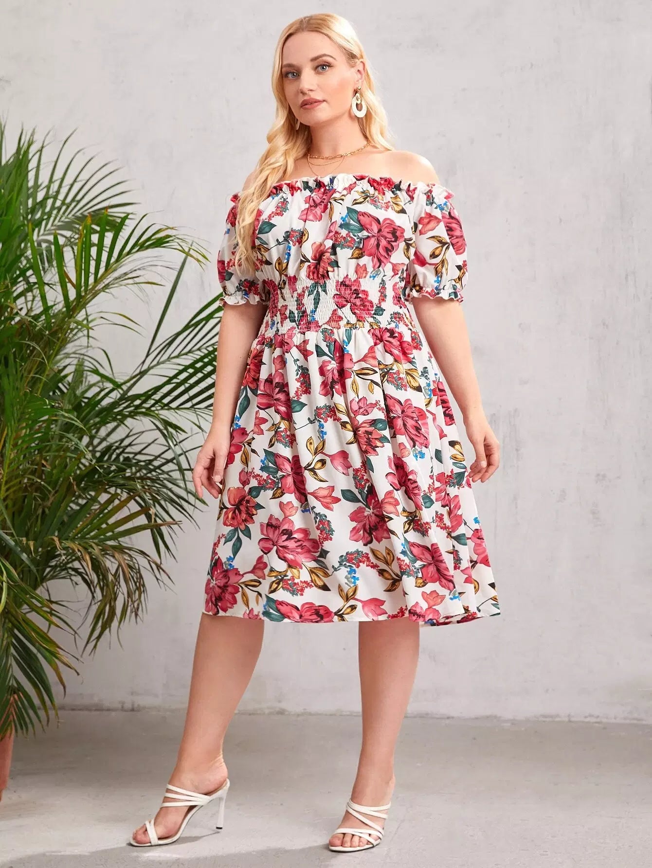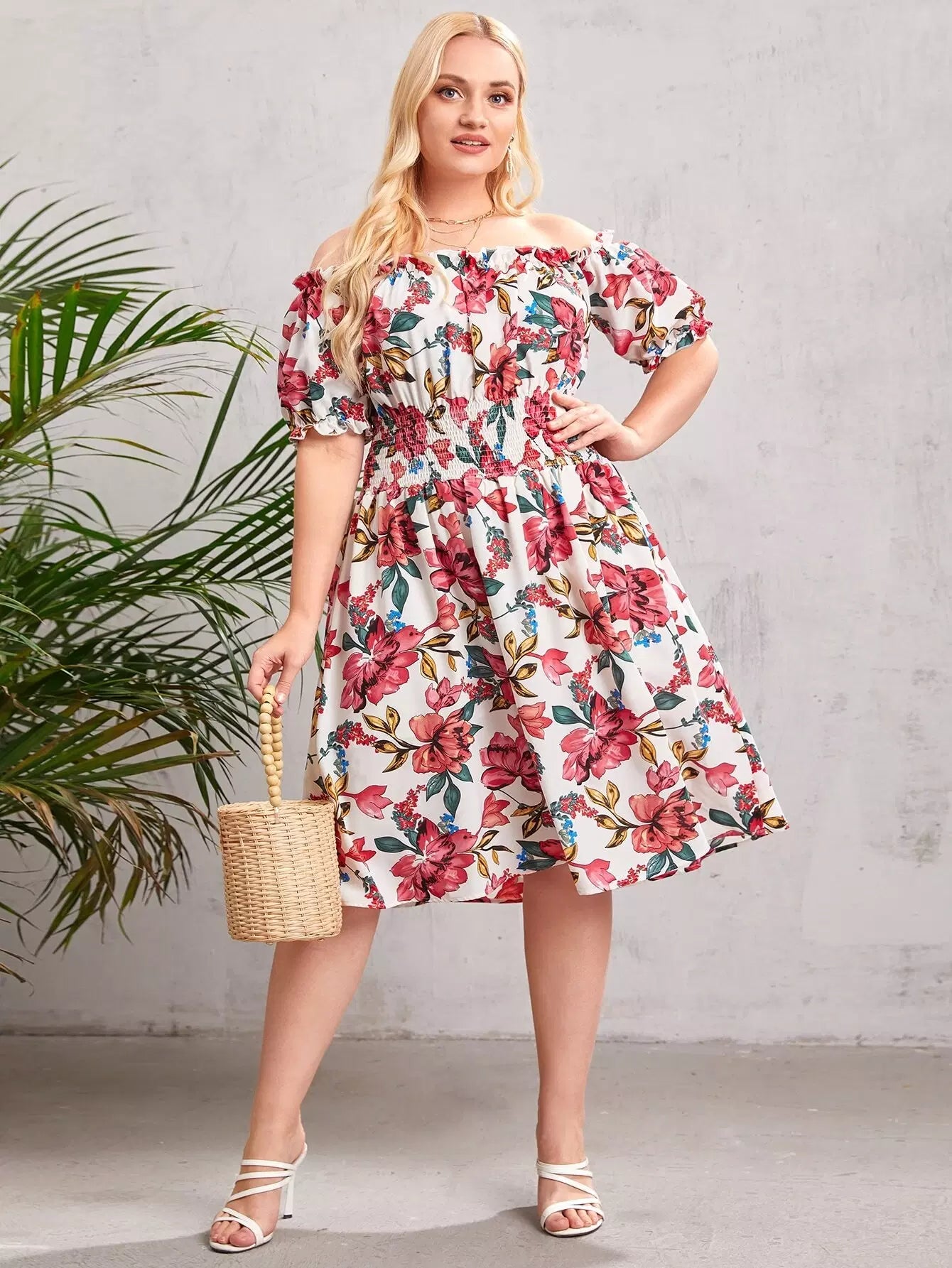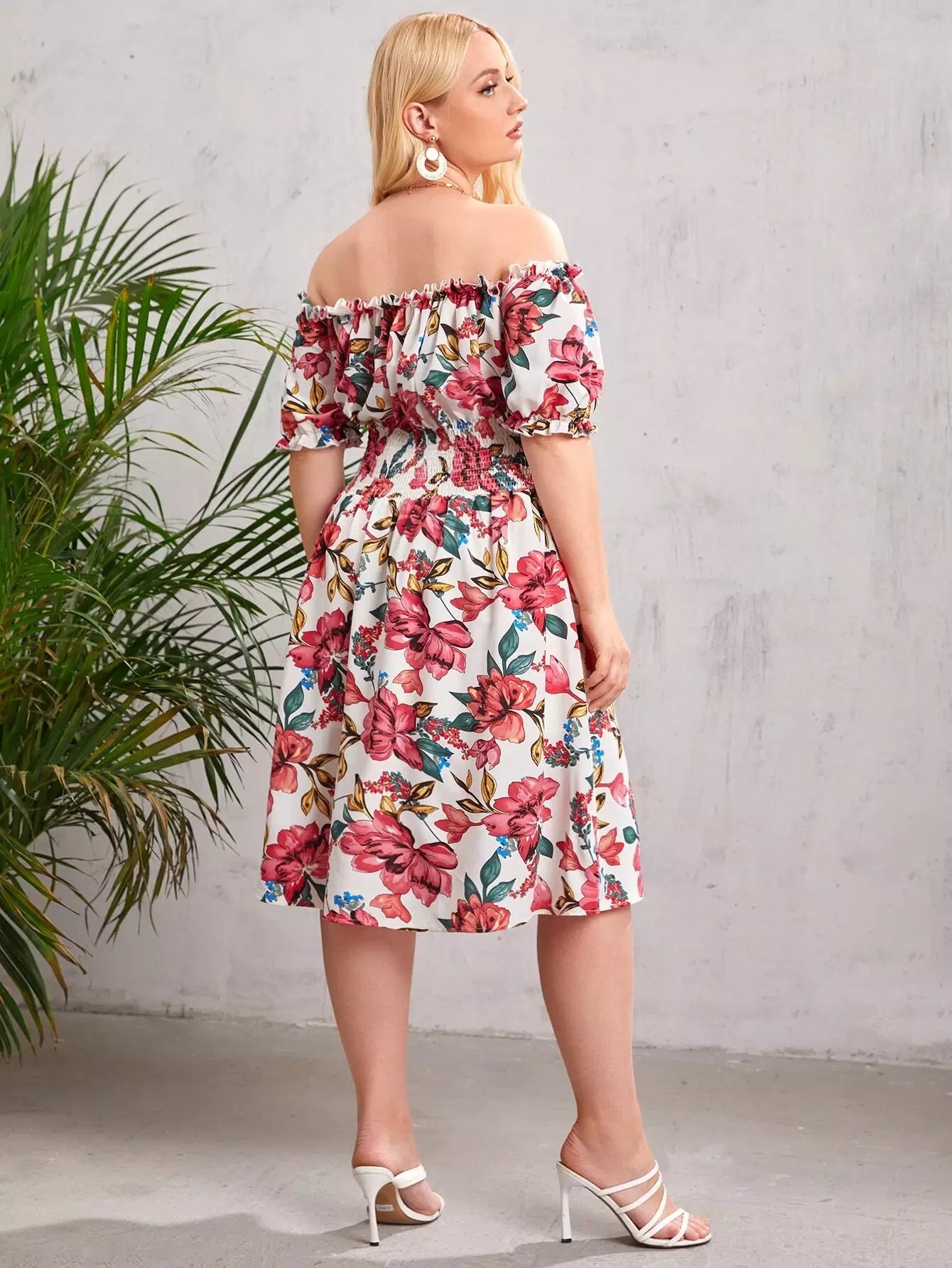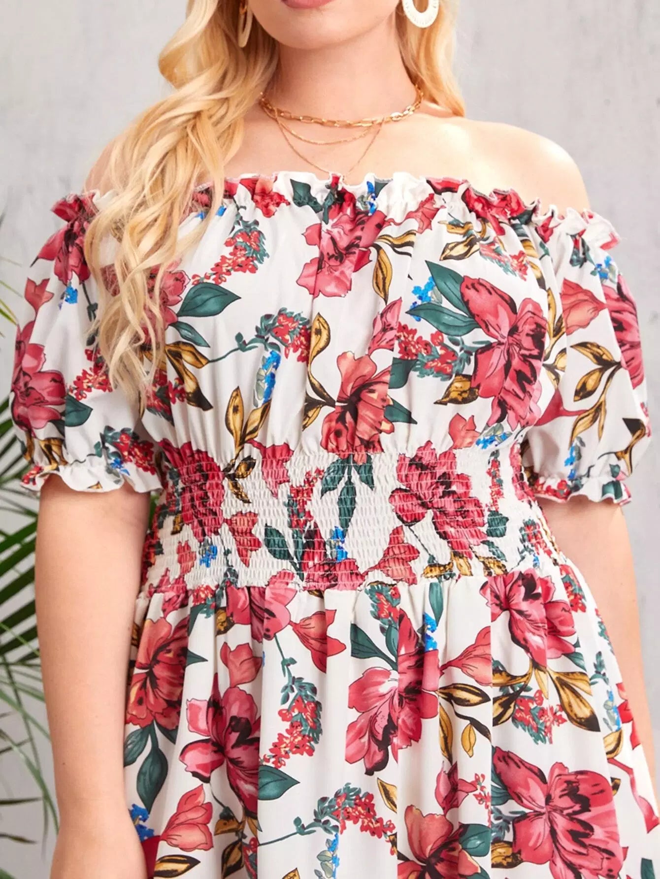 Plus Floral Print Shirred Waist Bardot A-line Dress