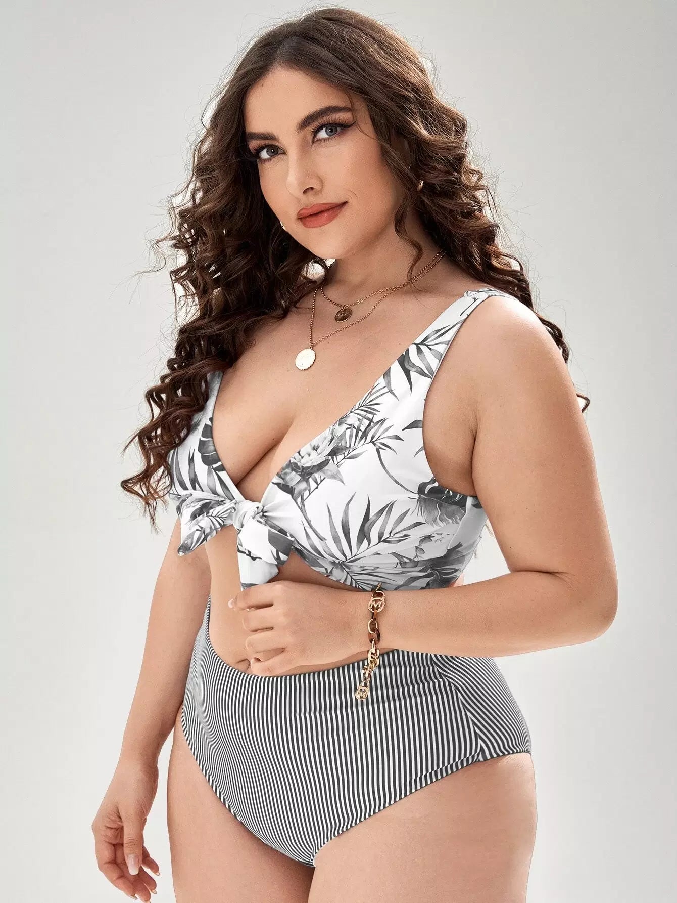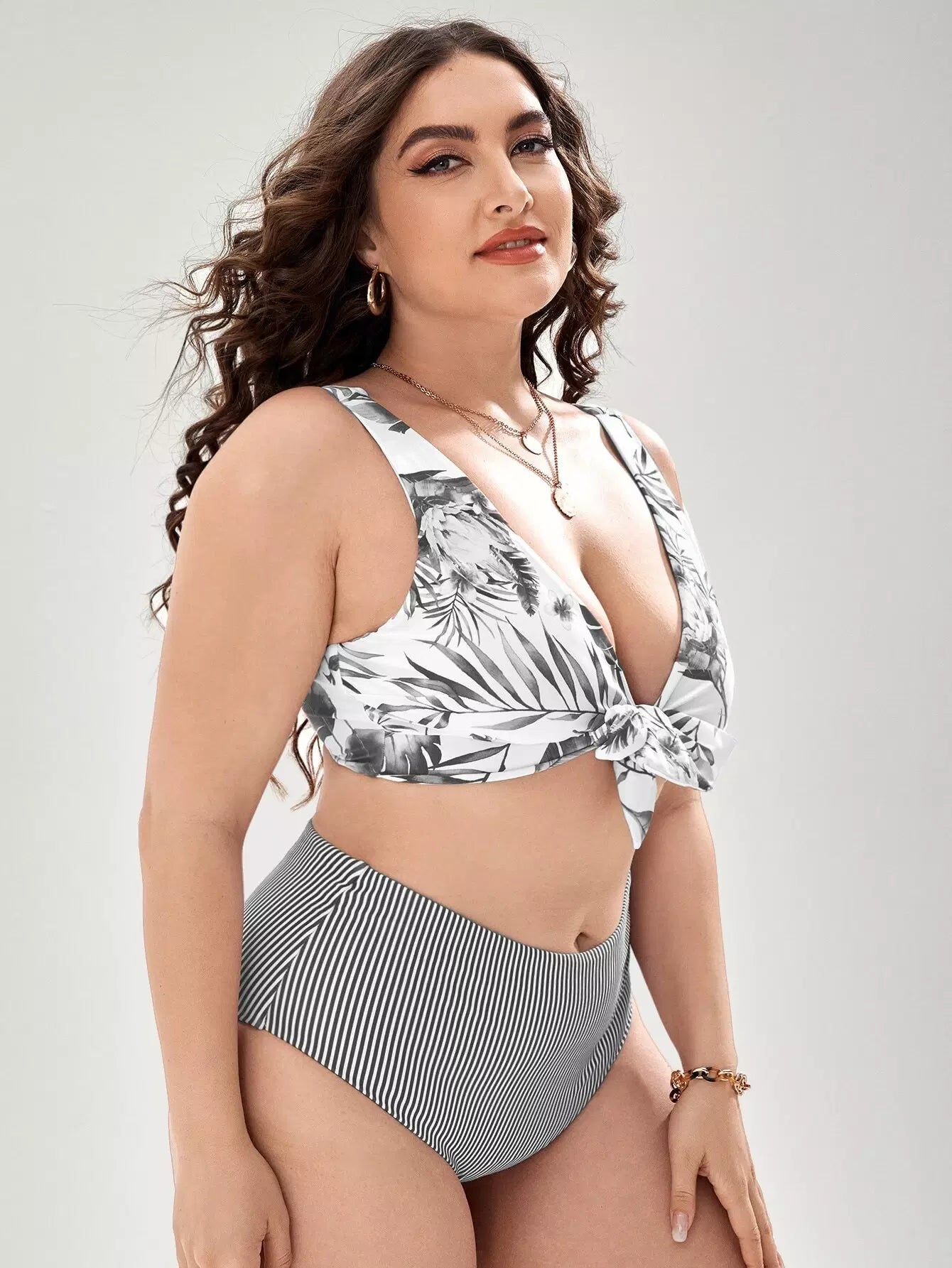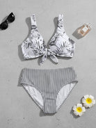 Plus Floral & Striped Knot Front Bikini Swimsuit