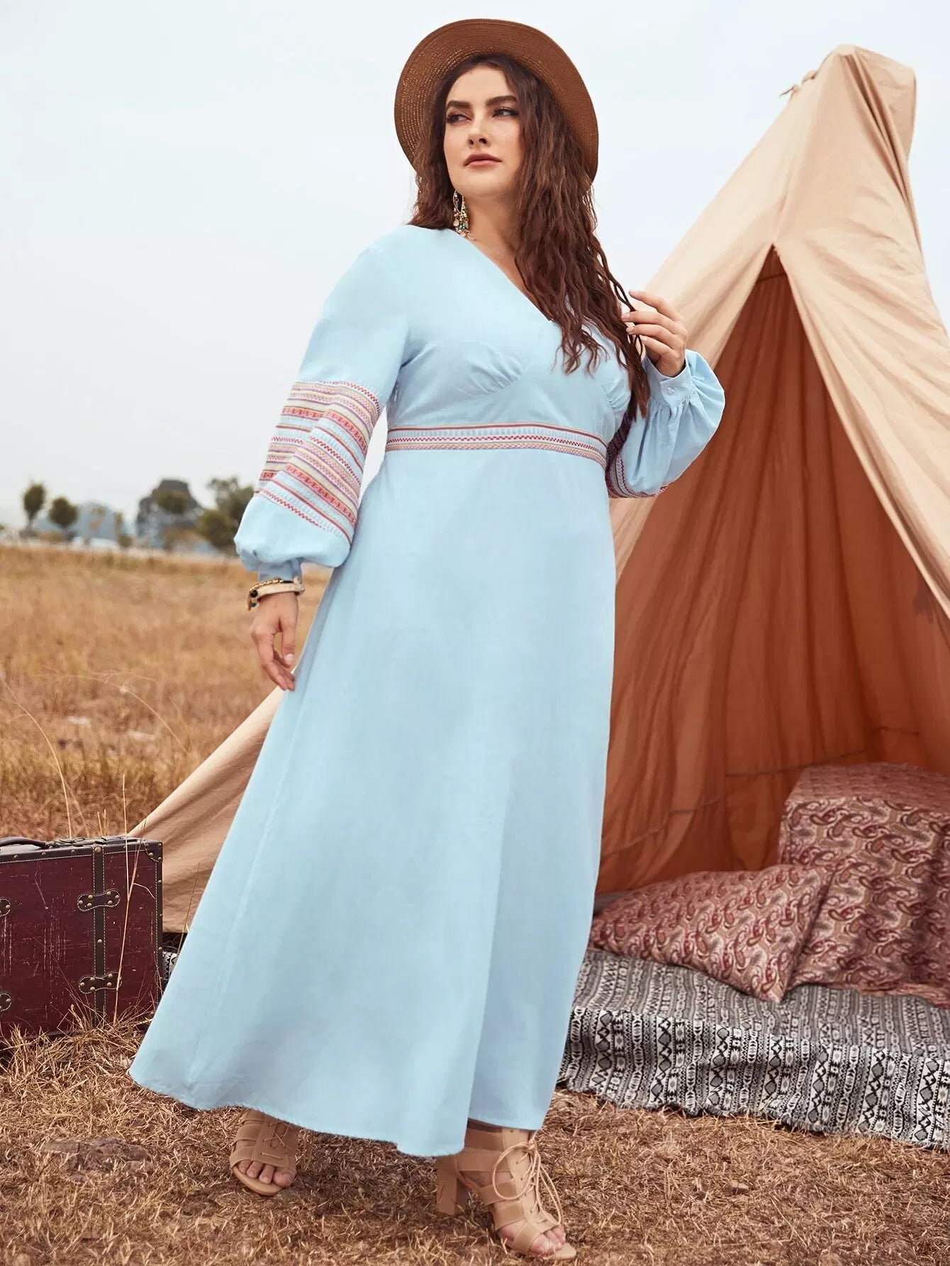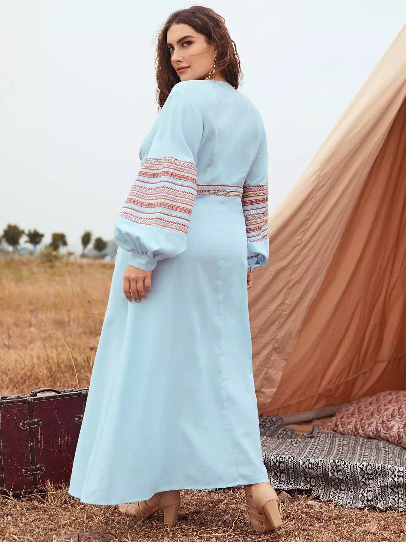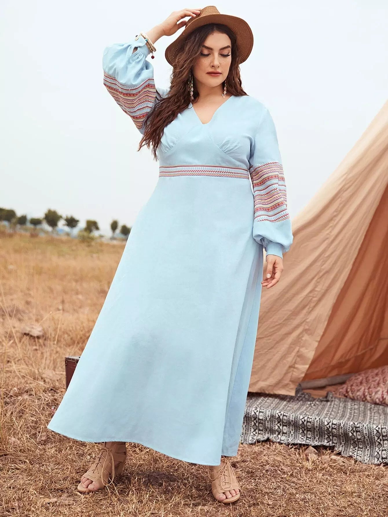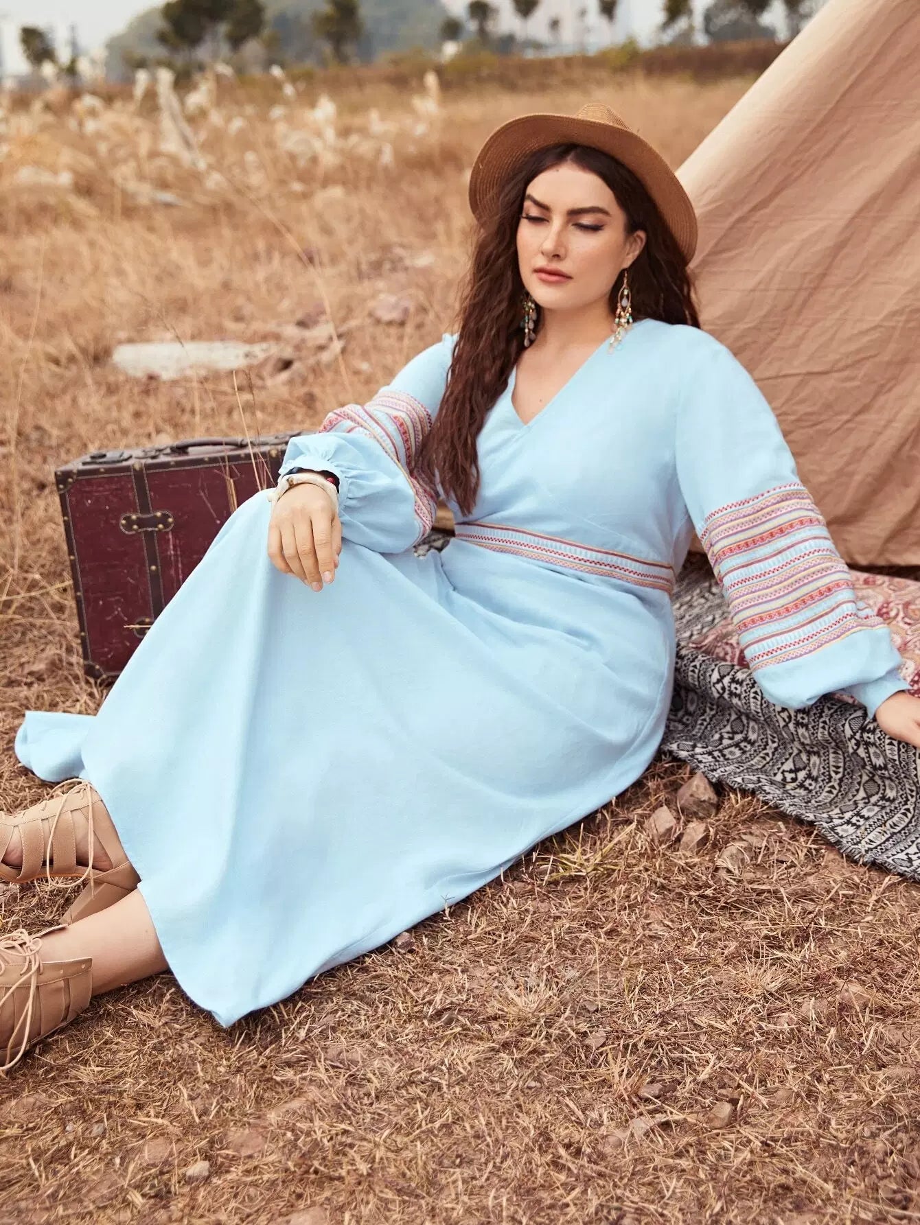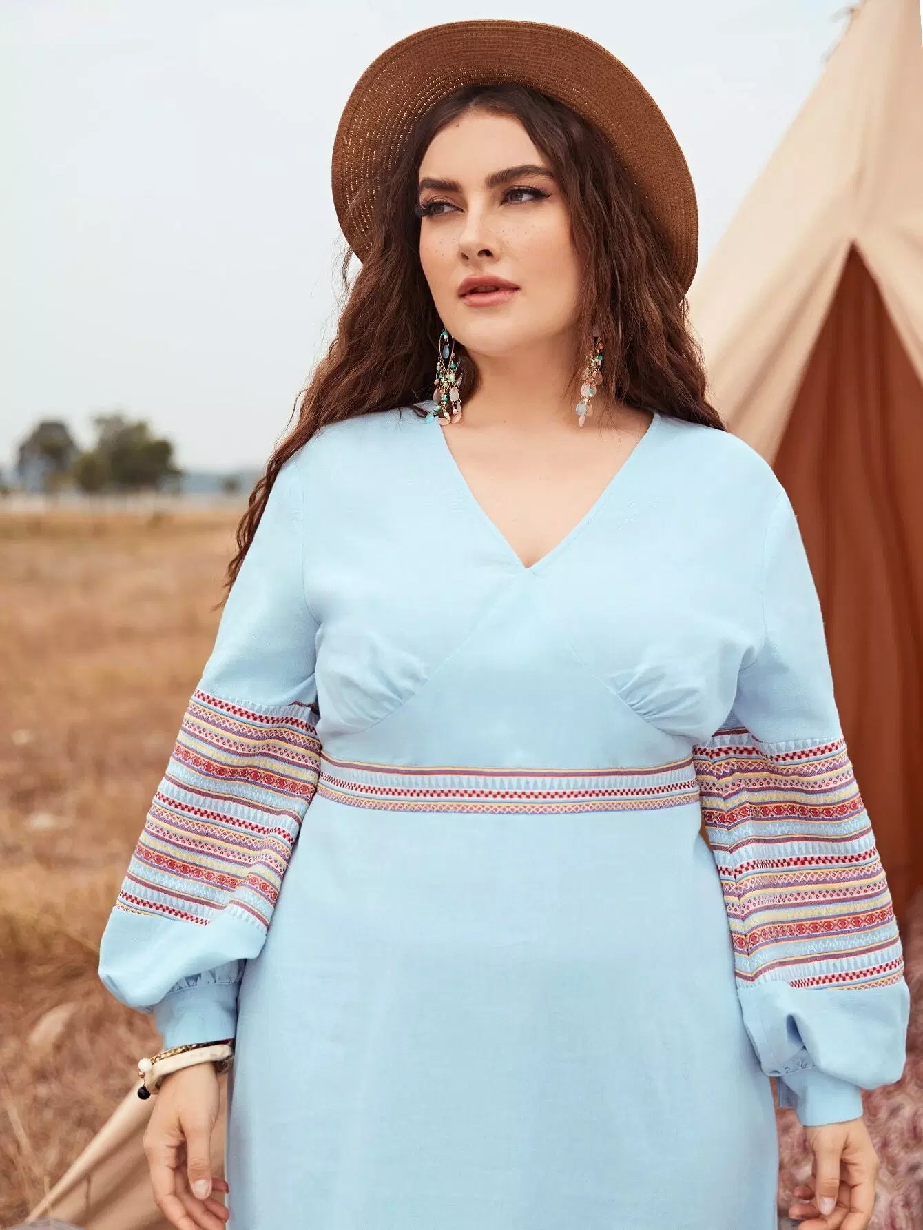 Plus Geo Print Ruched Bust Bishop Sleeve Dress