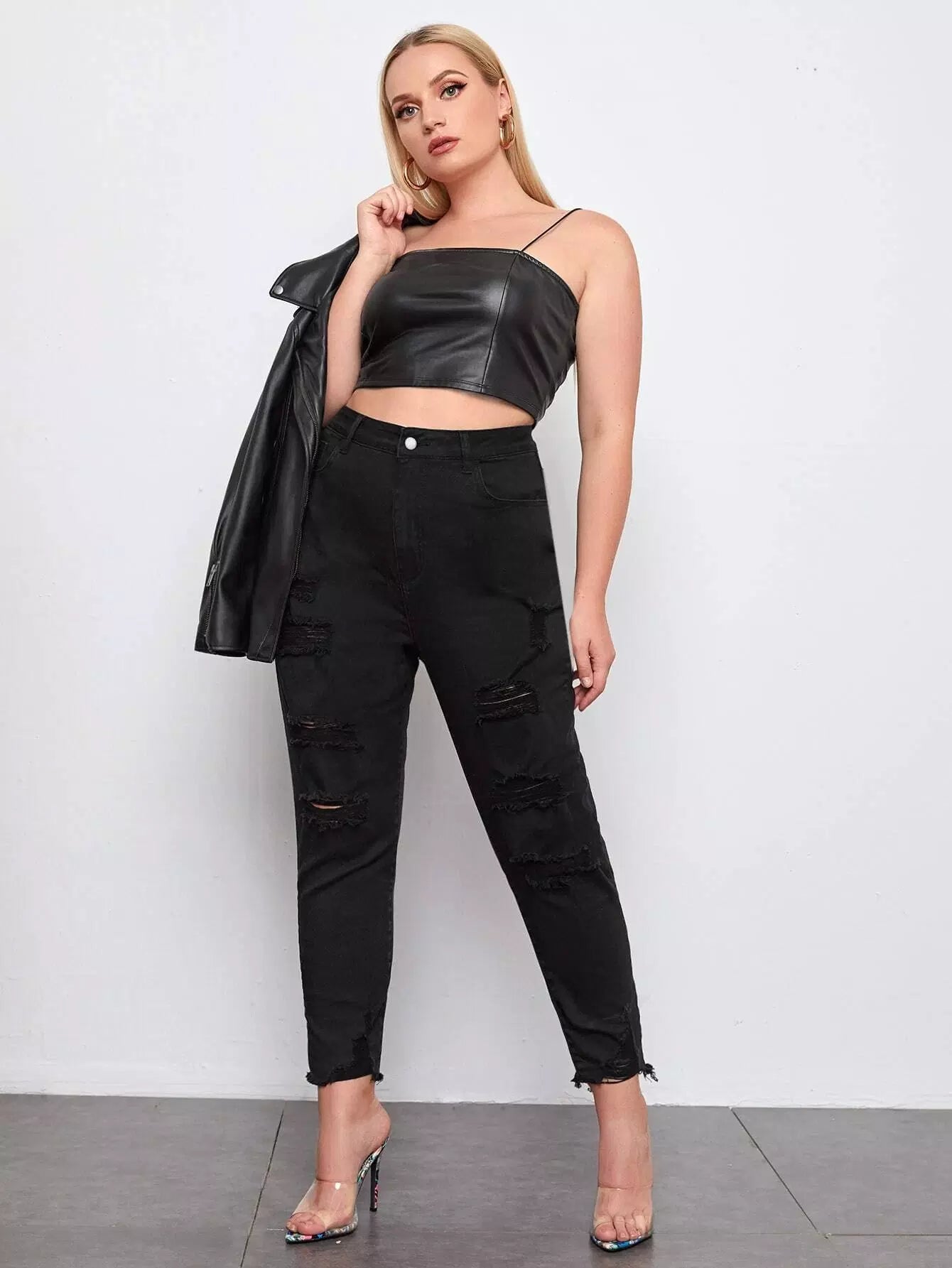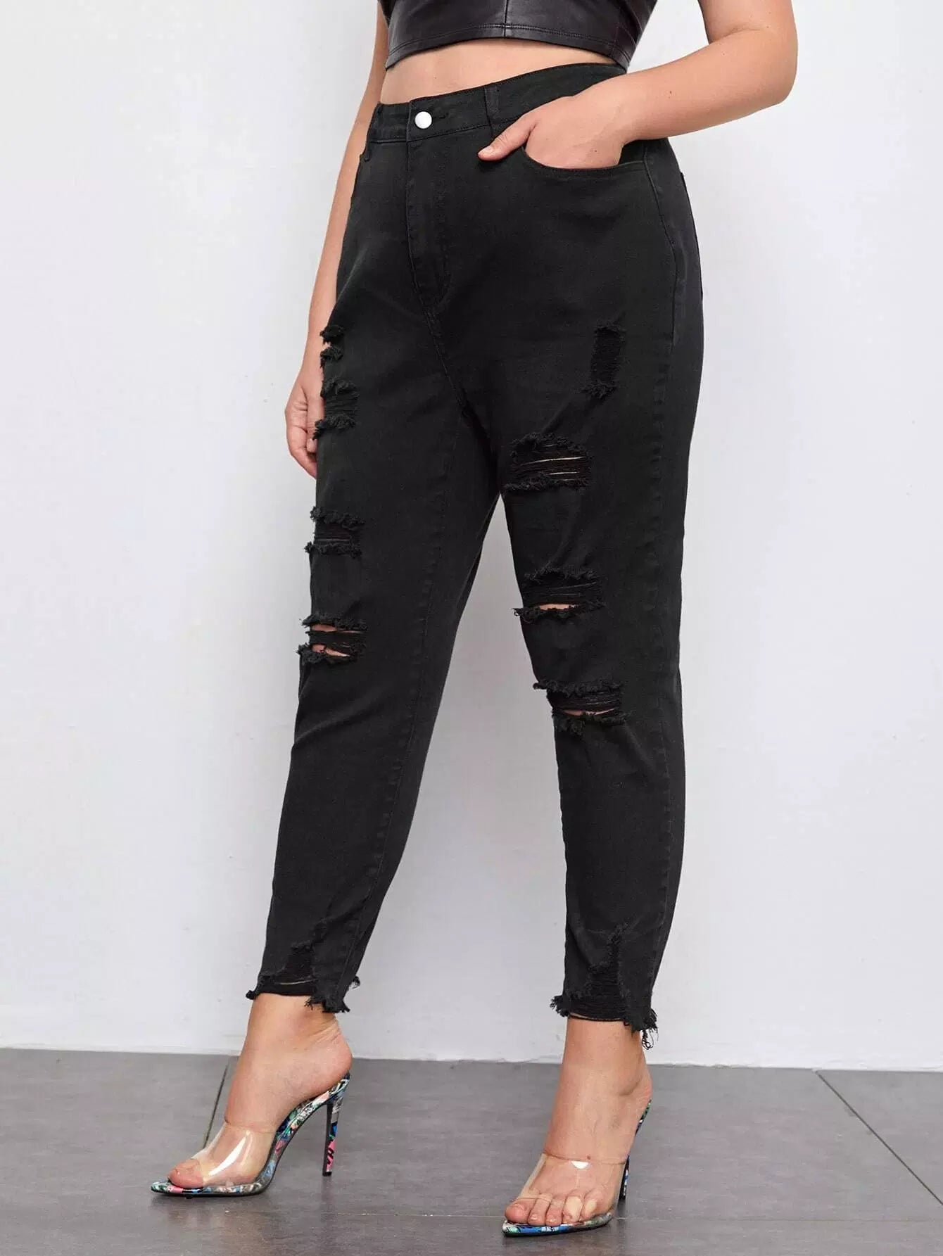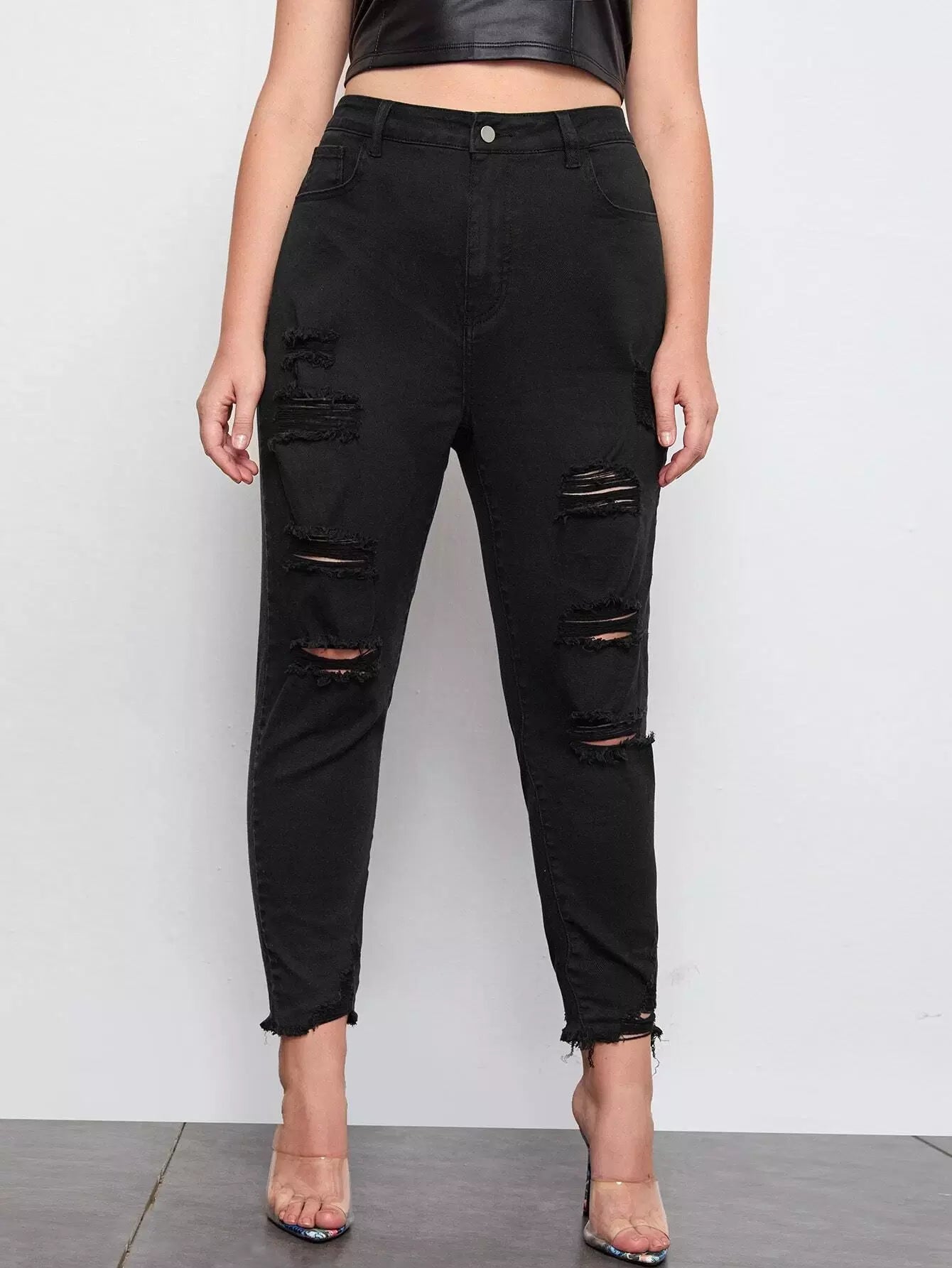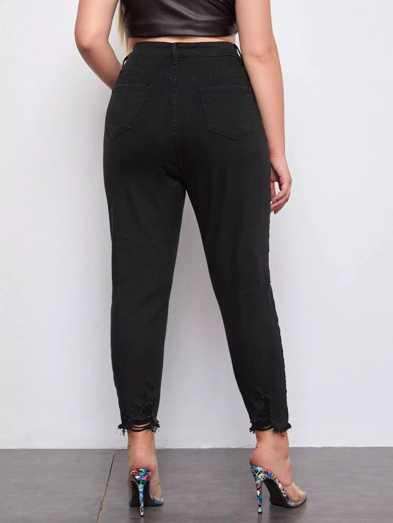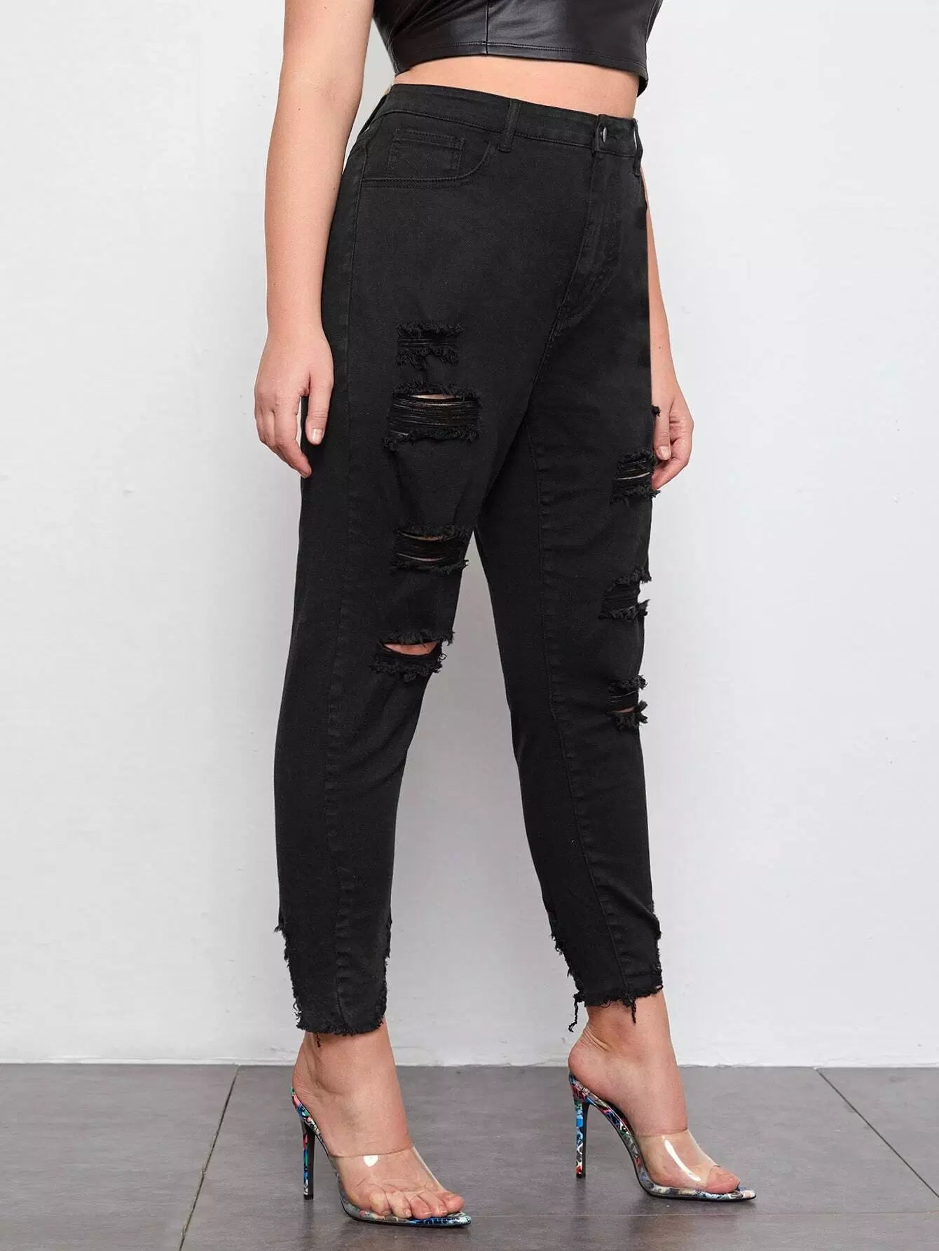 Plus High Waist Ripped Raw Hem Mom Cropped Jeans