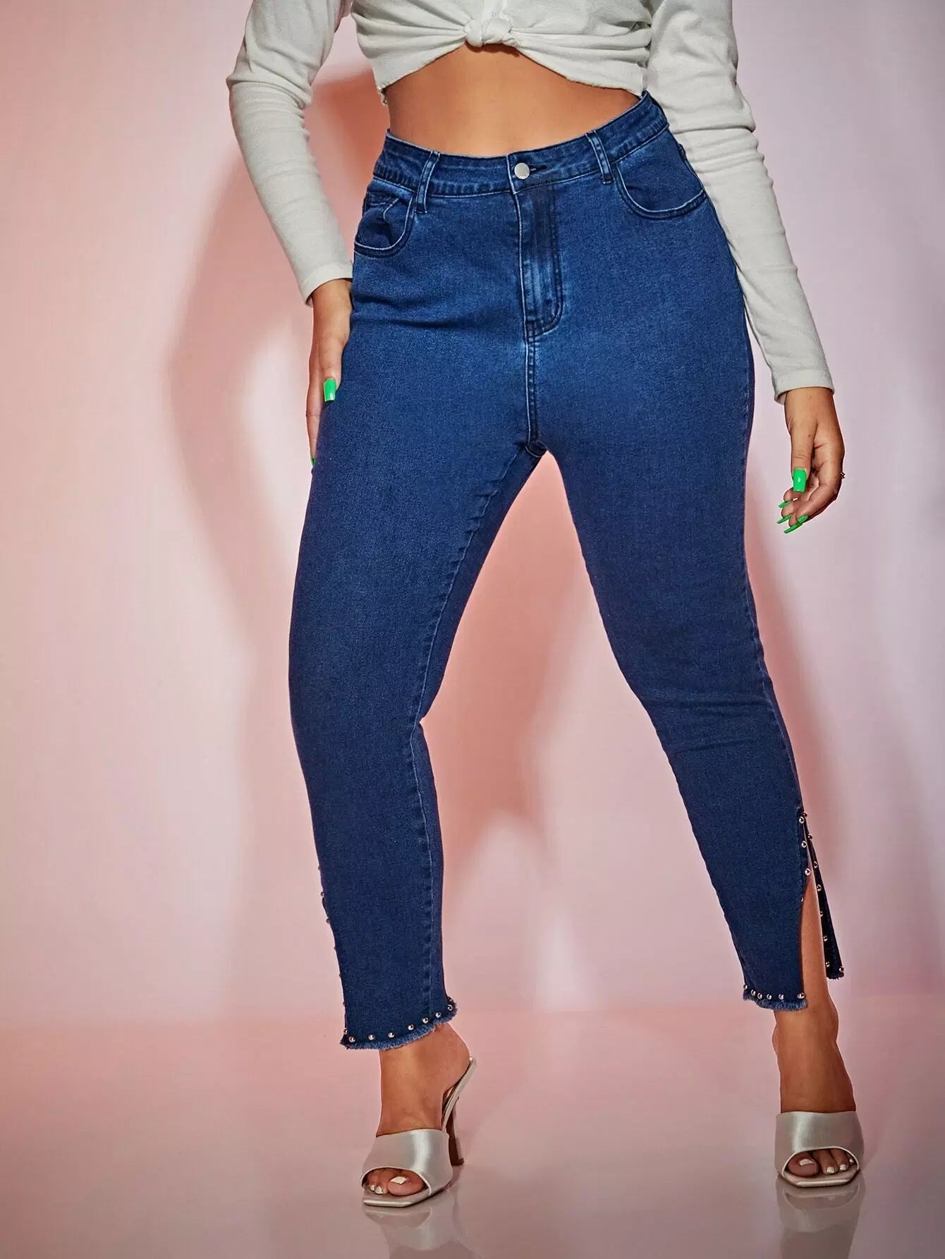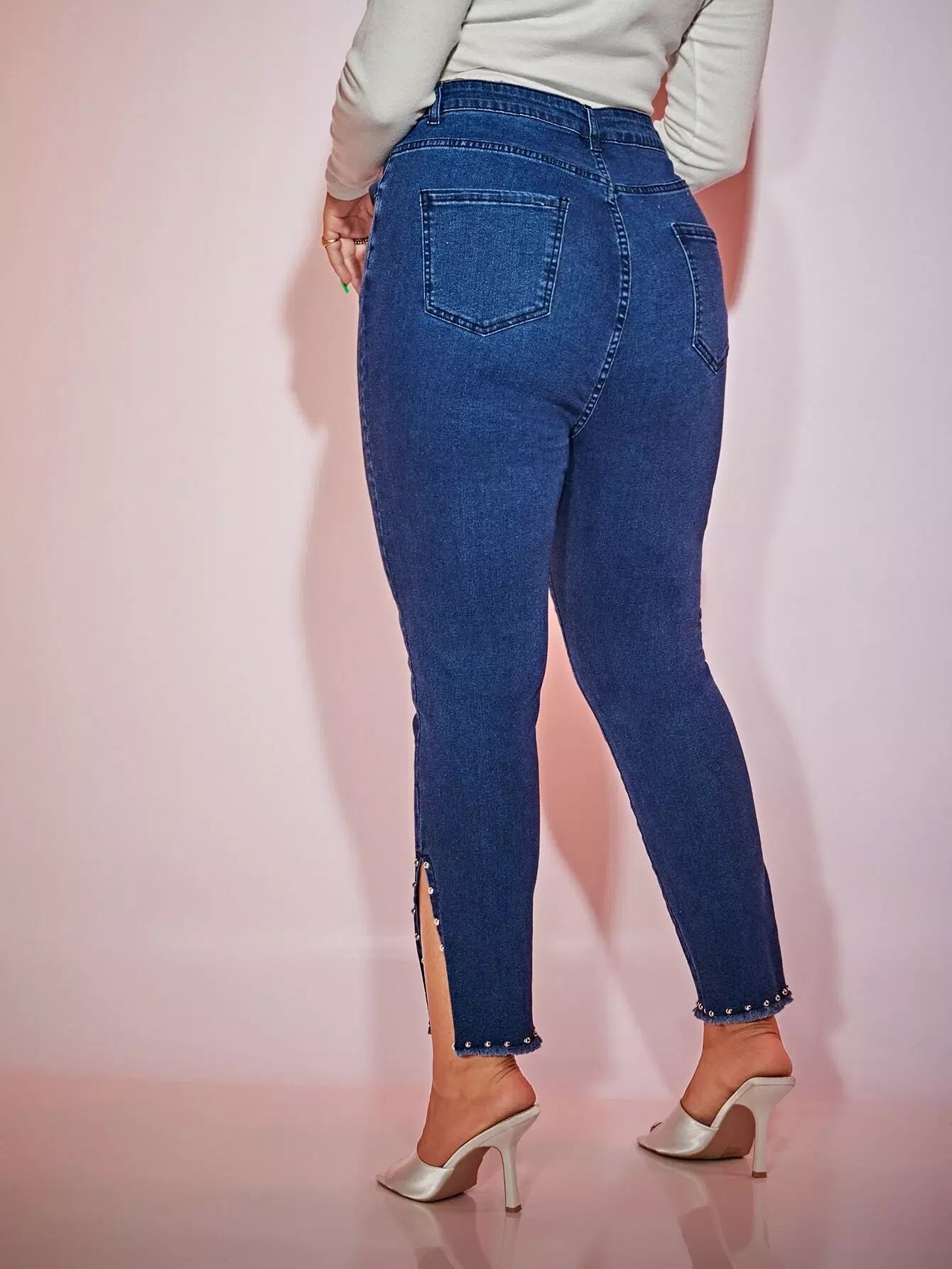 Plus High Waist Studded Detail Split Raw Hem Jeans