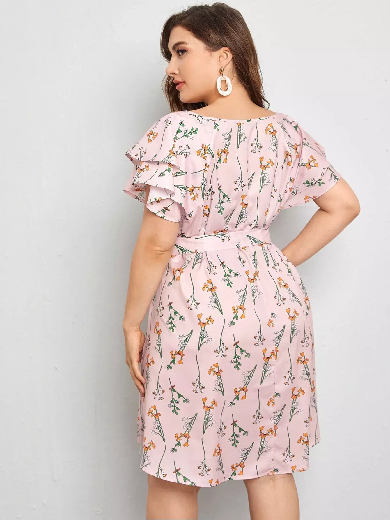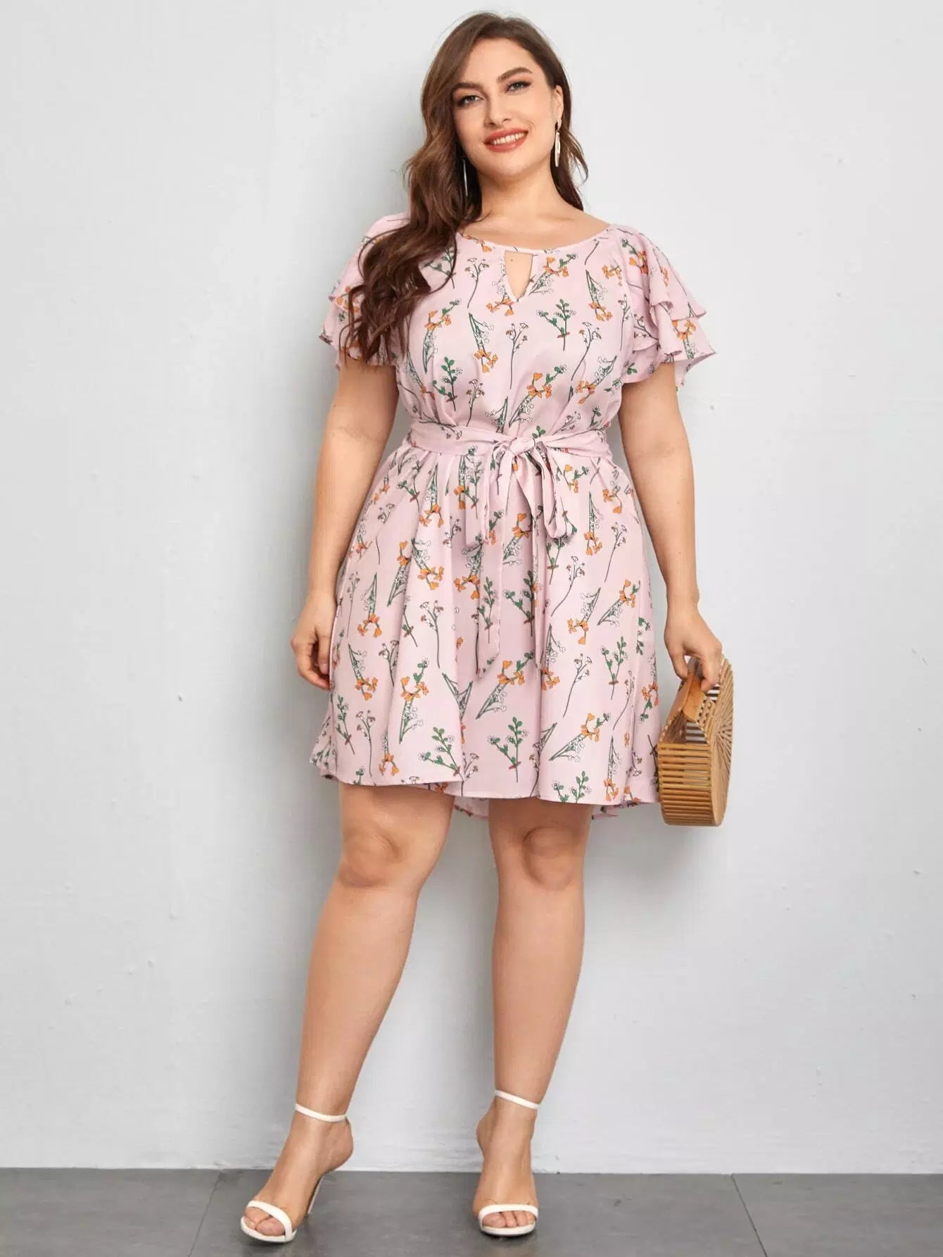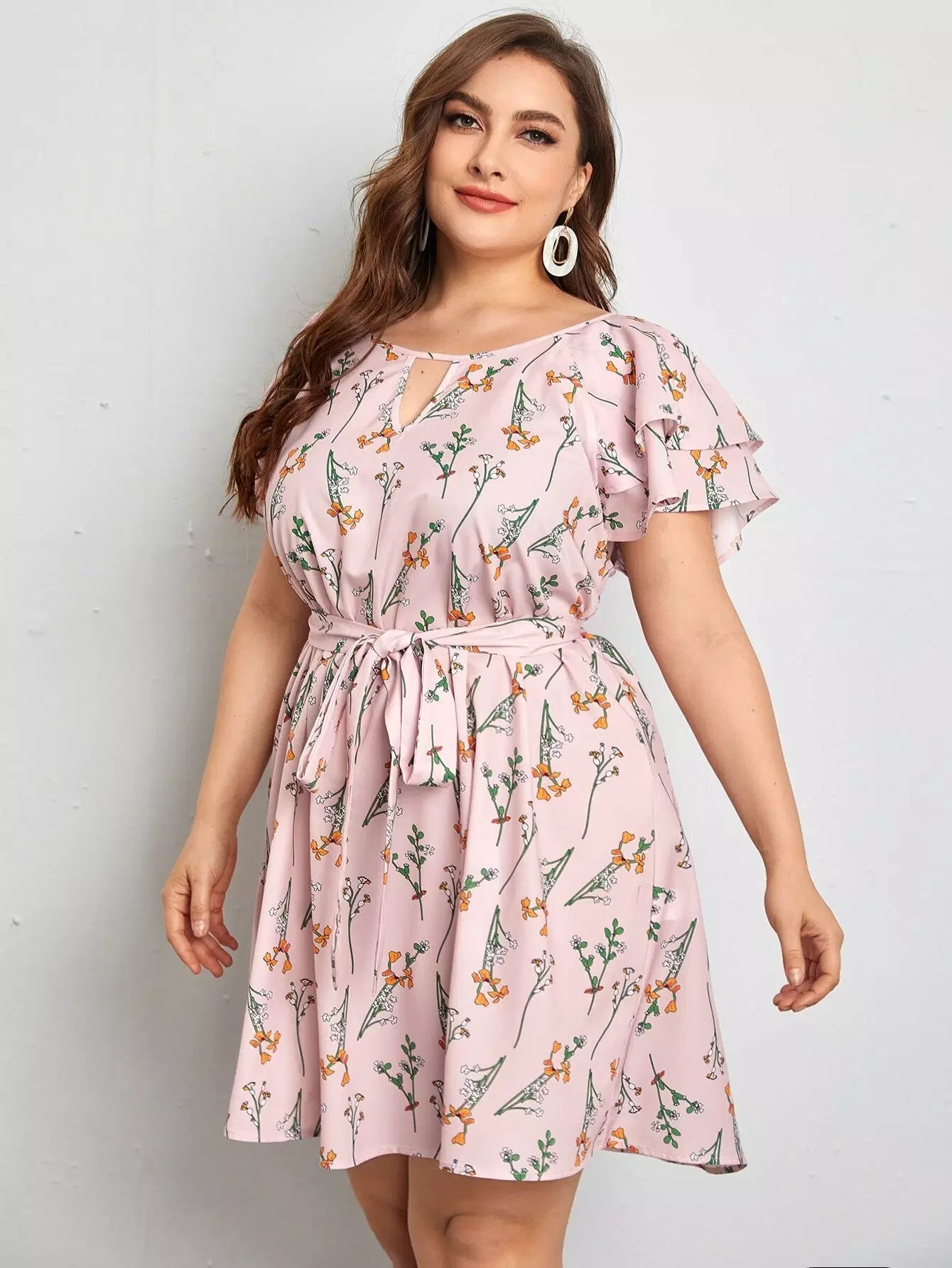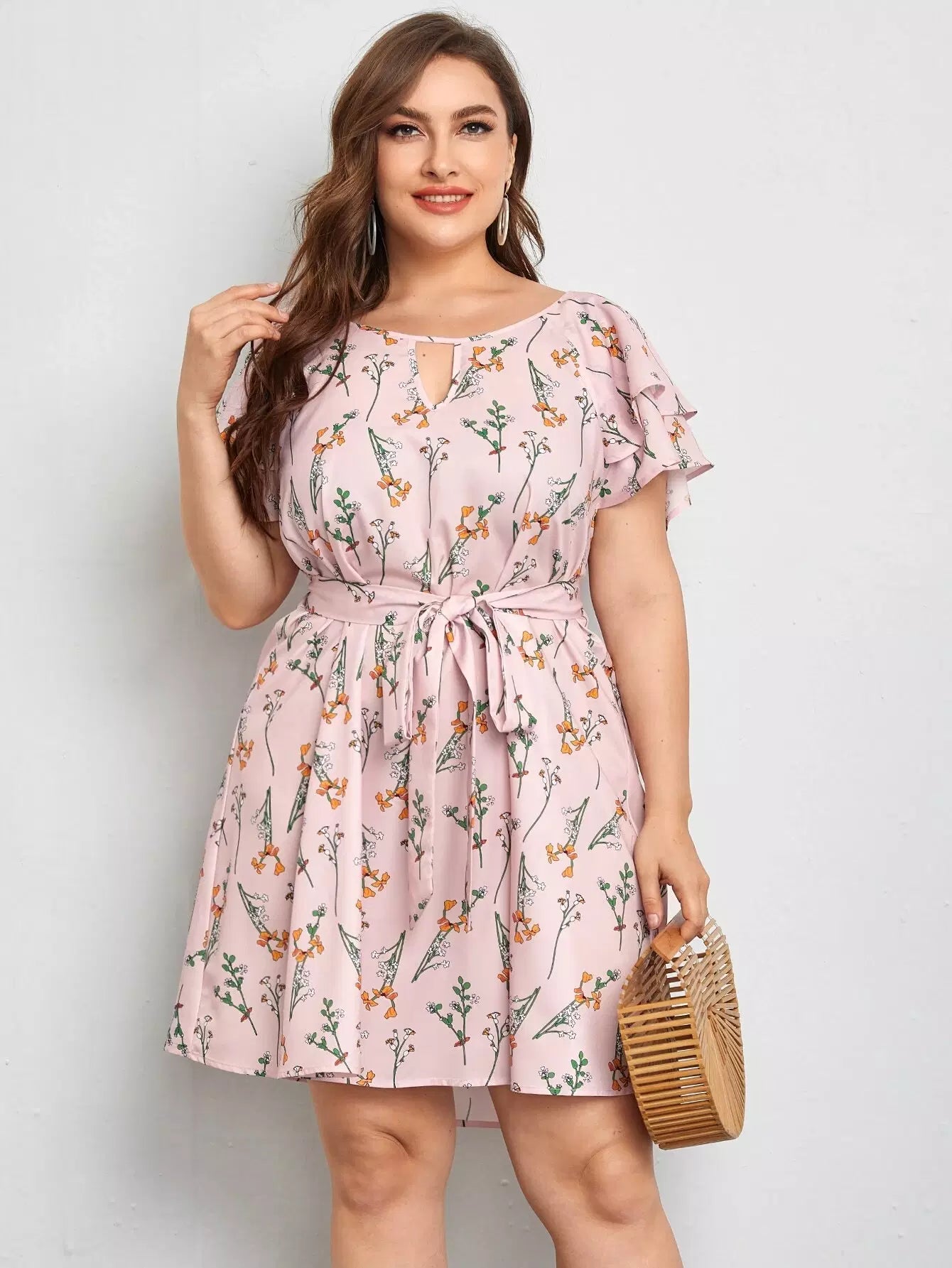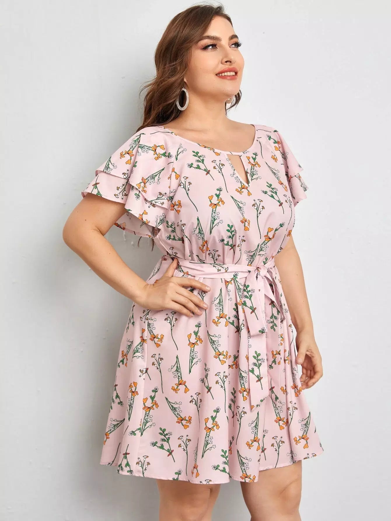 Plus Keyhole Neck Butterfly Sleeve Dress Without Belt