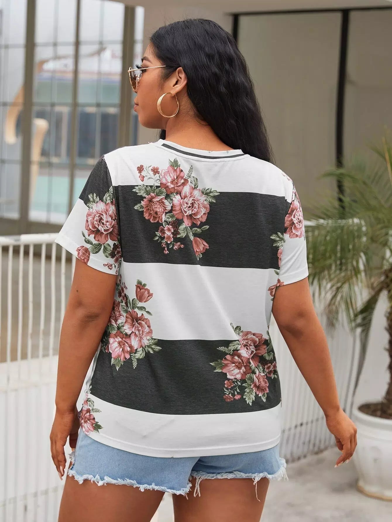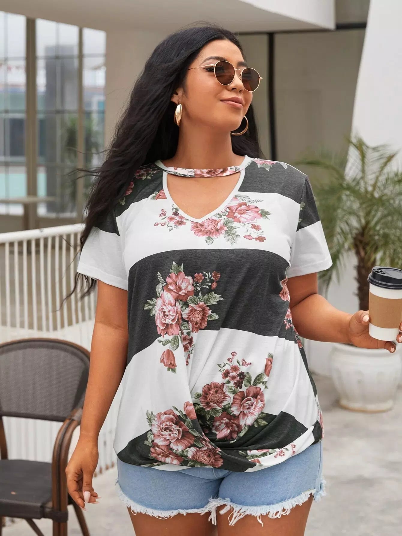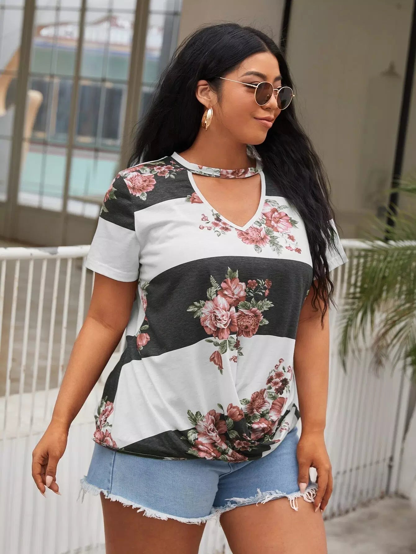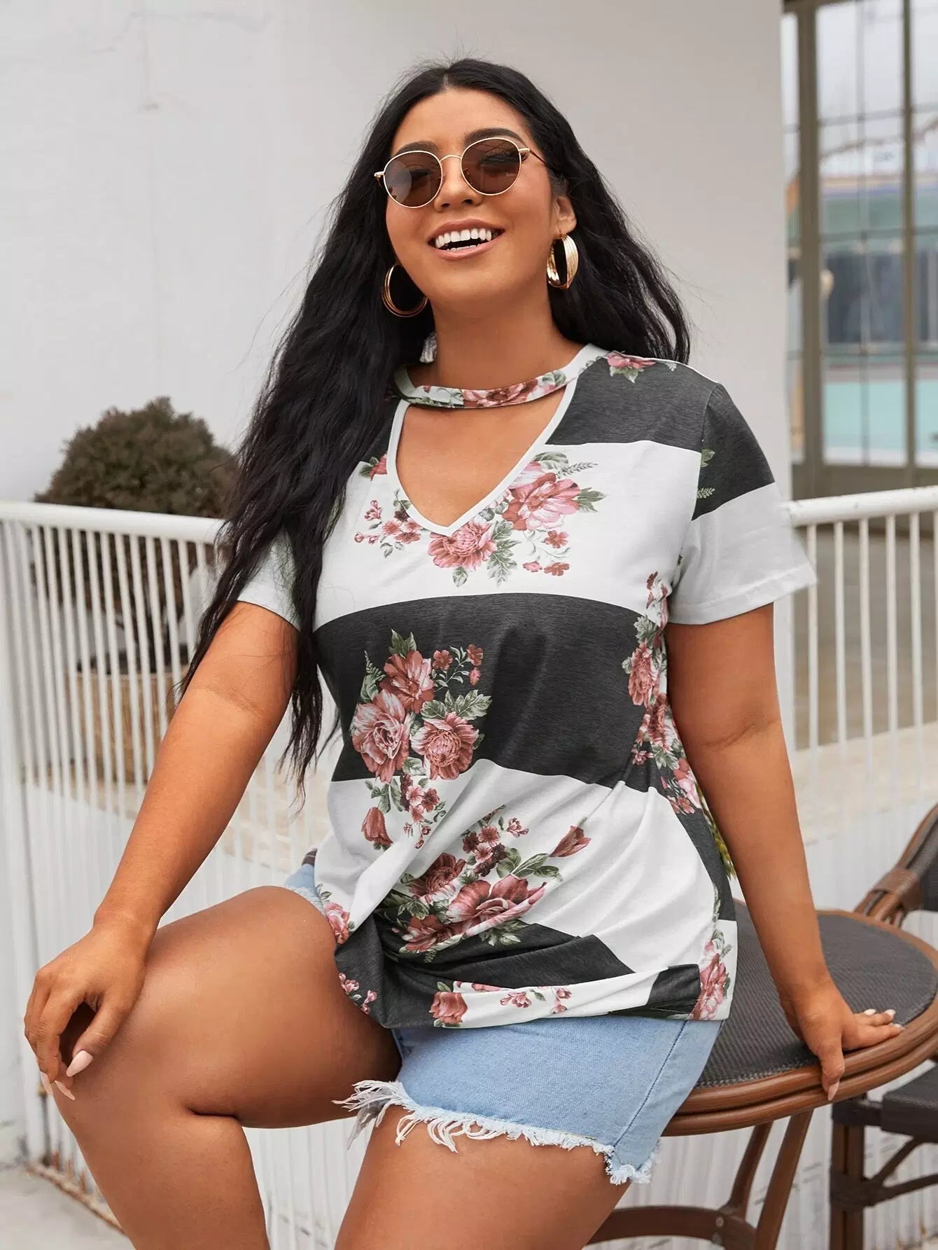 Plus Keyhole Neck Floral Colorblock Tee