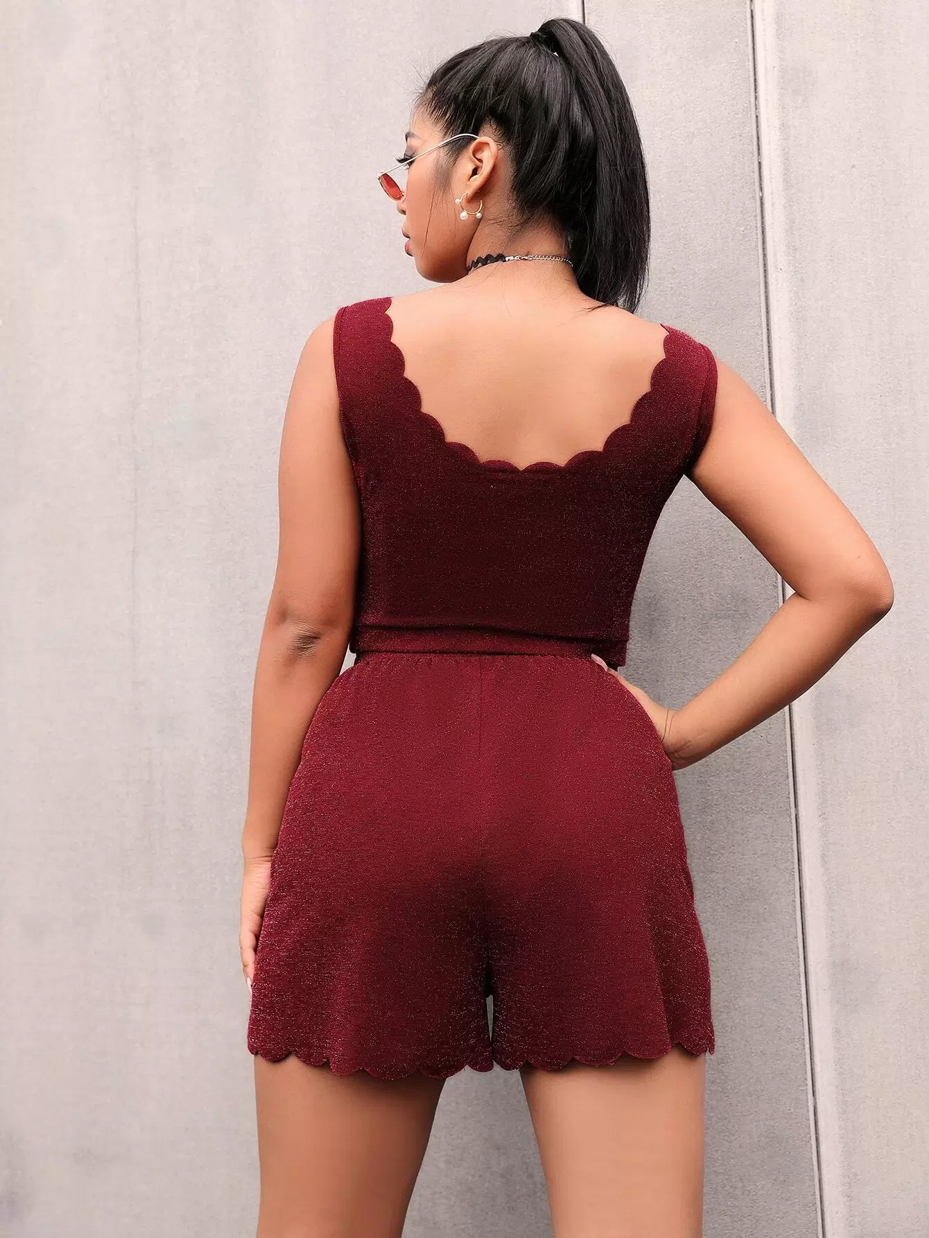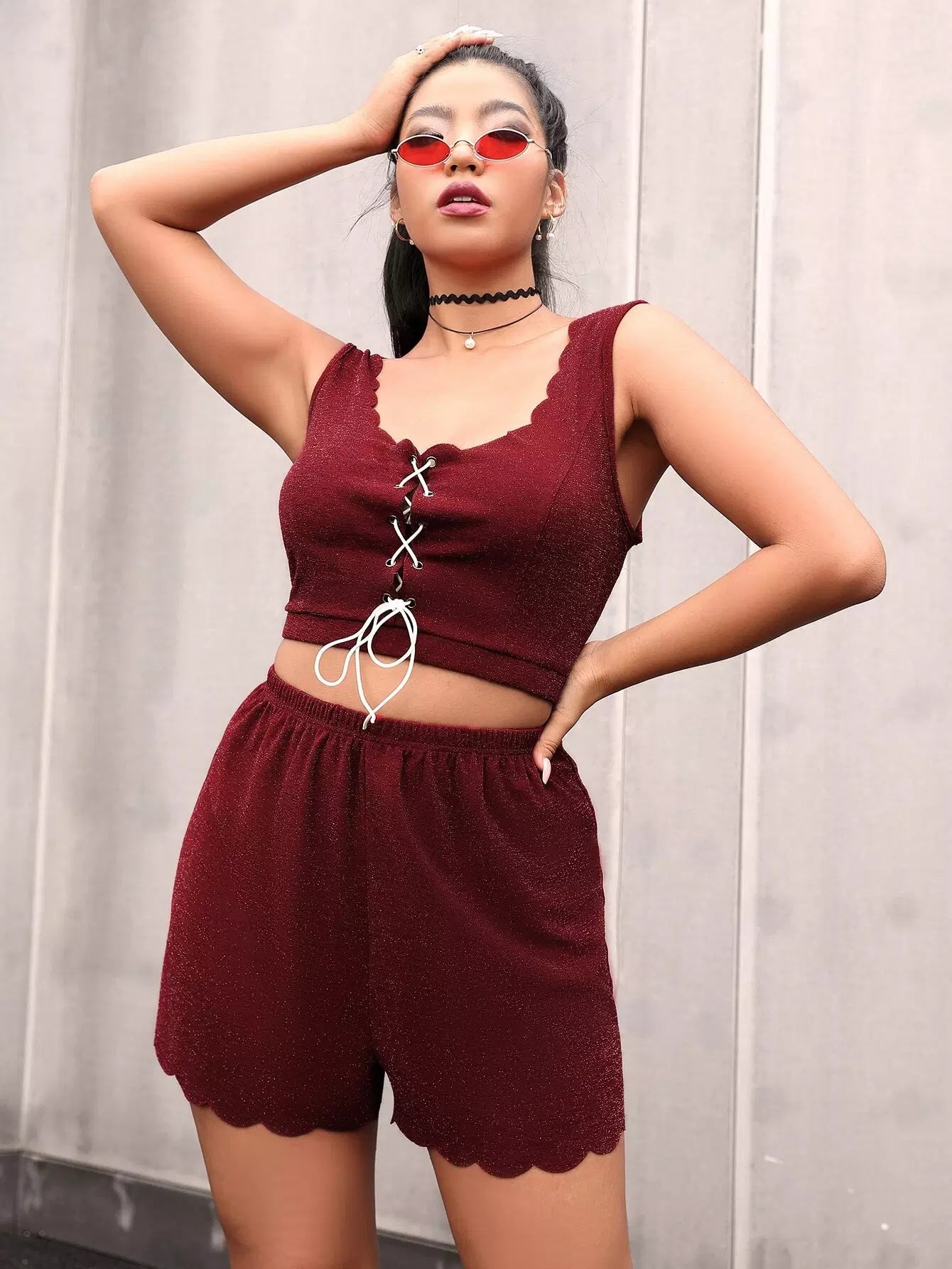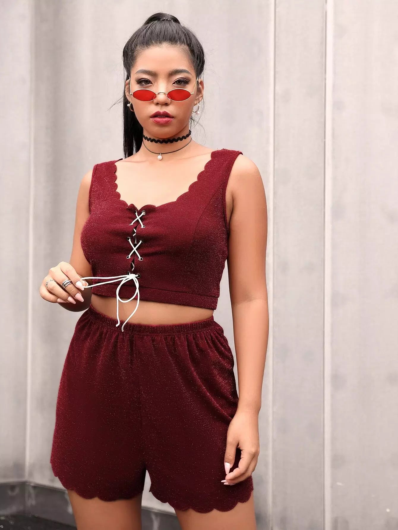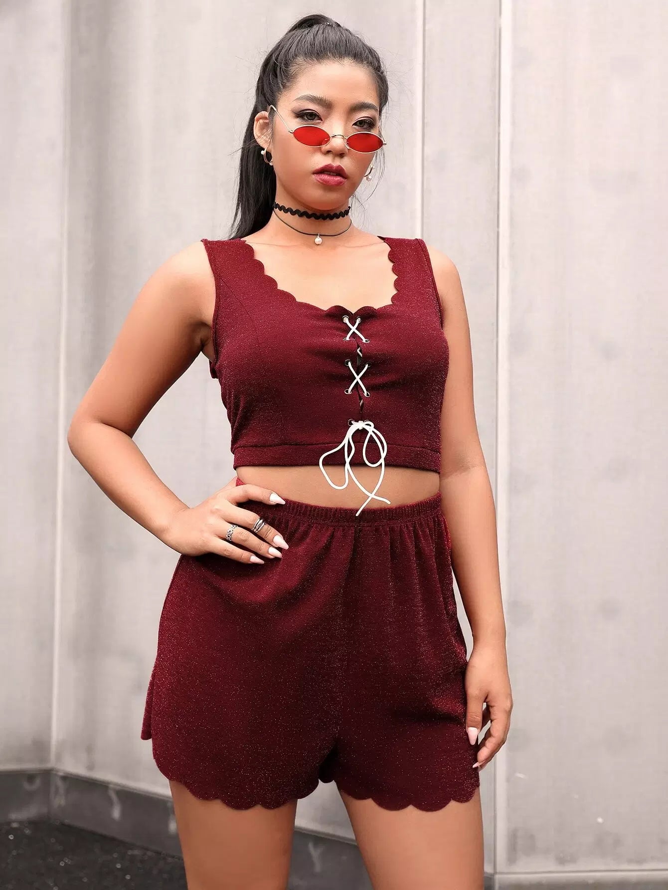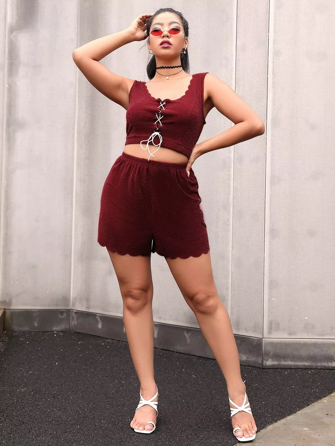 Plus Lace Up Scallop Trim Tank Top & Shorts