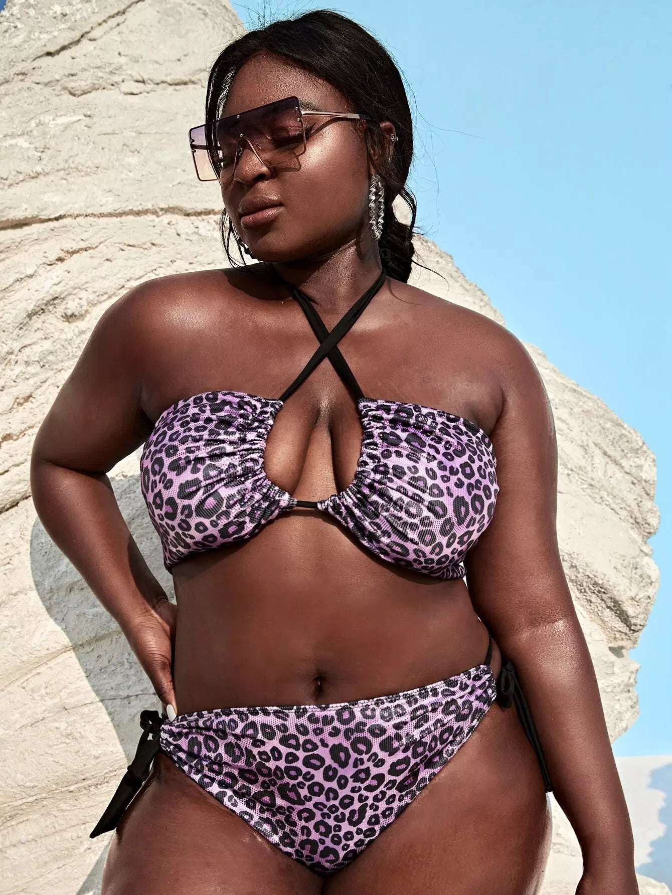 Plus Leopard Criss Cross Halter Bikini Swimsuit