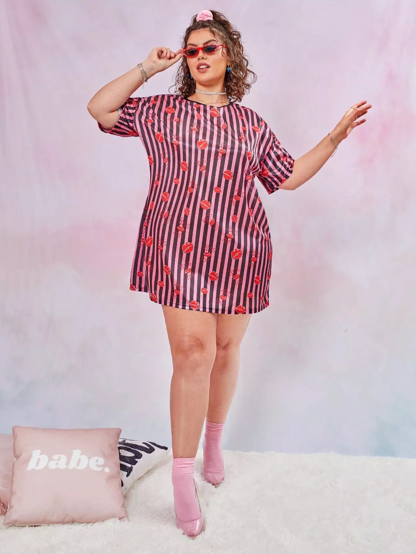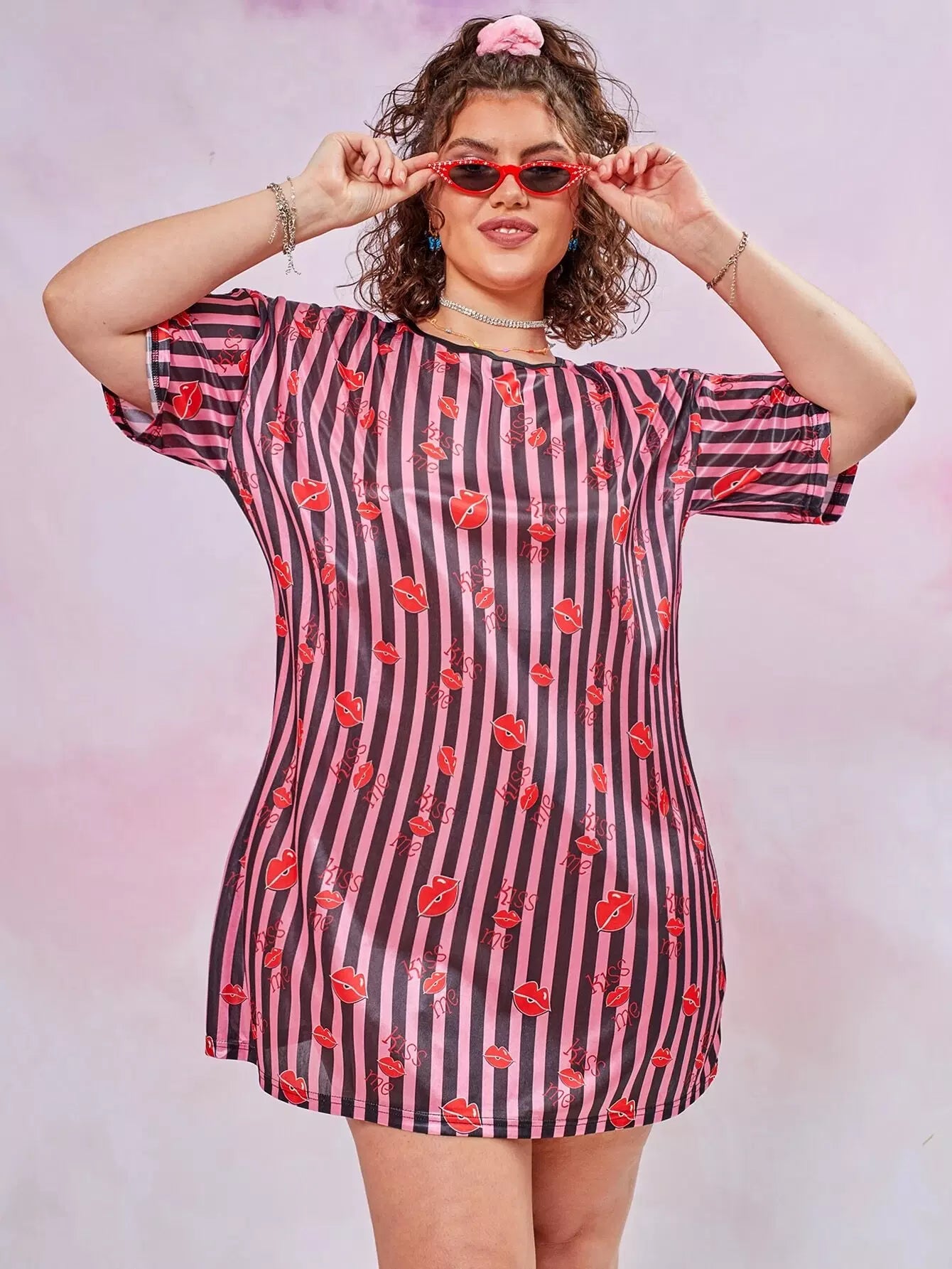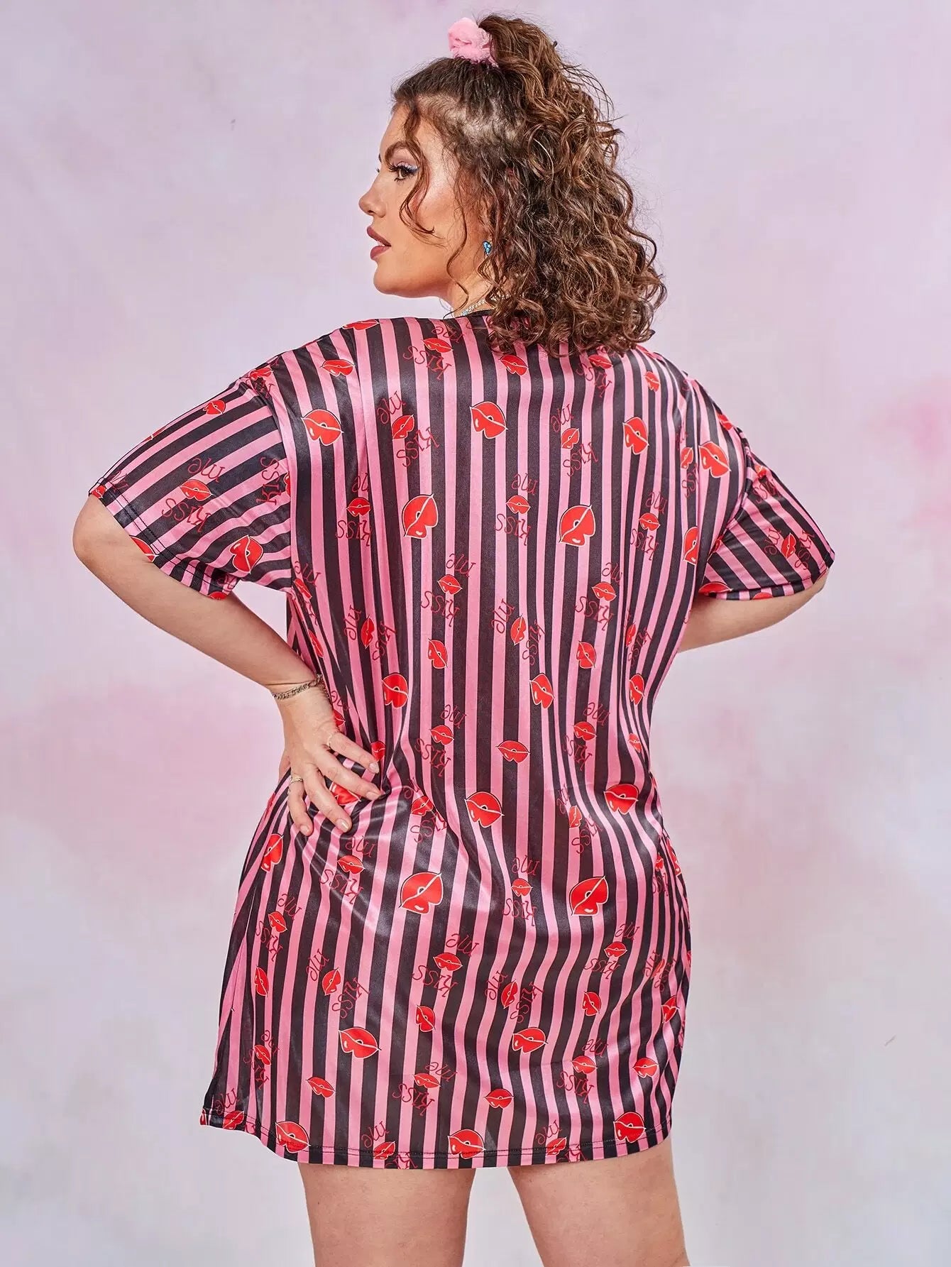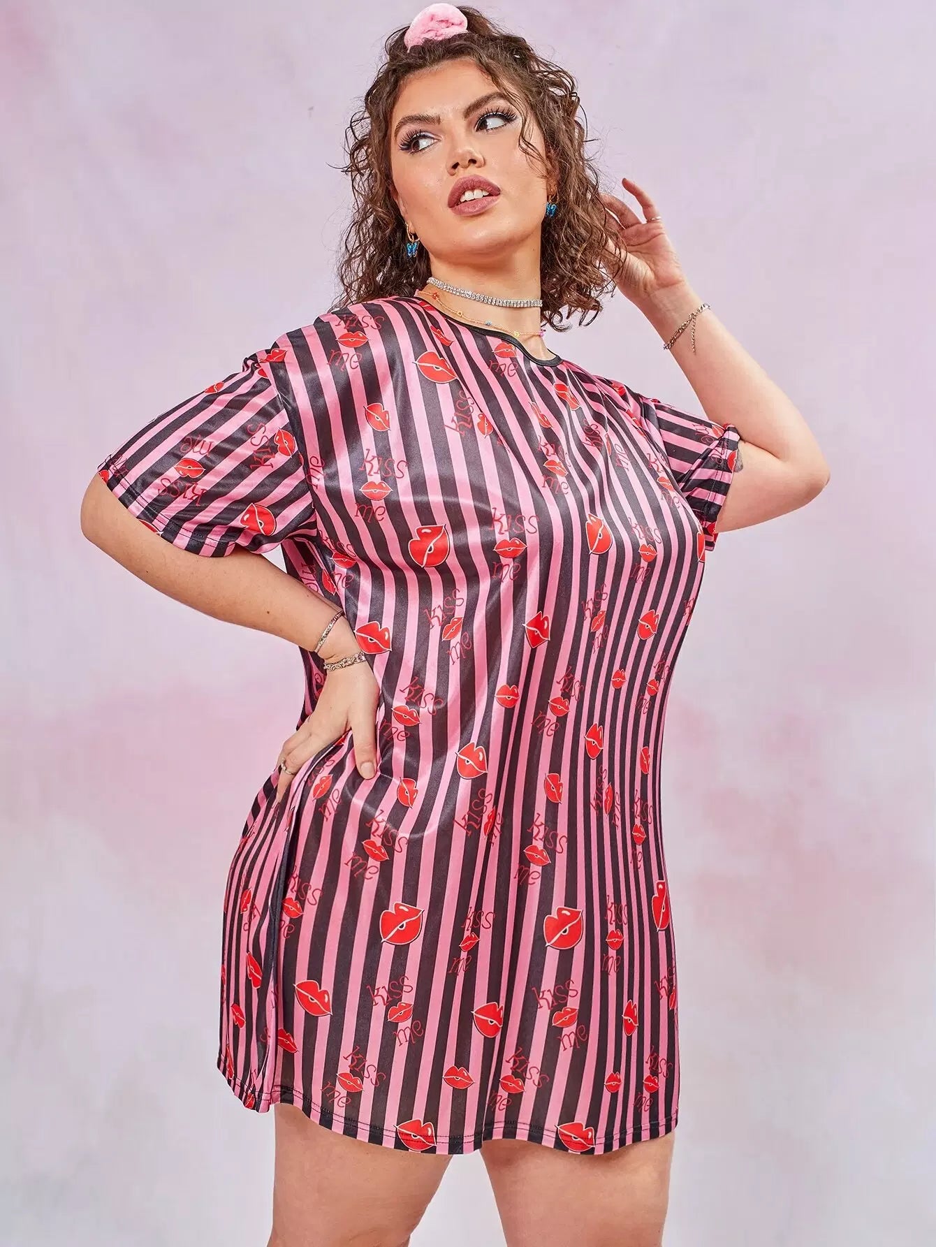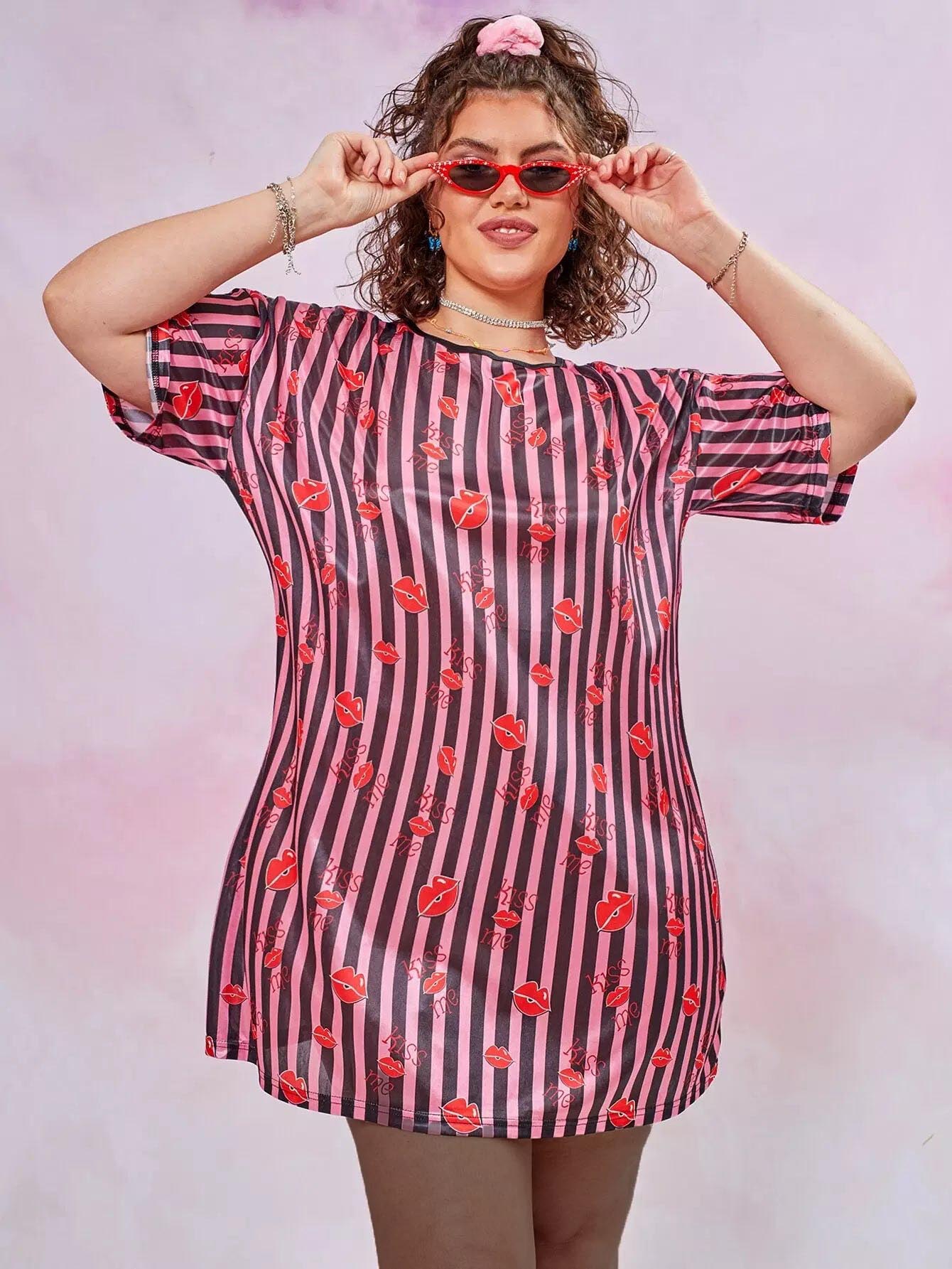 Plus Lip And Striped Print Satin Night Dress