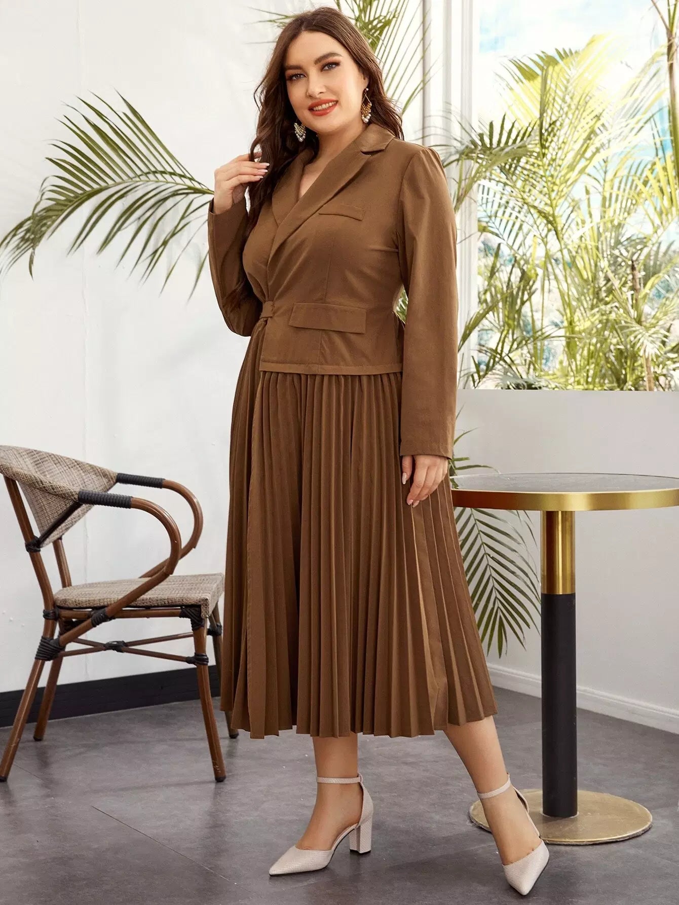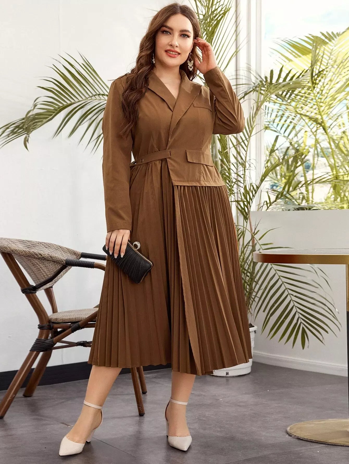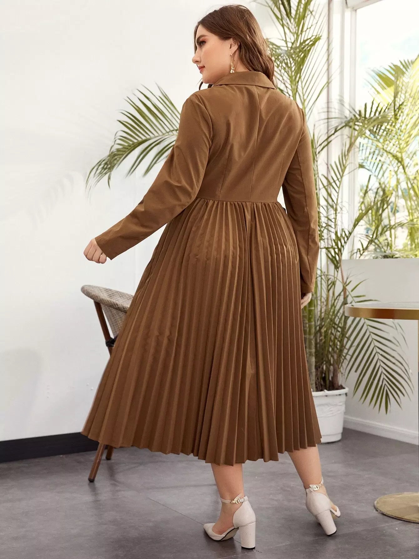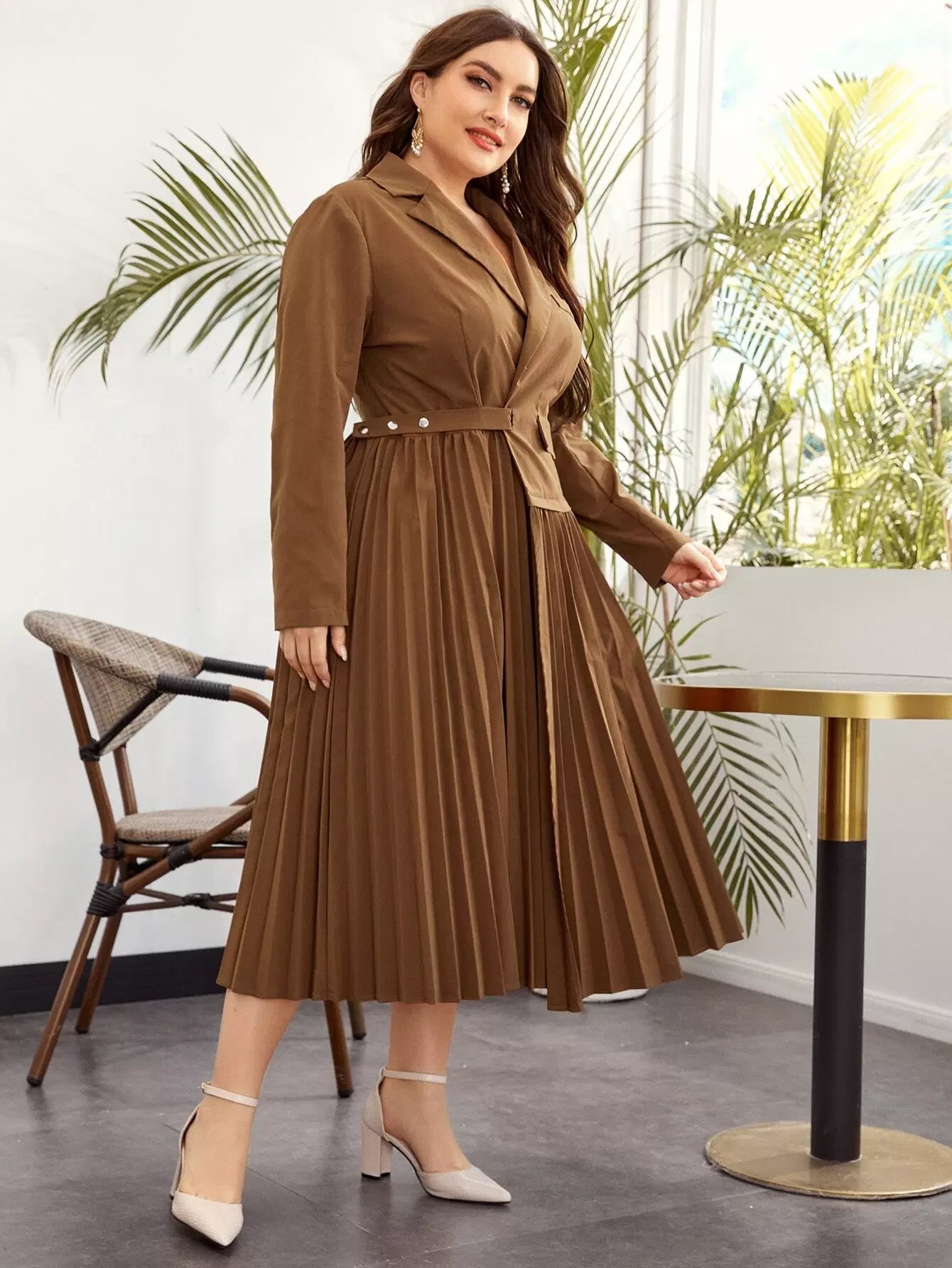 Women - Plus Notch Collar Press Buttoned Strap Side Pleated Dress