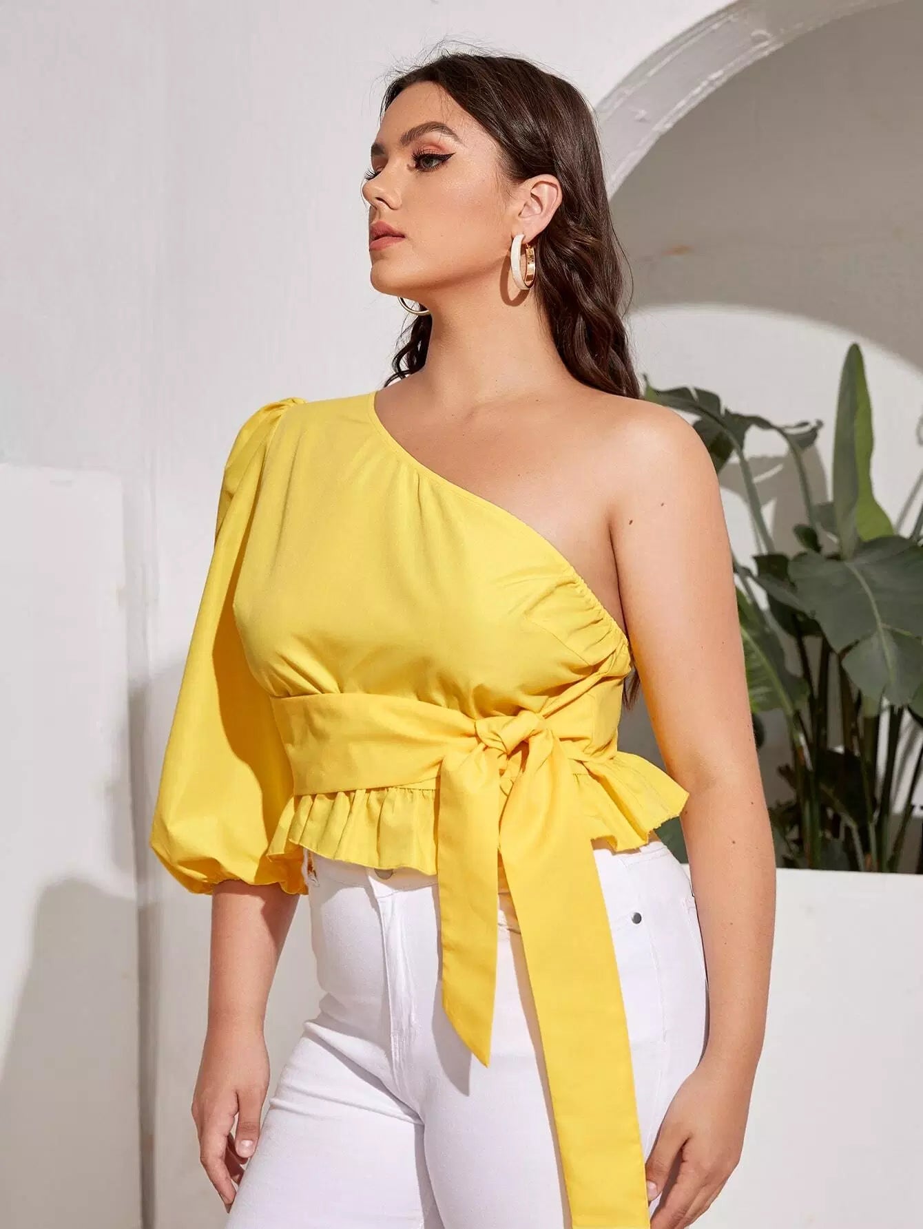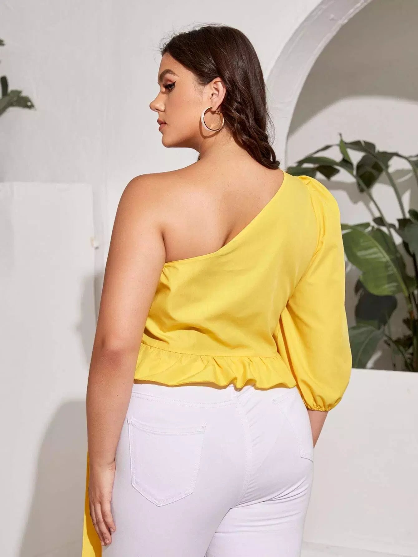 Plus One Shoulder Puff Sleeve Blouse Without Belt