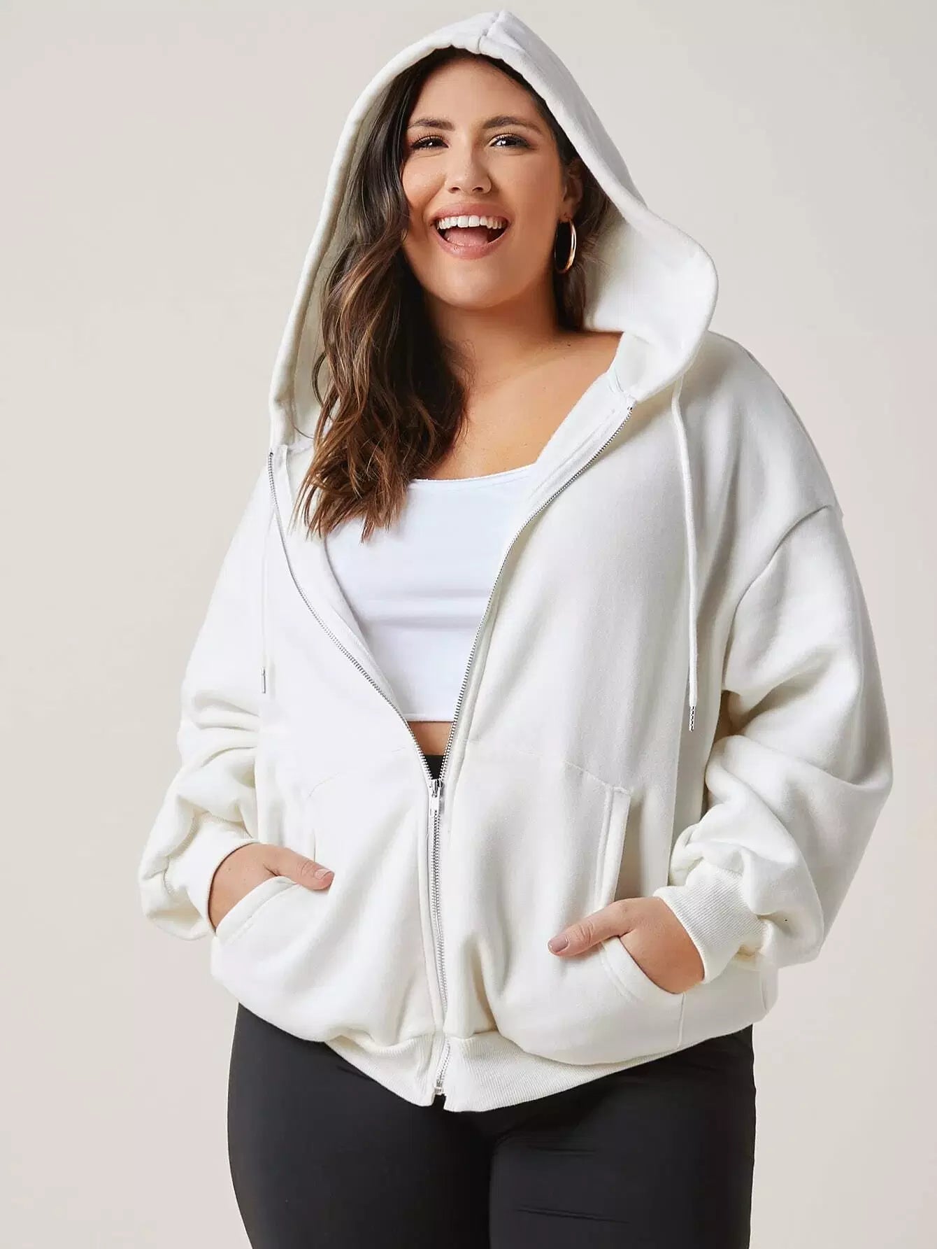 Plus Pocket Front Solid Zip Up Hoodie