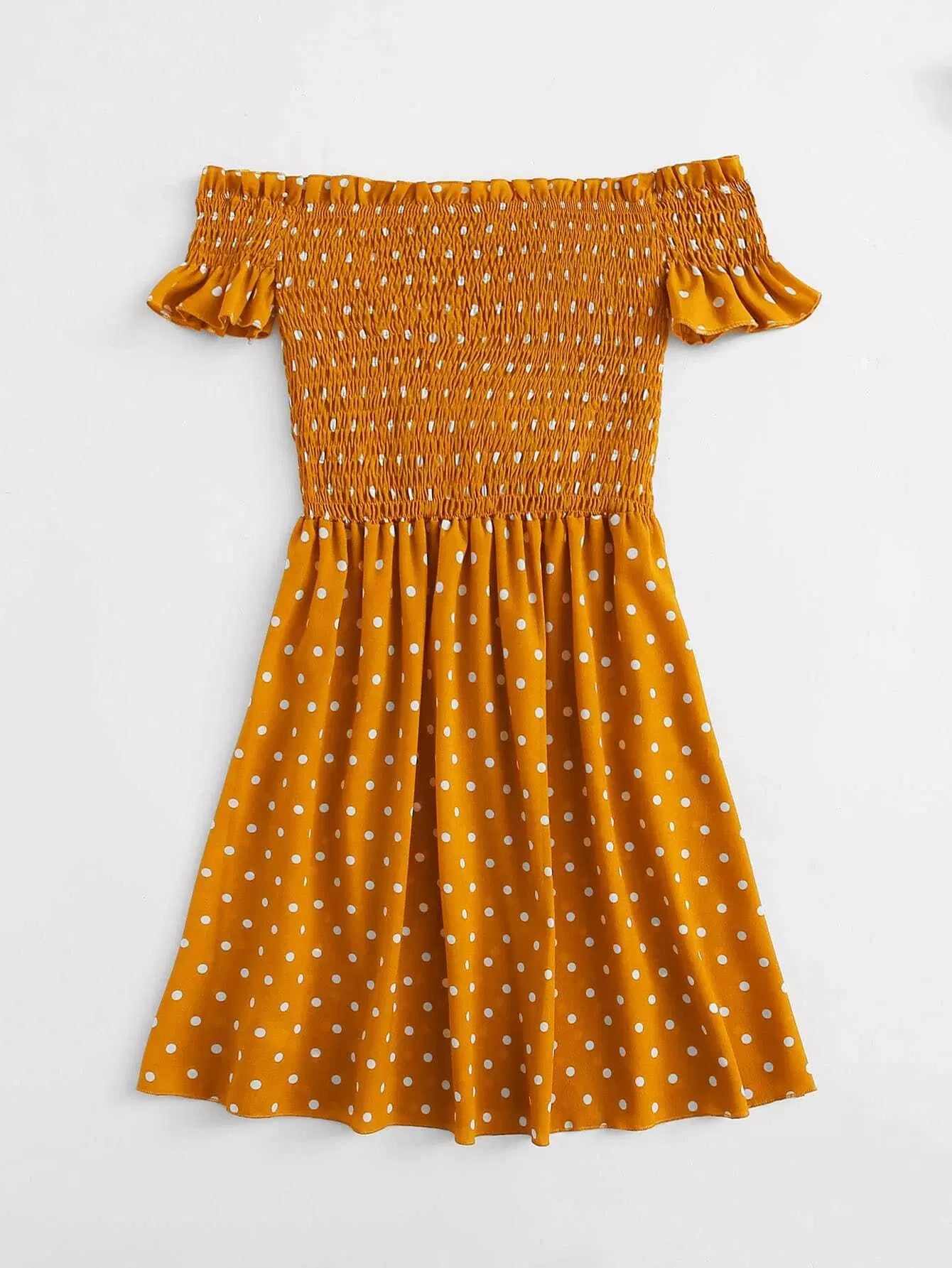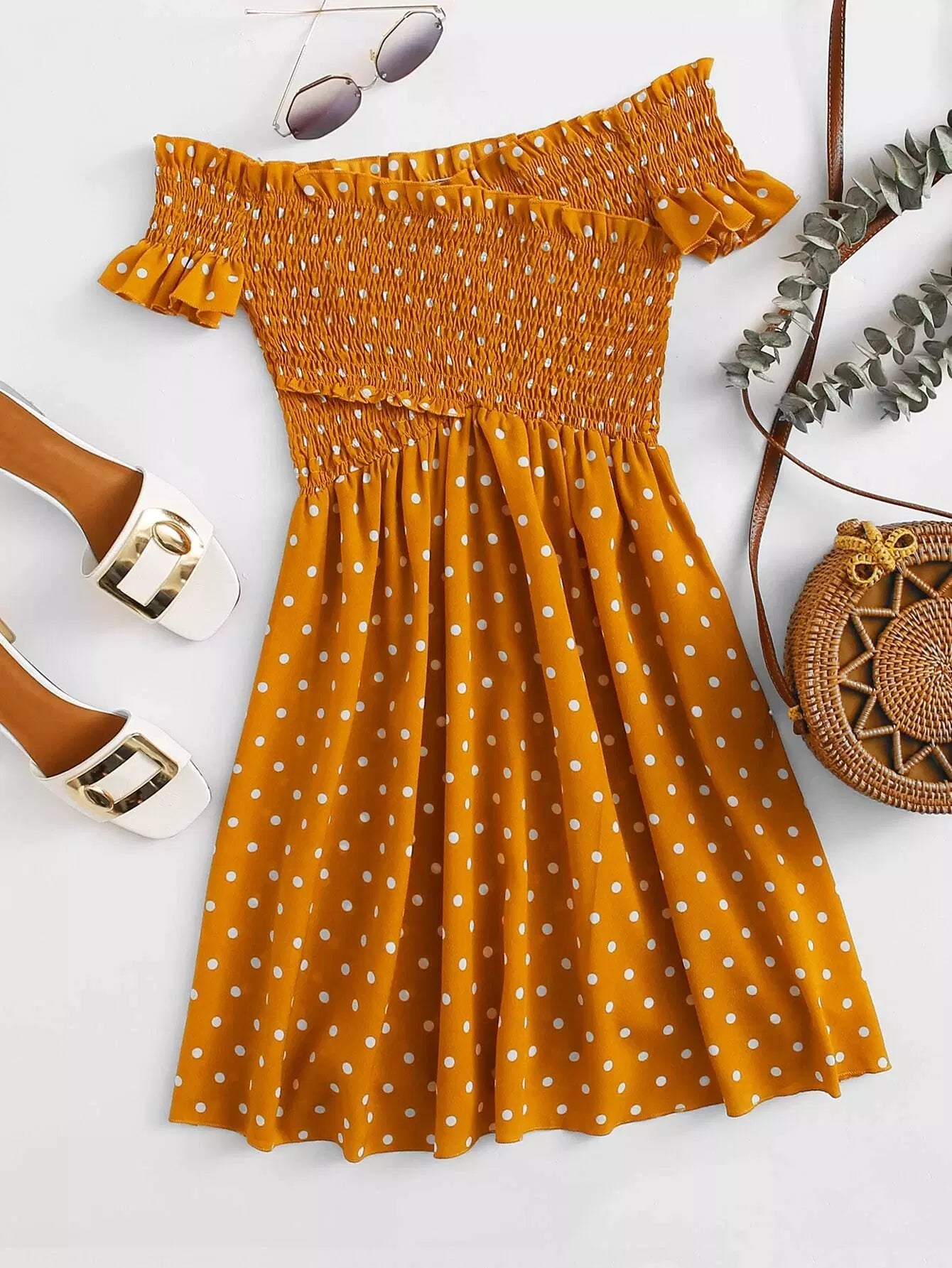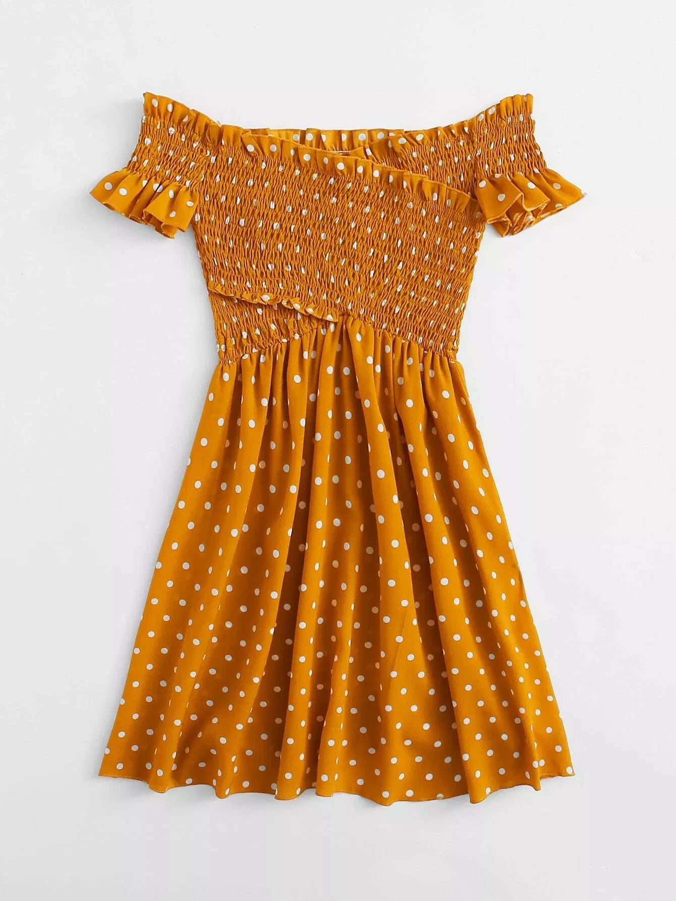 Women - Plus Polka Dot Shirred Bodice Frill Trim Bardot Dress
