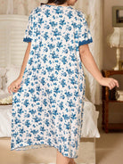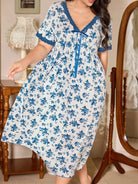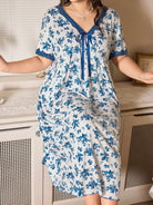 Plus Size Women Ditsy Floral Patchwork Lace Bow V-Neck Short Sleeve Nightgown