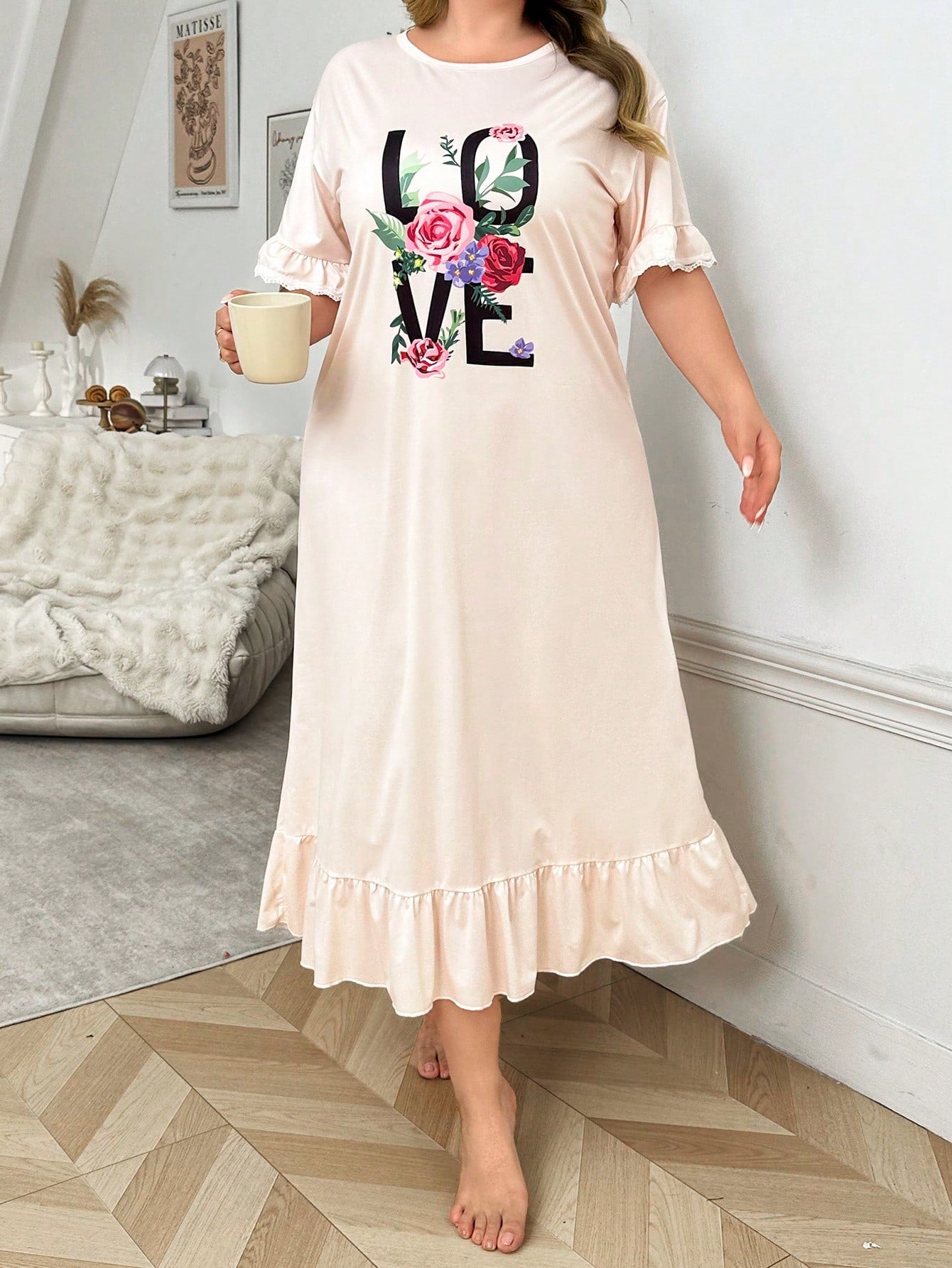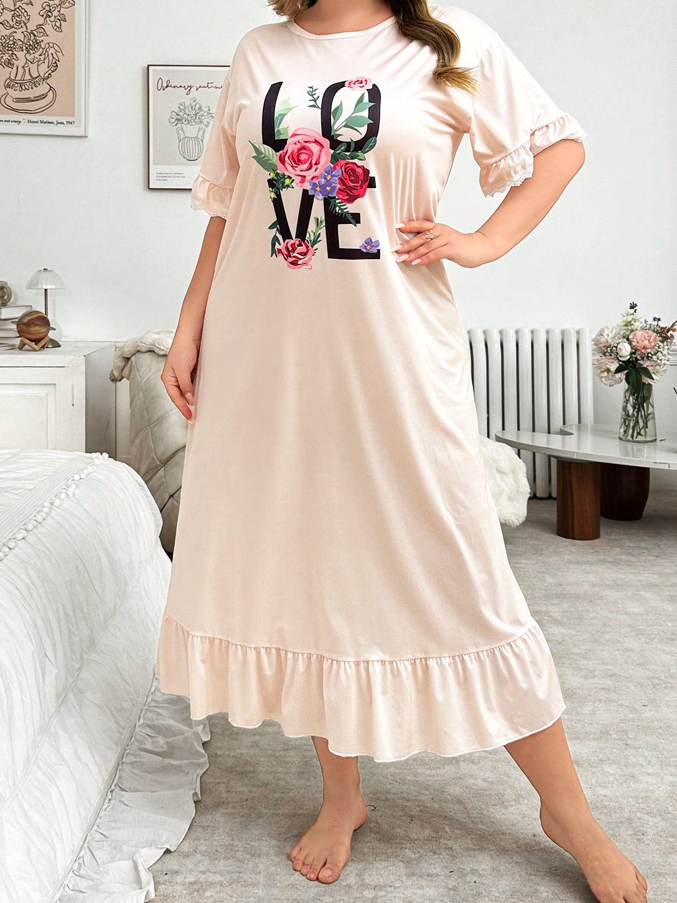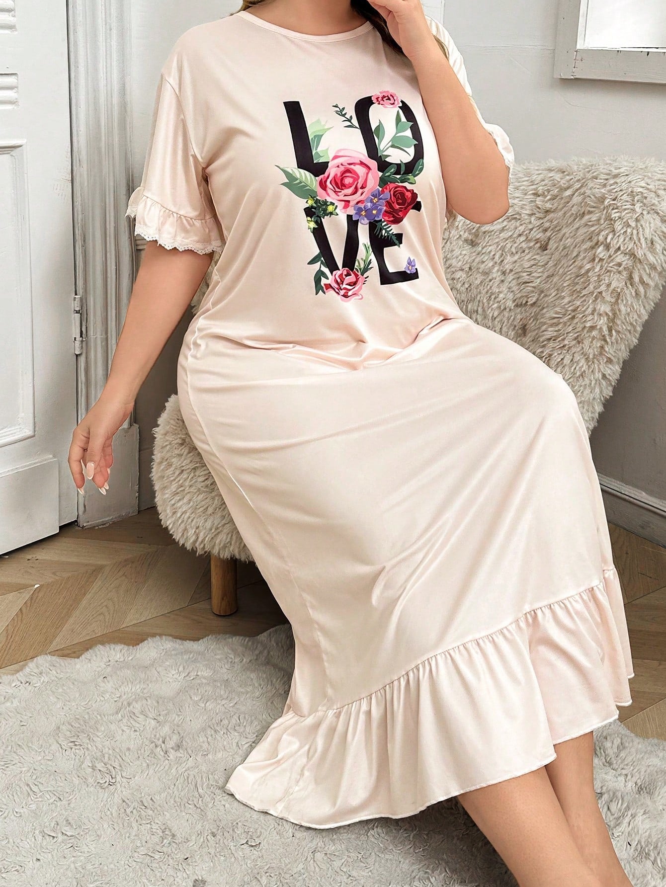 women Plus Size Women's Letter & Flower Printed Ruffle Hem Long Nightgown