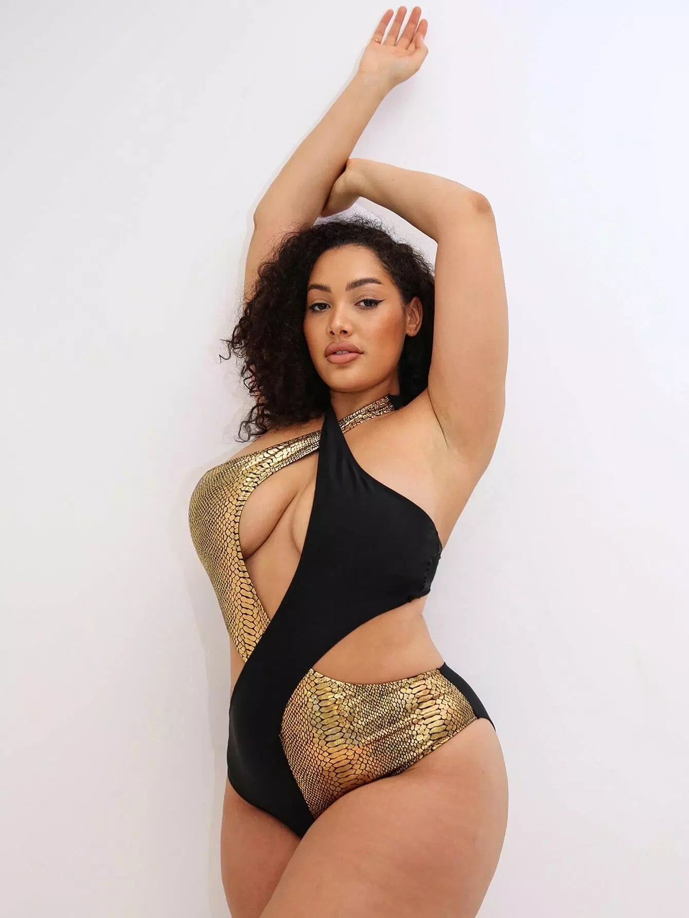 Plus Snakeskin Metallic Cut-out Halter One Piece Swimsuit