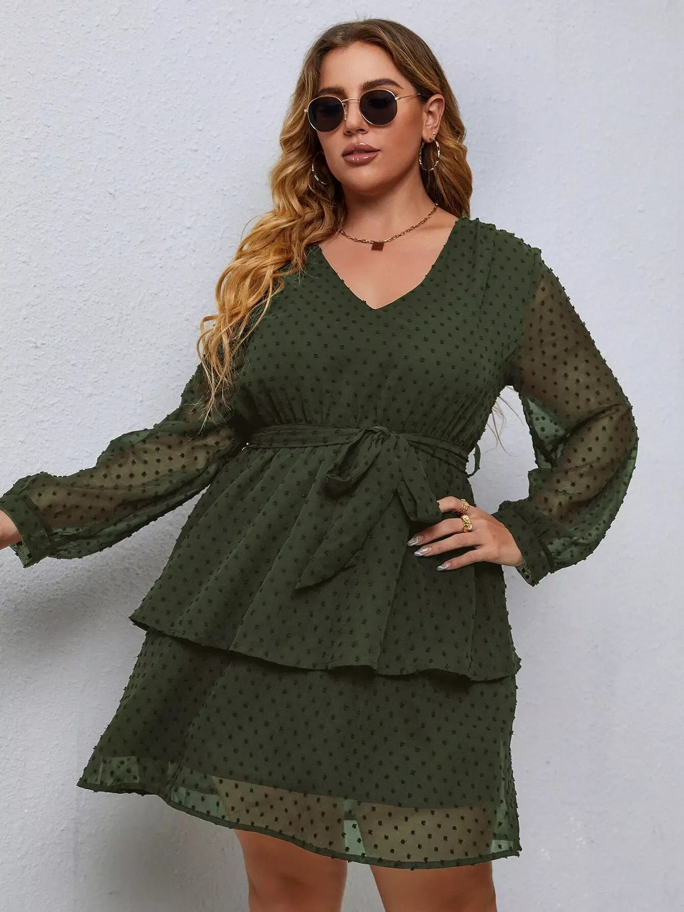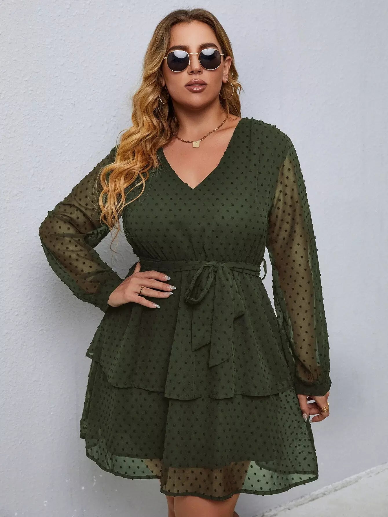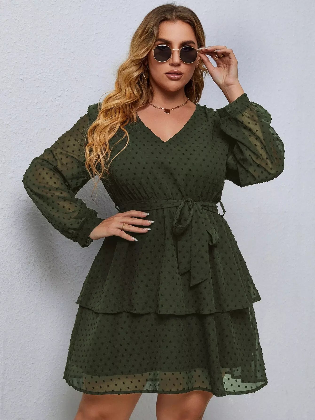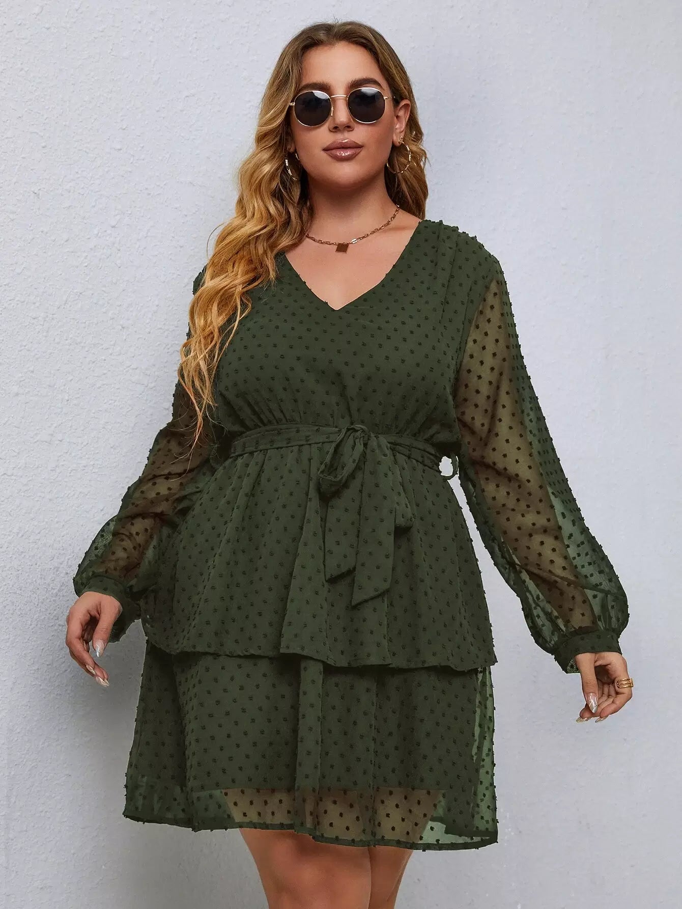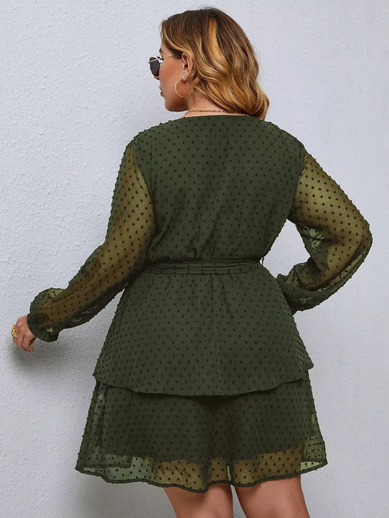 Plus Swiss Dot Bishop Sleeve Layer Hem Chiffon Dress Without Belt