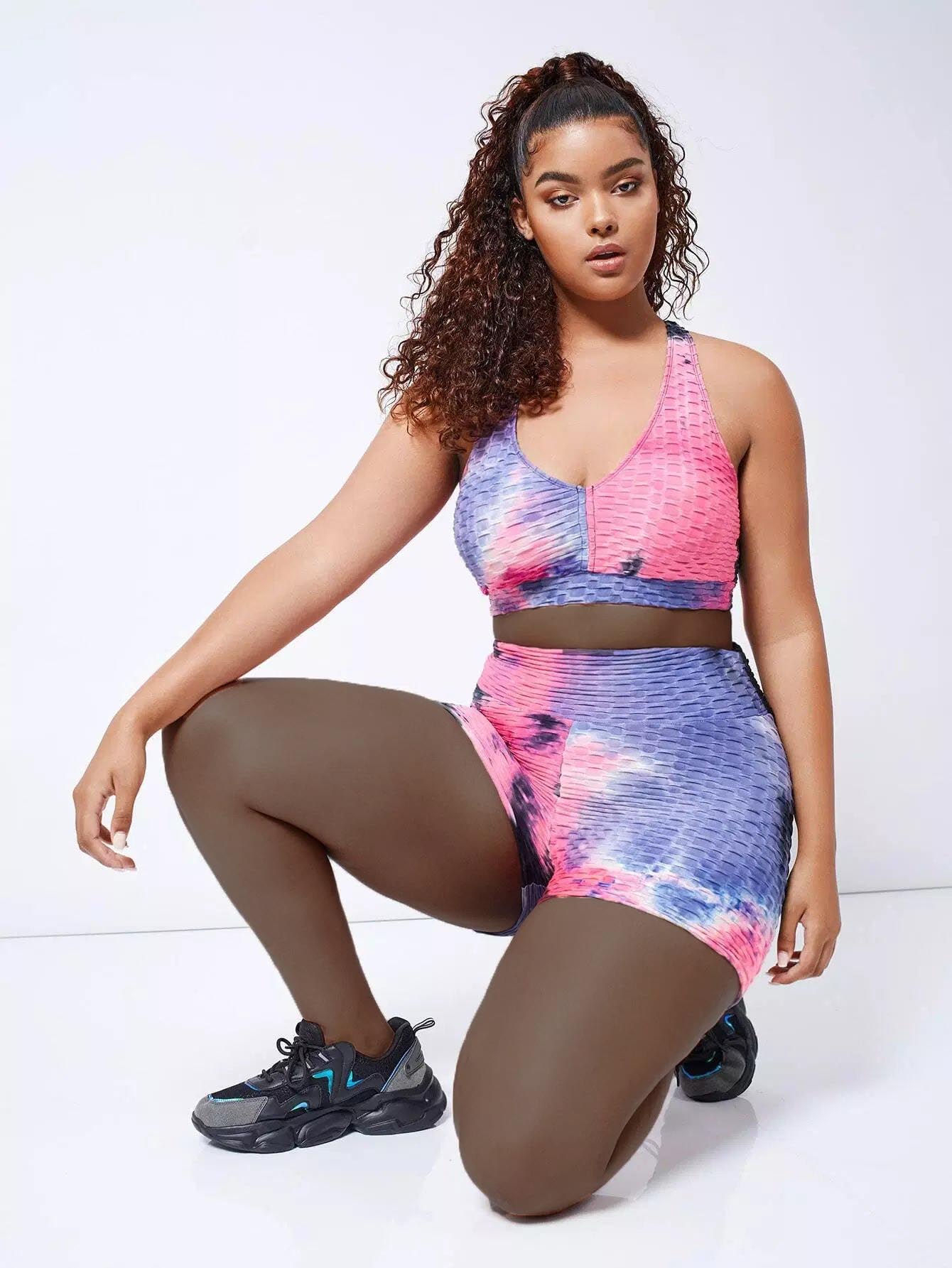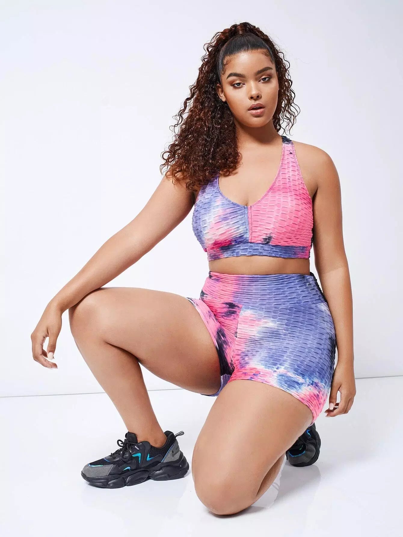 Plus Tie Dye Criss Cross Back Honeycomb Textured Sports Bra & Shorts