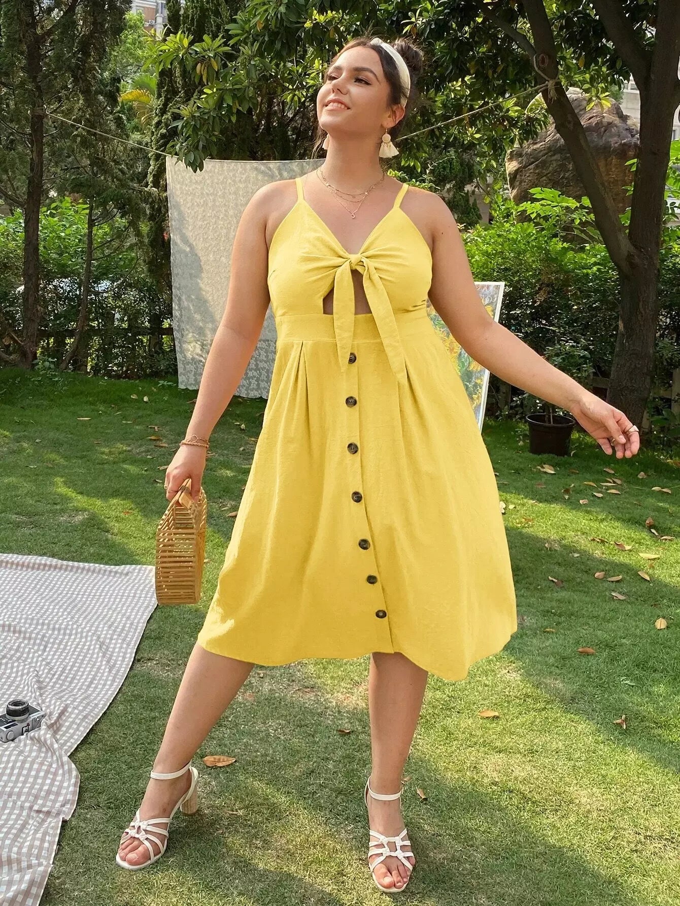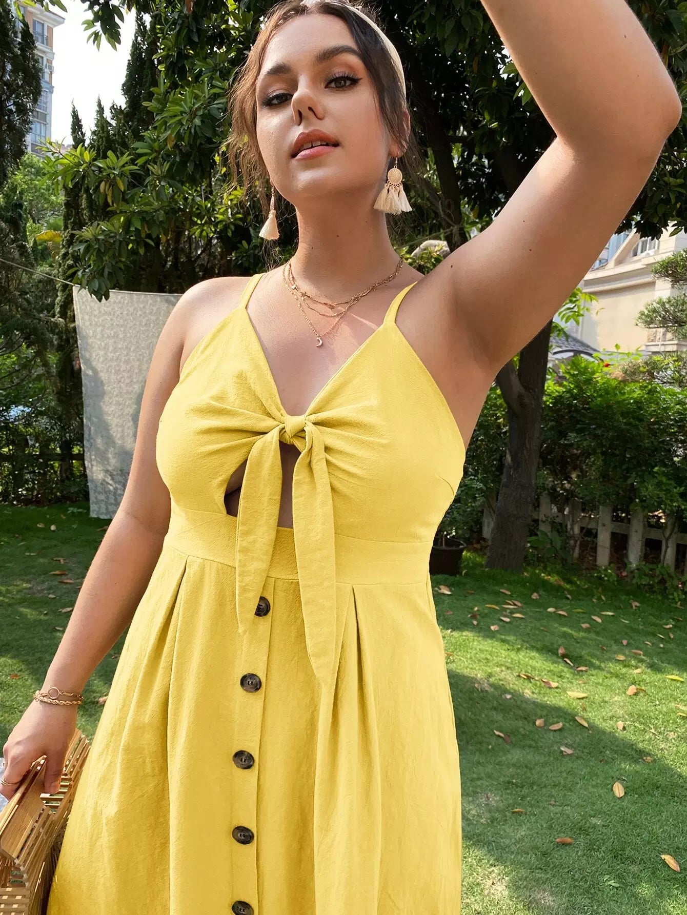 Plus Tie Front Peekaboo Shirred Back Cami Dress