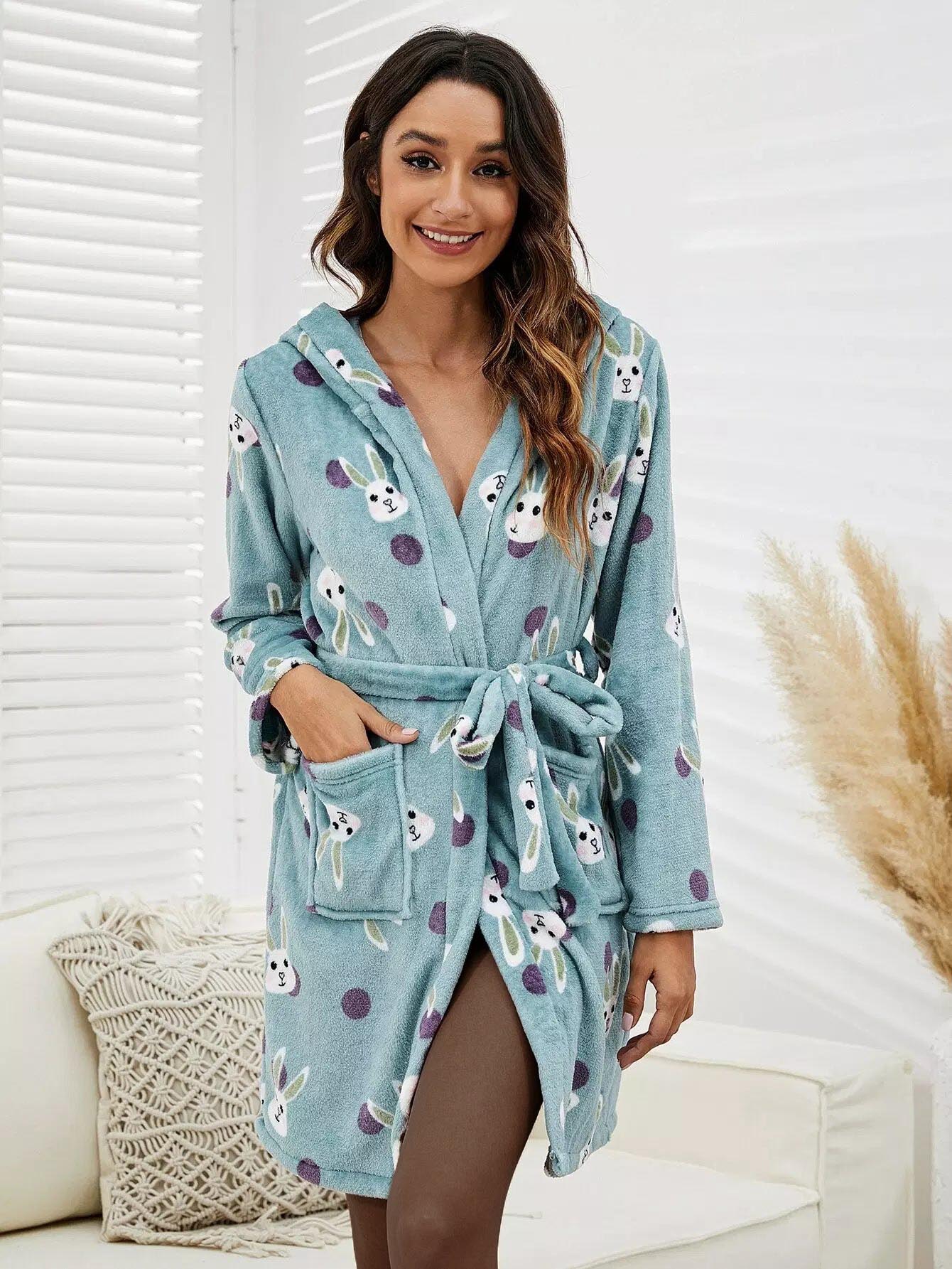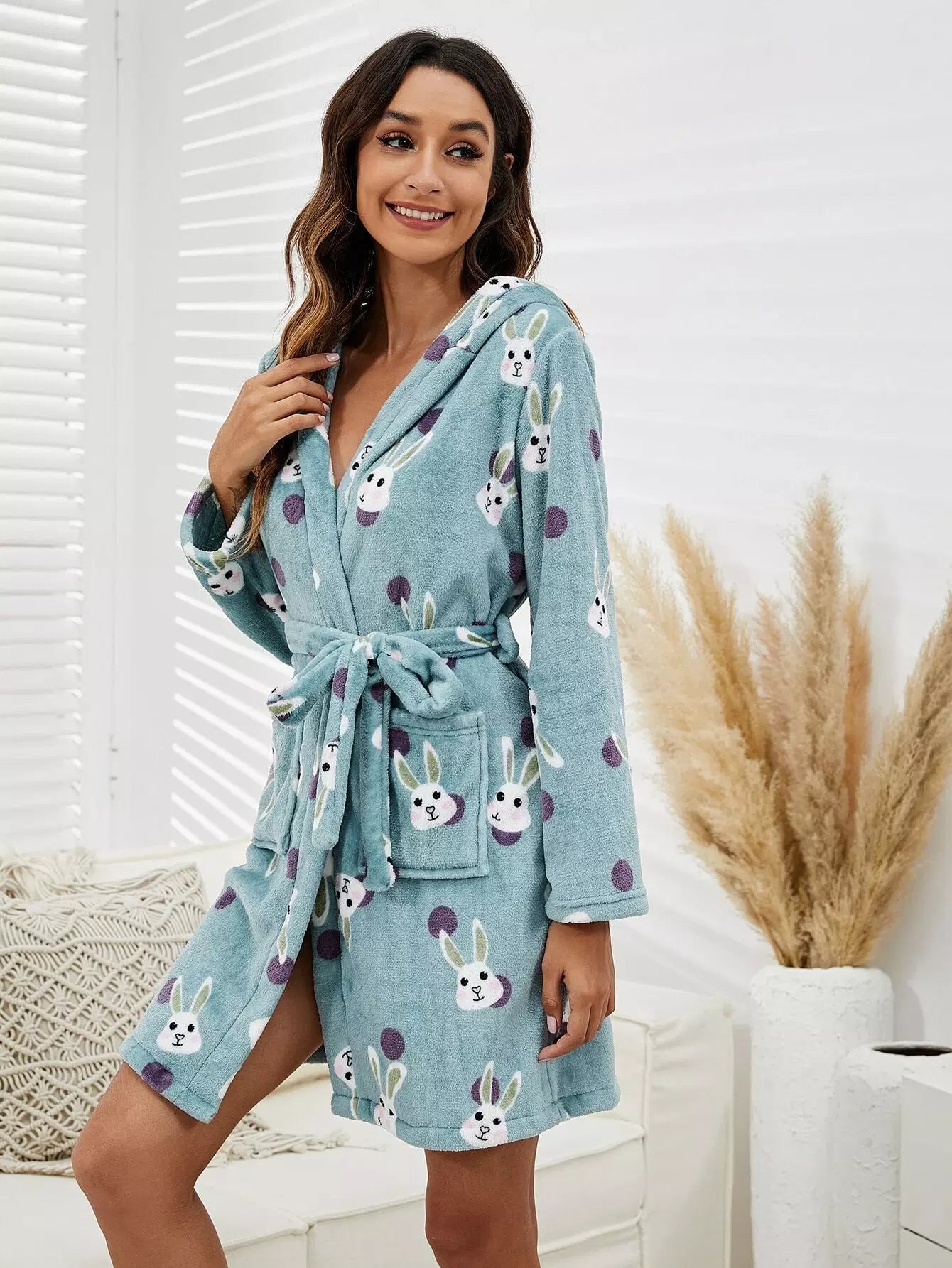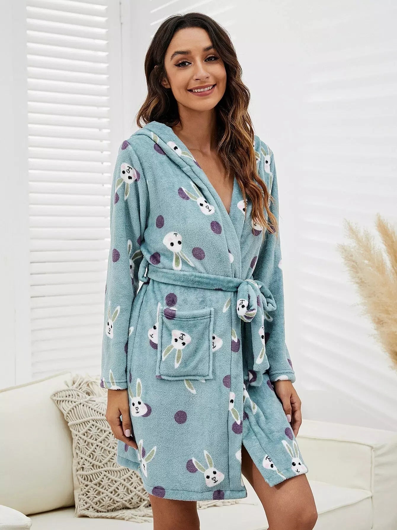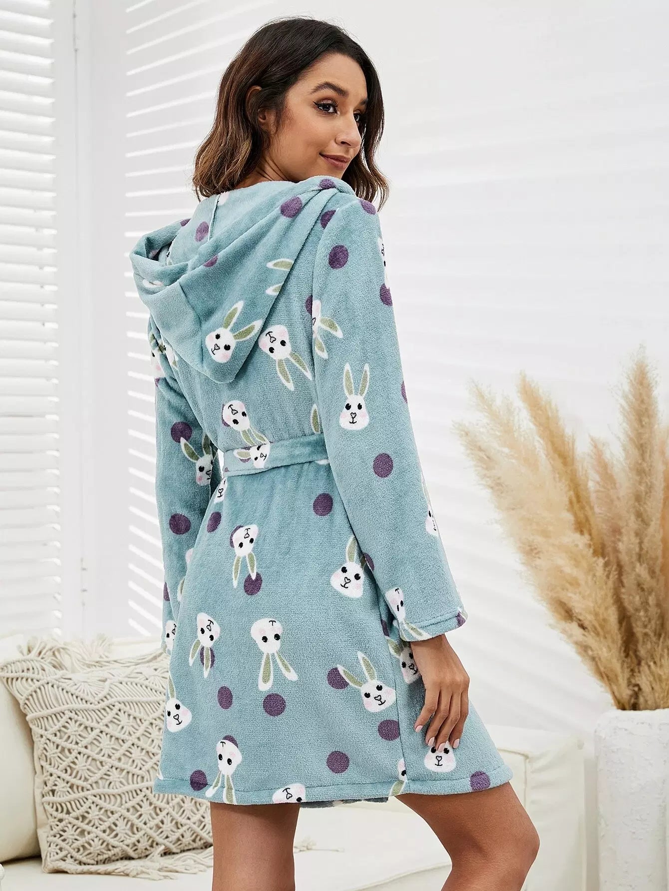 Polka Dot And Rabbit Print Hooded Flannel Robe Without Belt