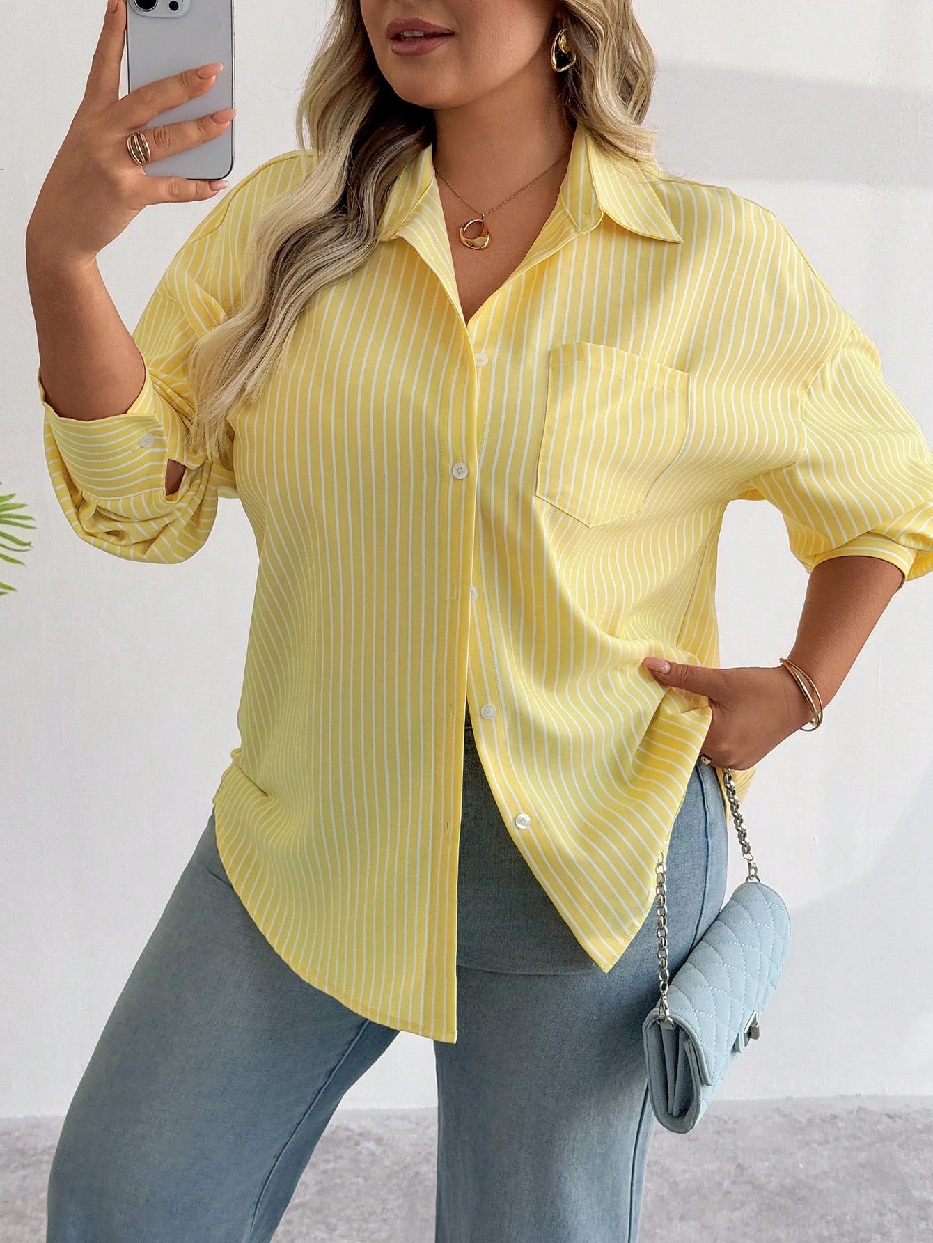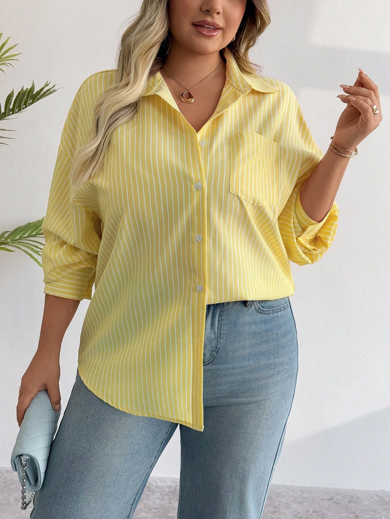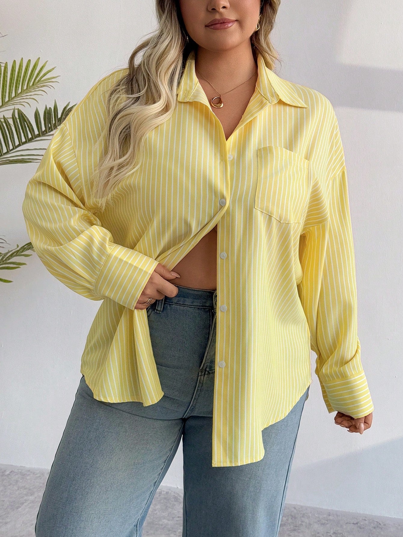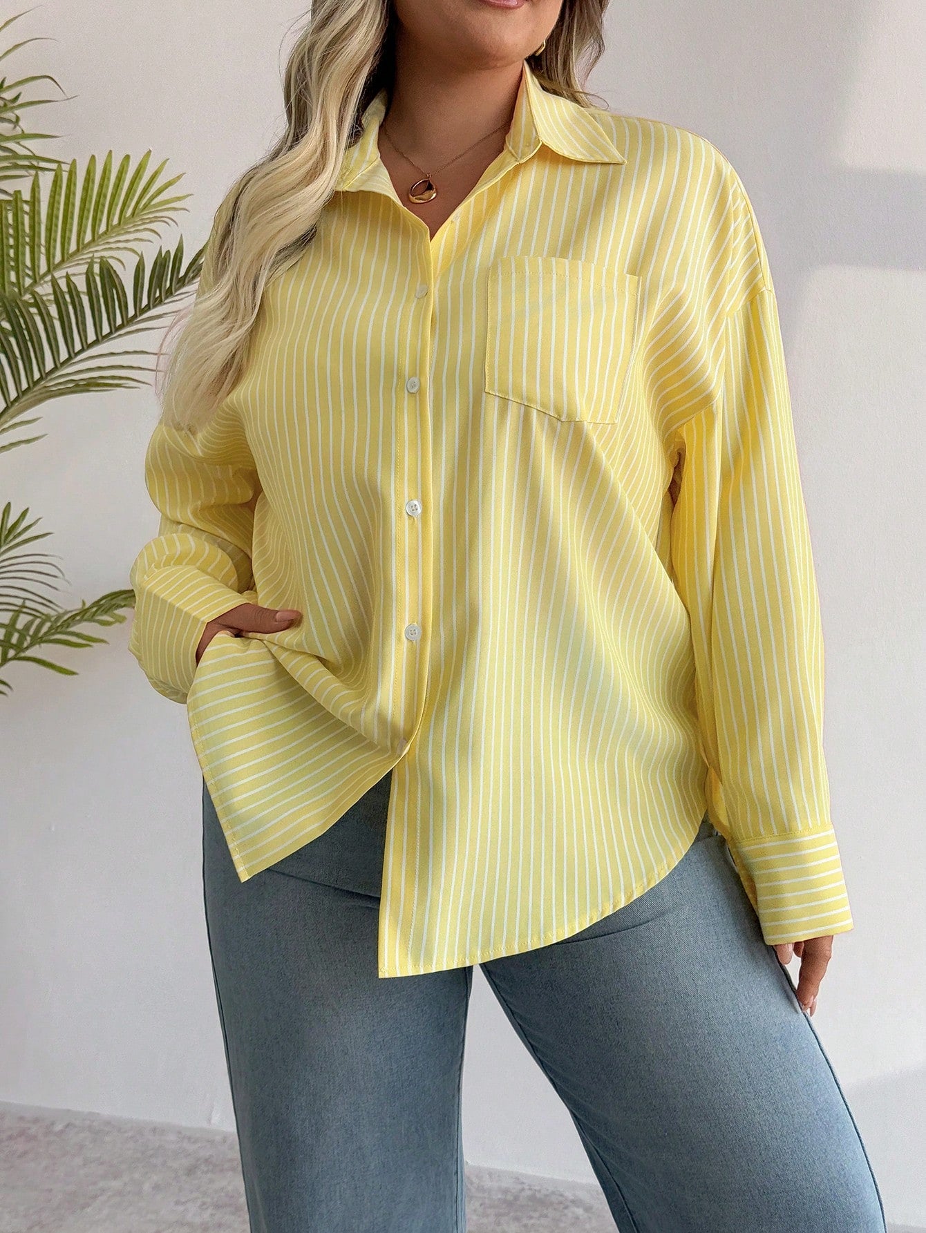 PoPoHouse Women's Plus-Size Shirt Spring Summer Casual Office Commuting Striped Solid Color Front Buckle