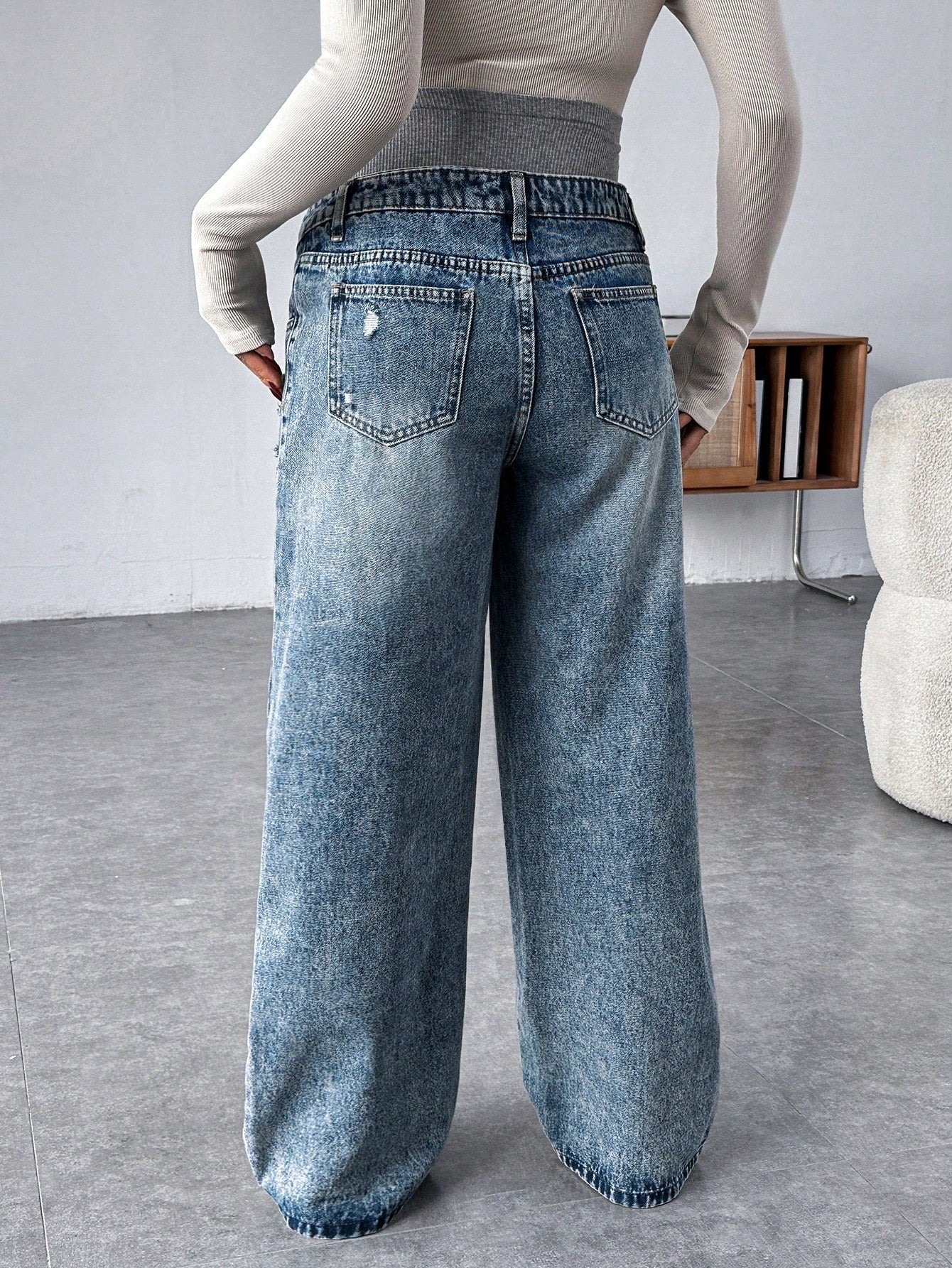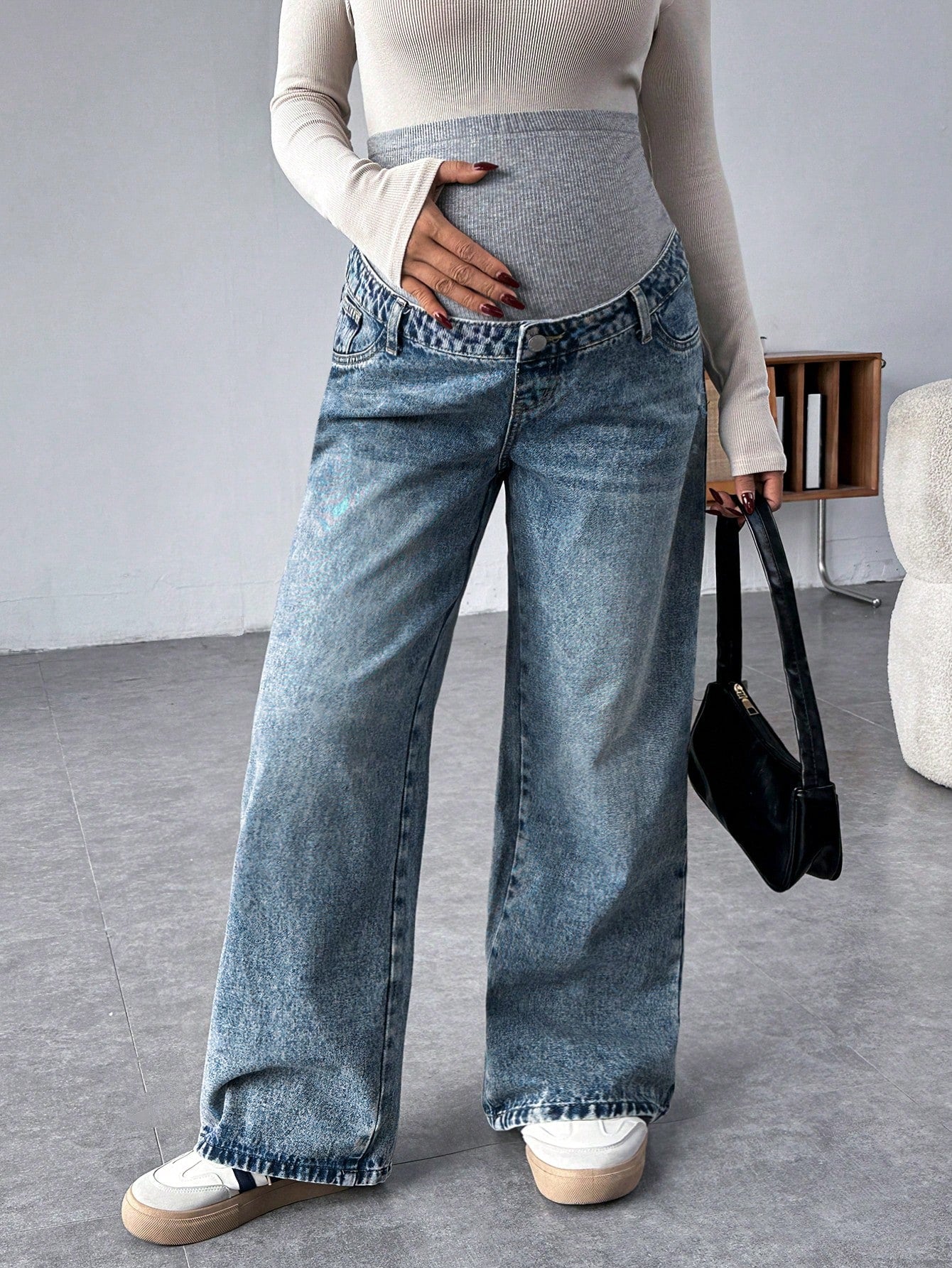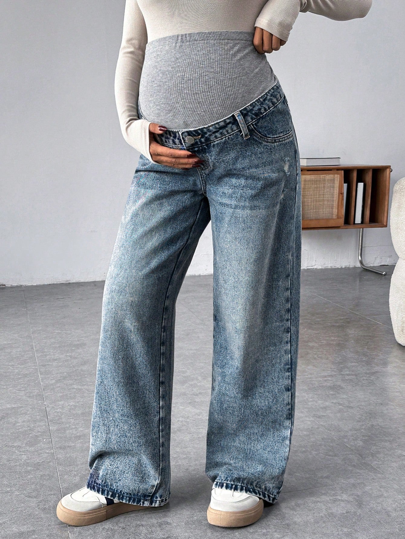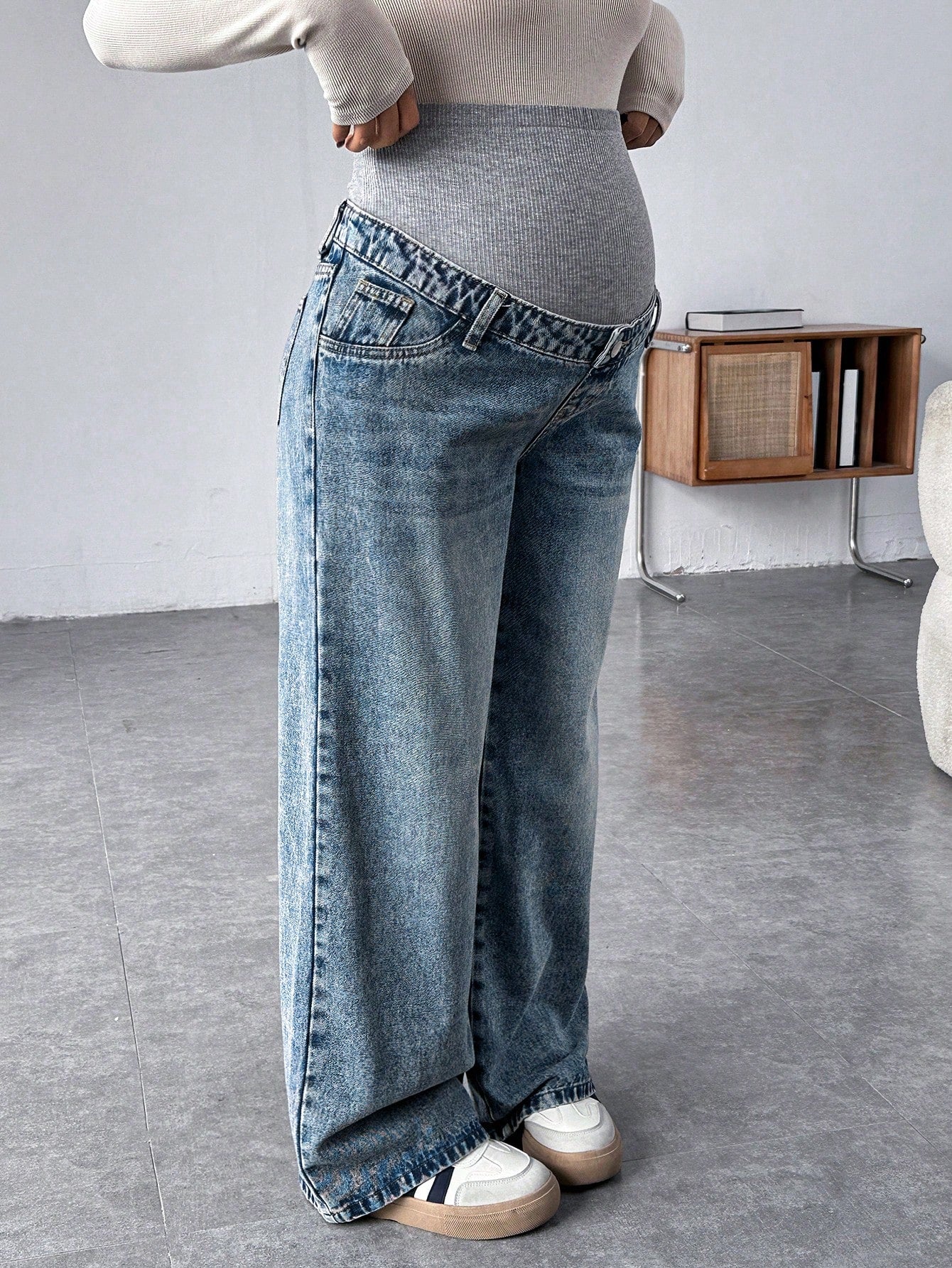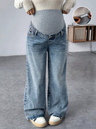 Pregnant Women Knit Panel Vintage Blue Denim Loose Maternity Pants Maternity Jeans