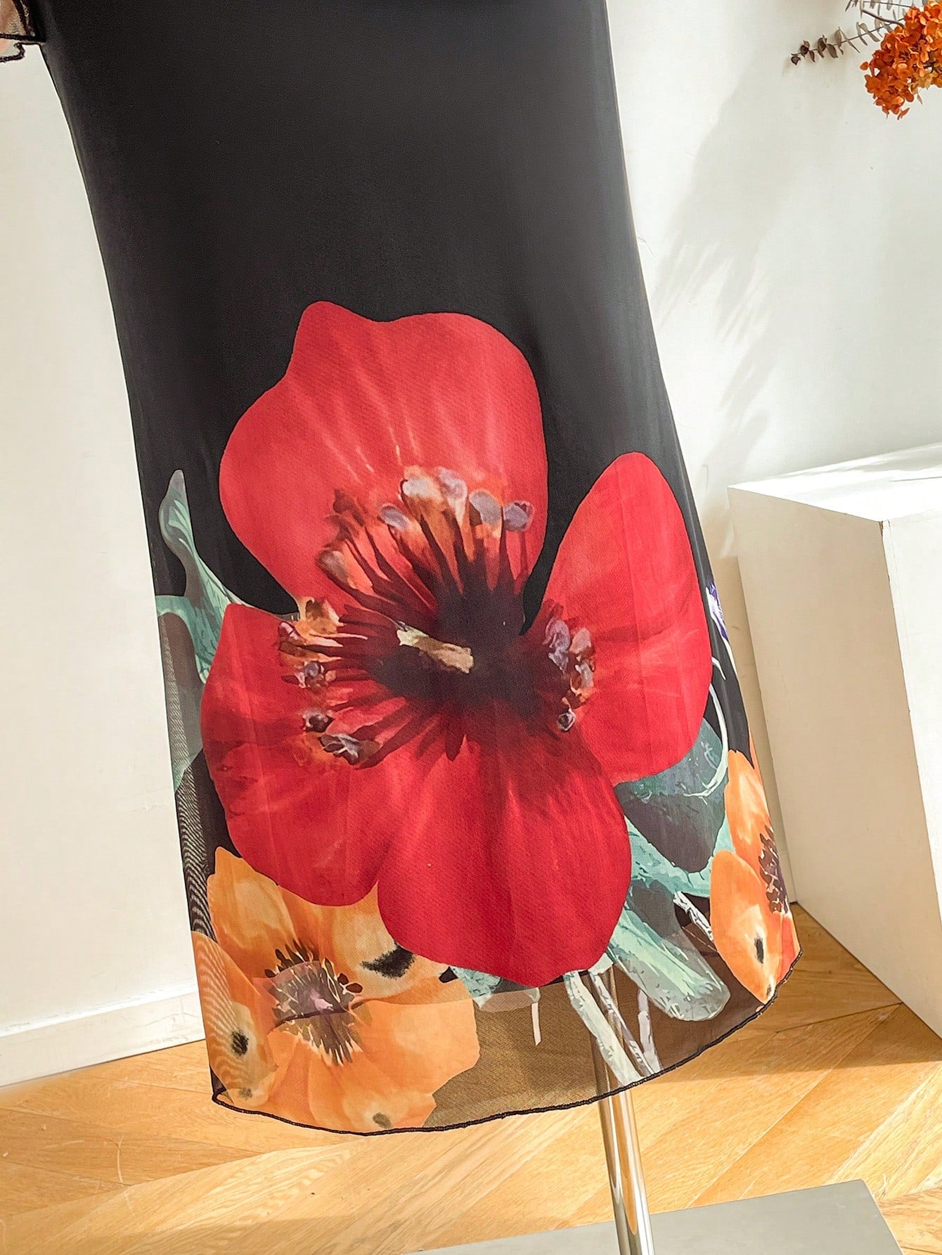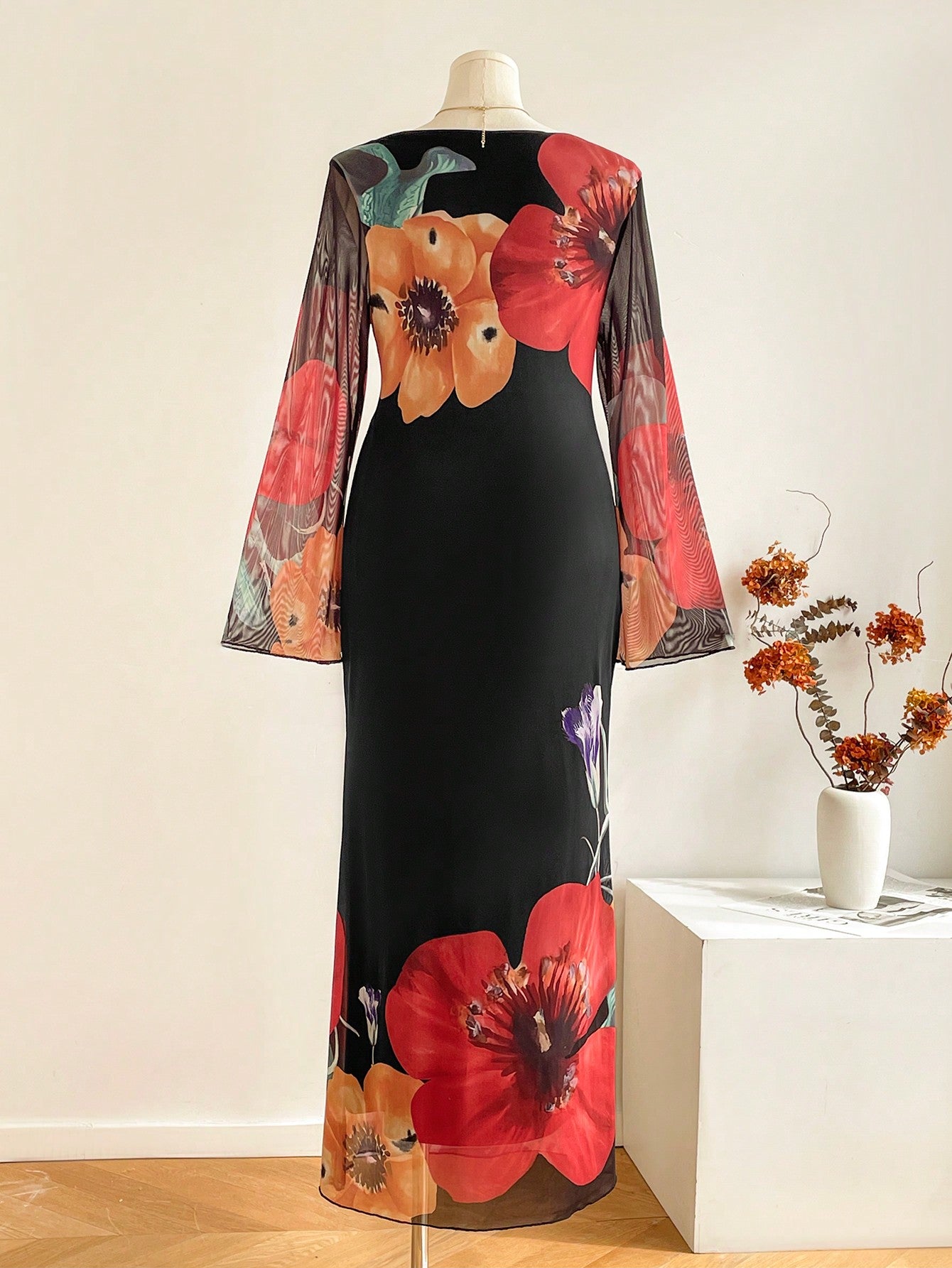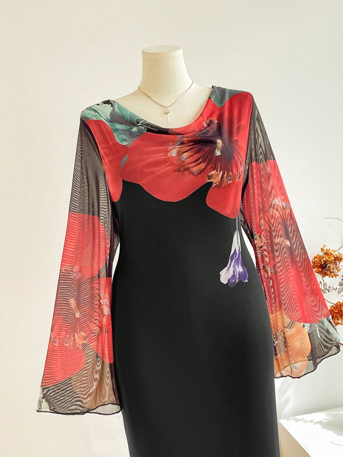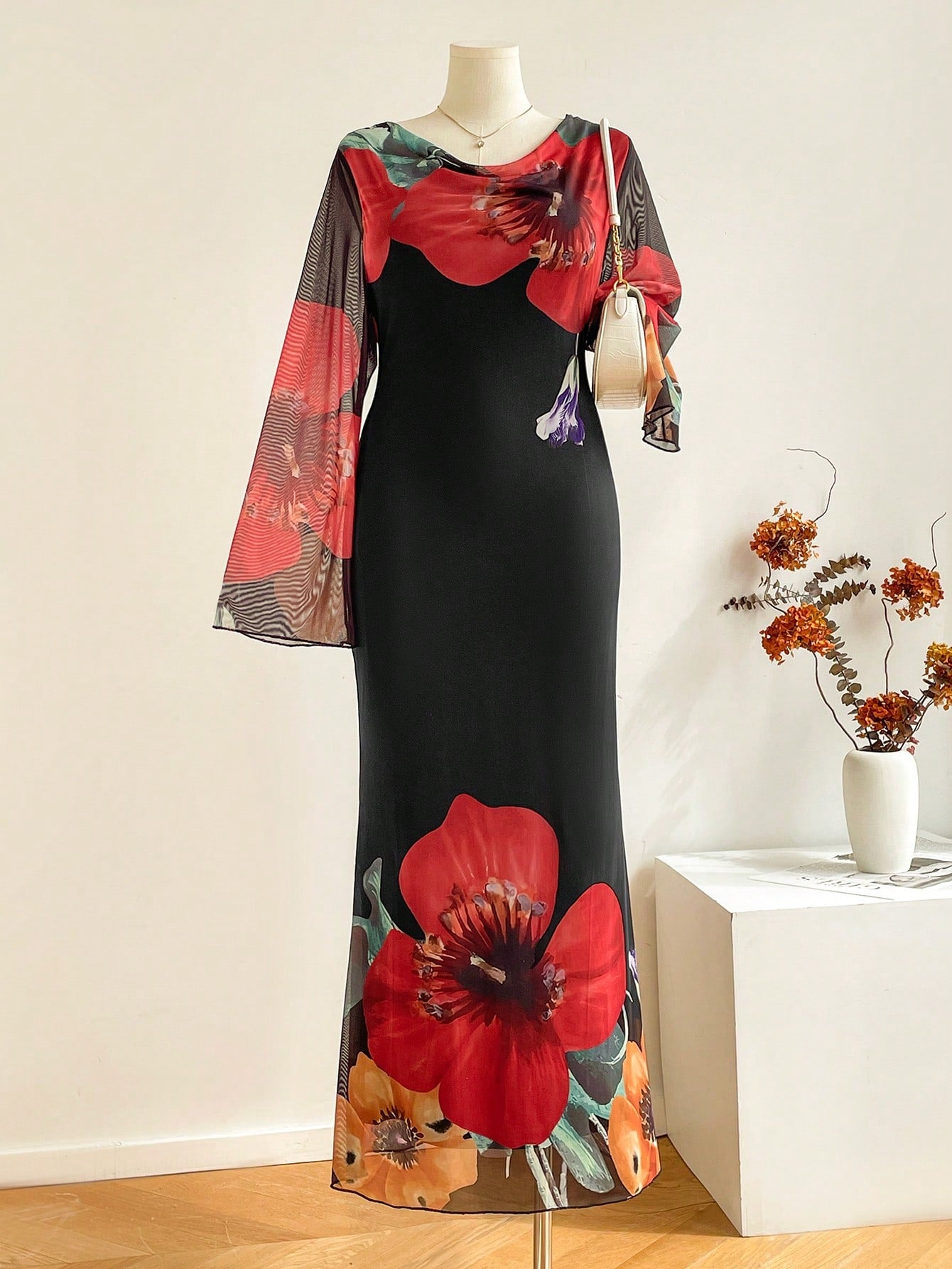 Privï½ Plus Size Women Floral Print Draped Neck Long Sleeve Long Dress
