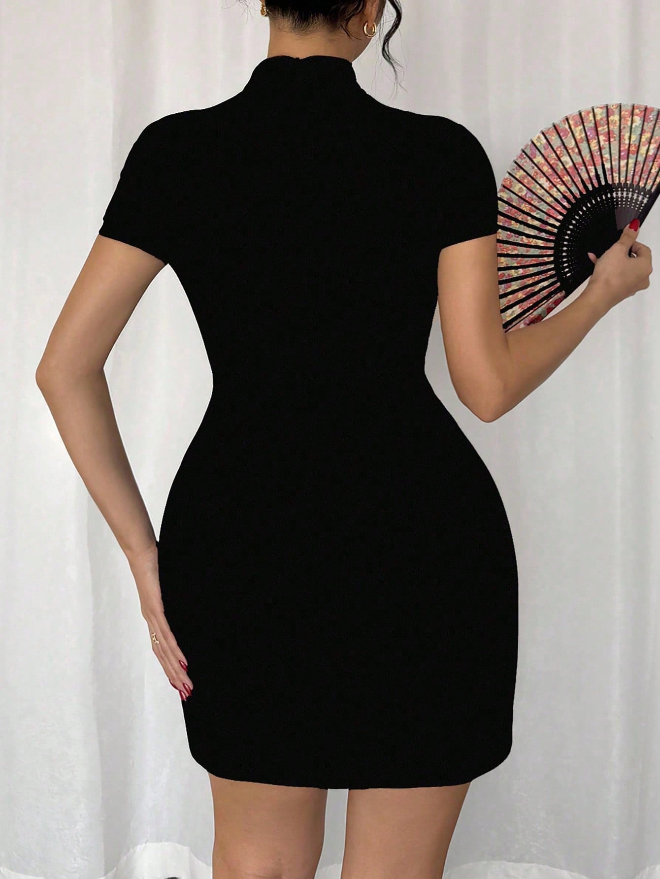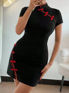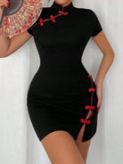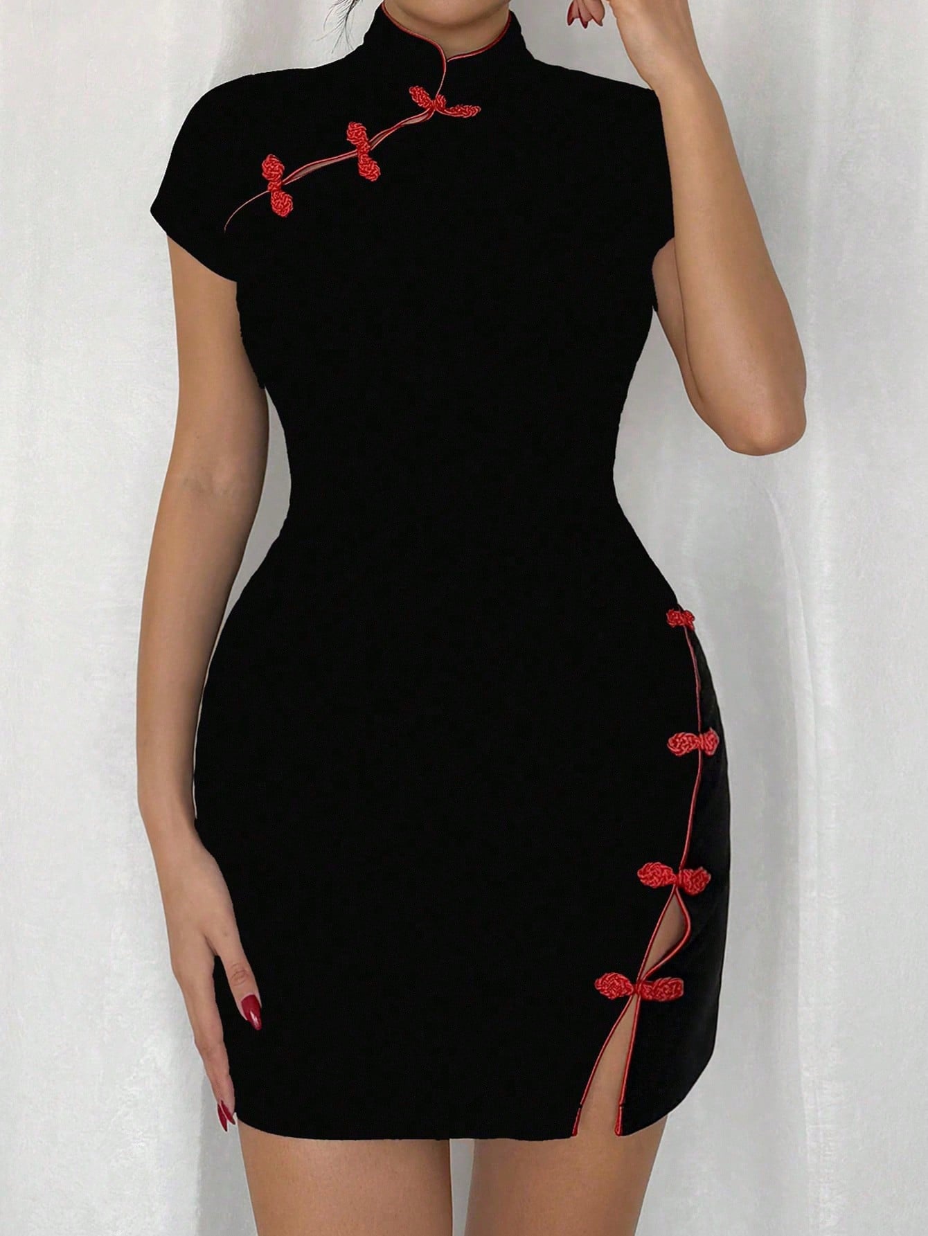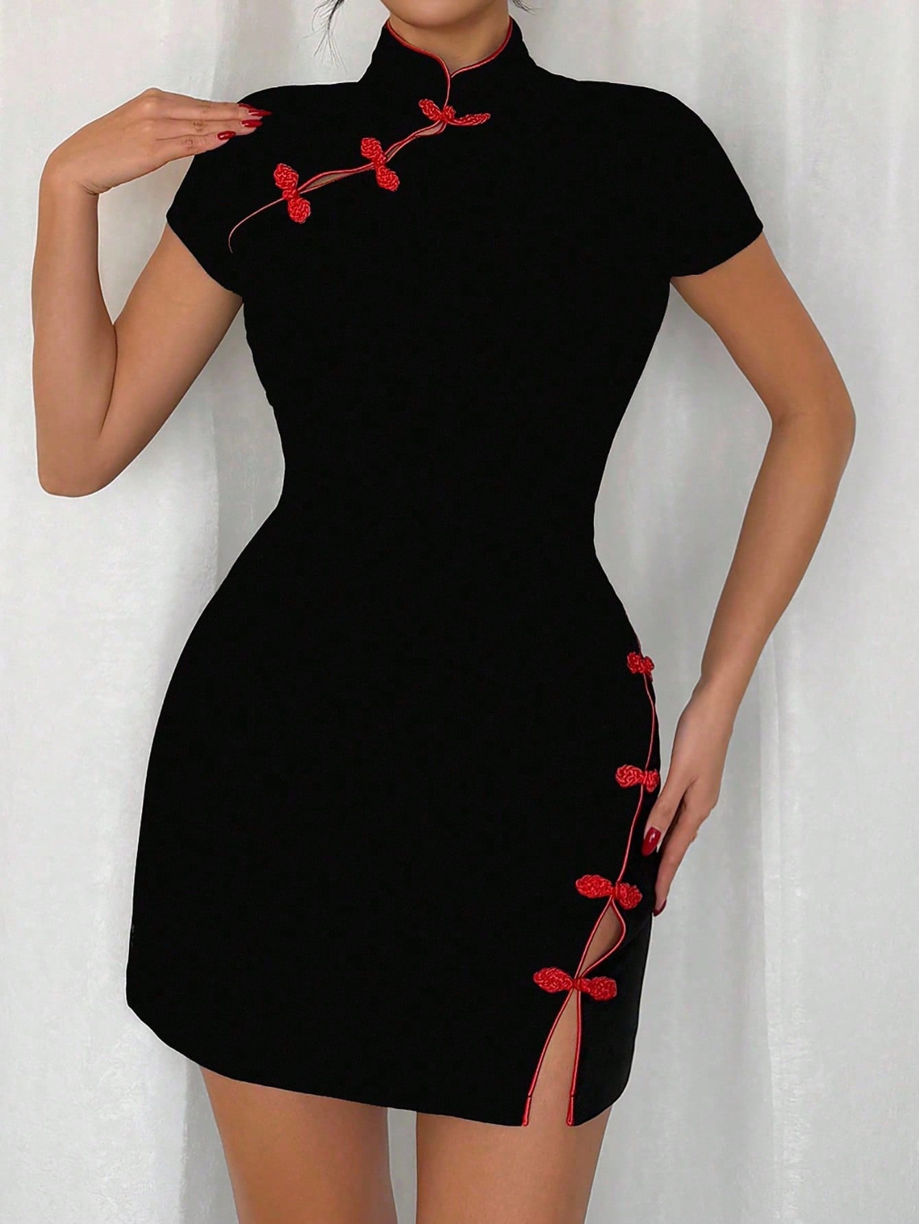 Rafferiza Women Retro Solid Color Stand Collar Patchwork Button Front Split Hem Dress