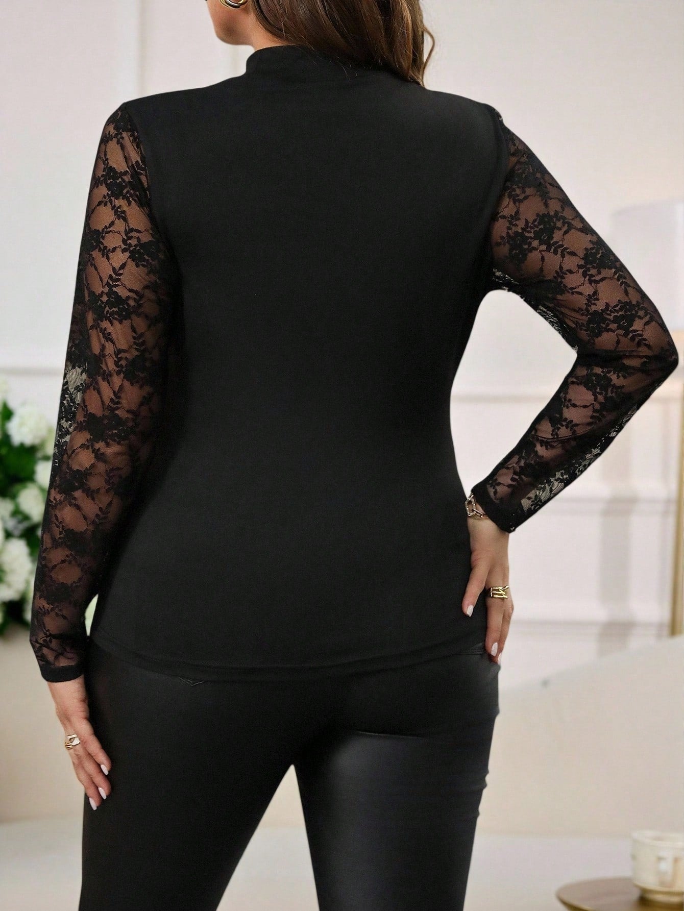 Reflora Plus Size Women Elegant And Sexy Lace Patchwork Asymmetric Collar Semi-Sheer Fitted Knit T-Shirt