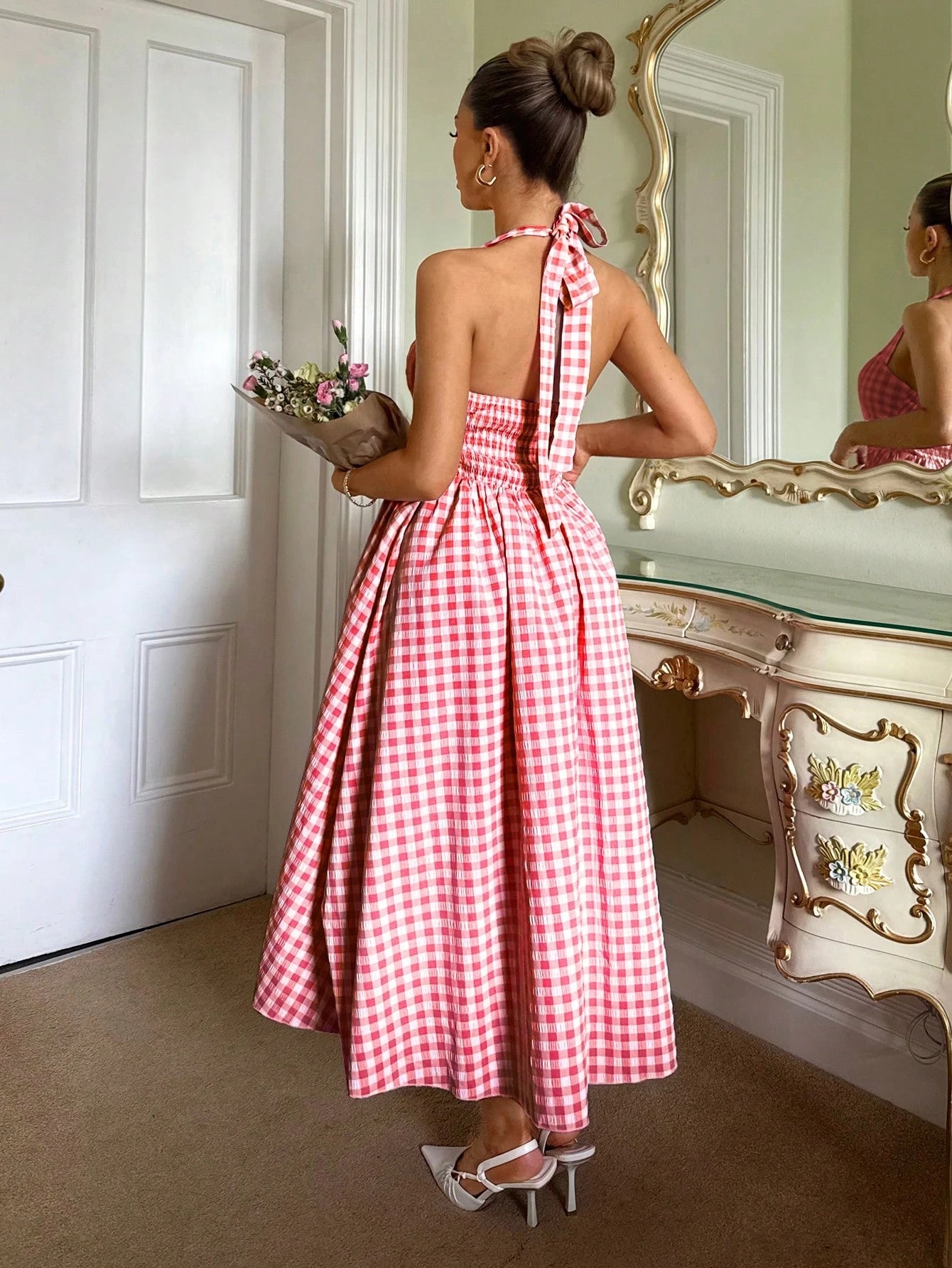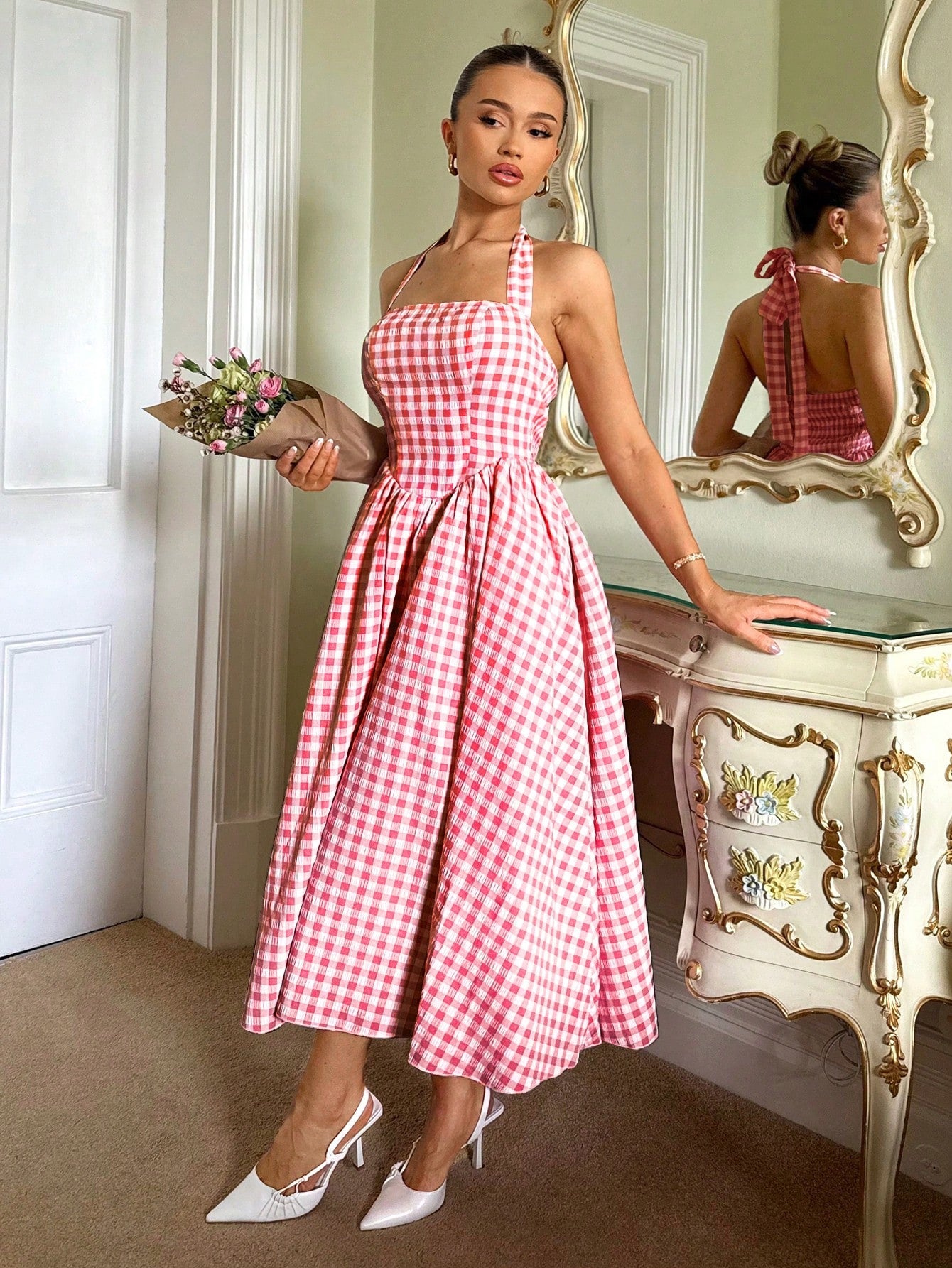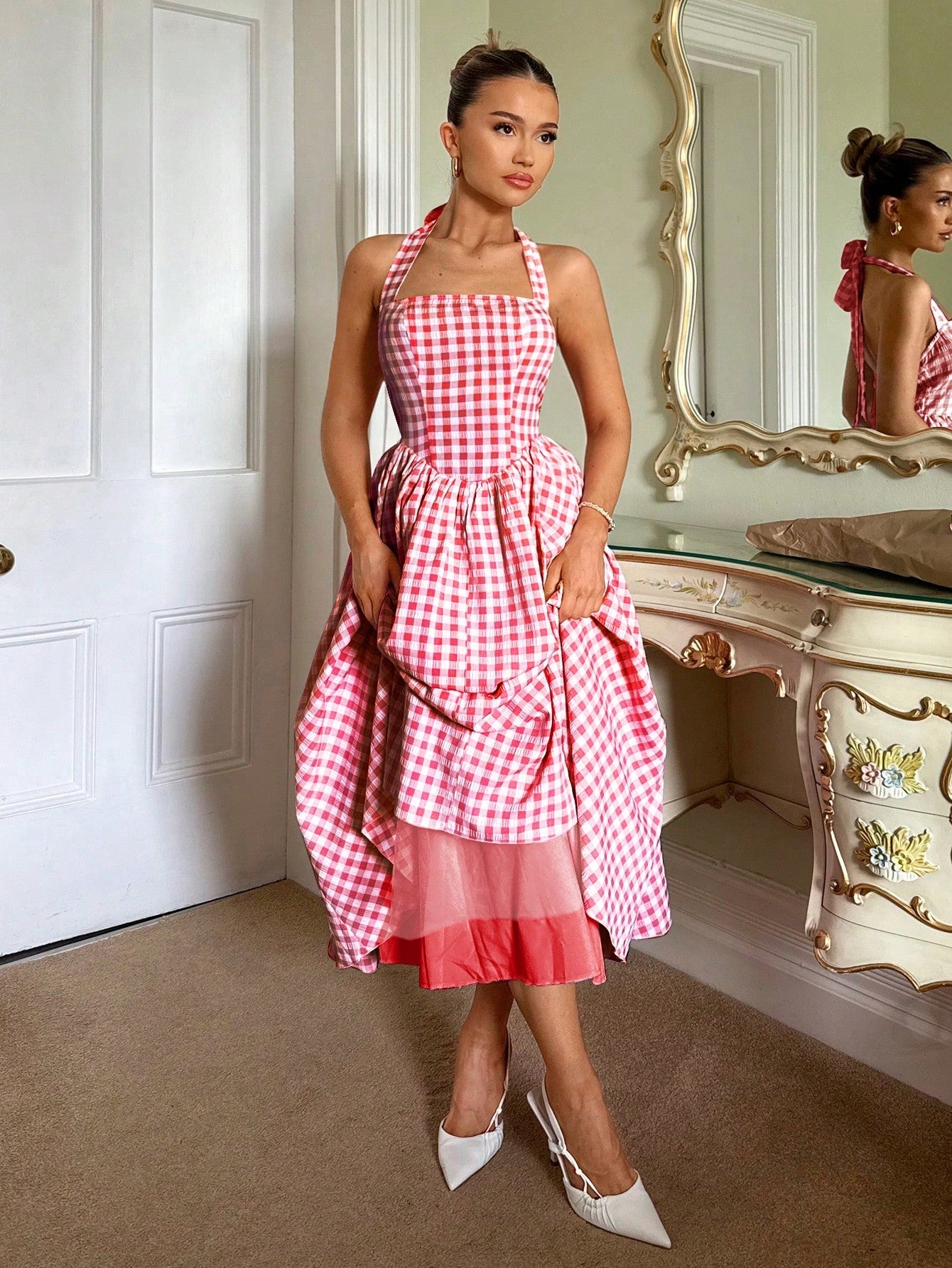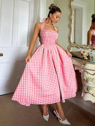 Relinas Spring & Summer Pastoral Princess Style Slim Fit Fluffy Hard Mesh A Swing Plaid Halter Neck Strap