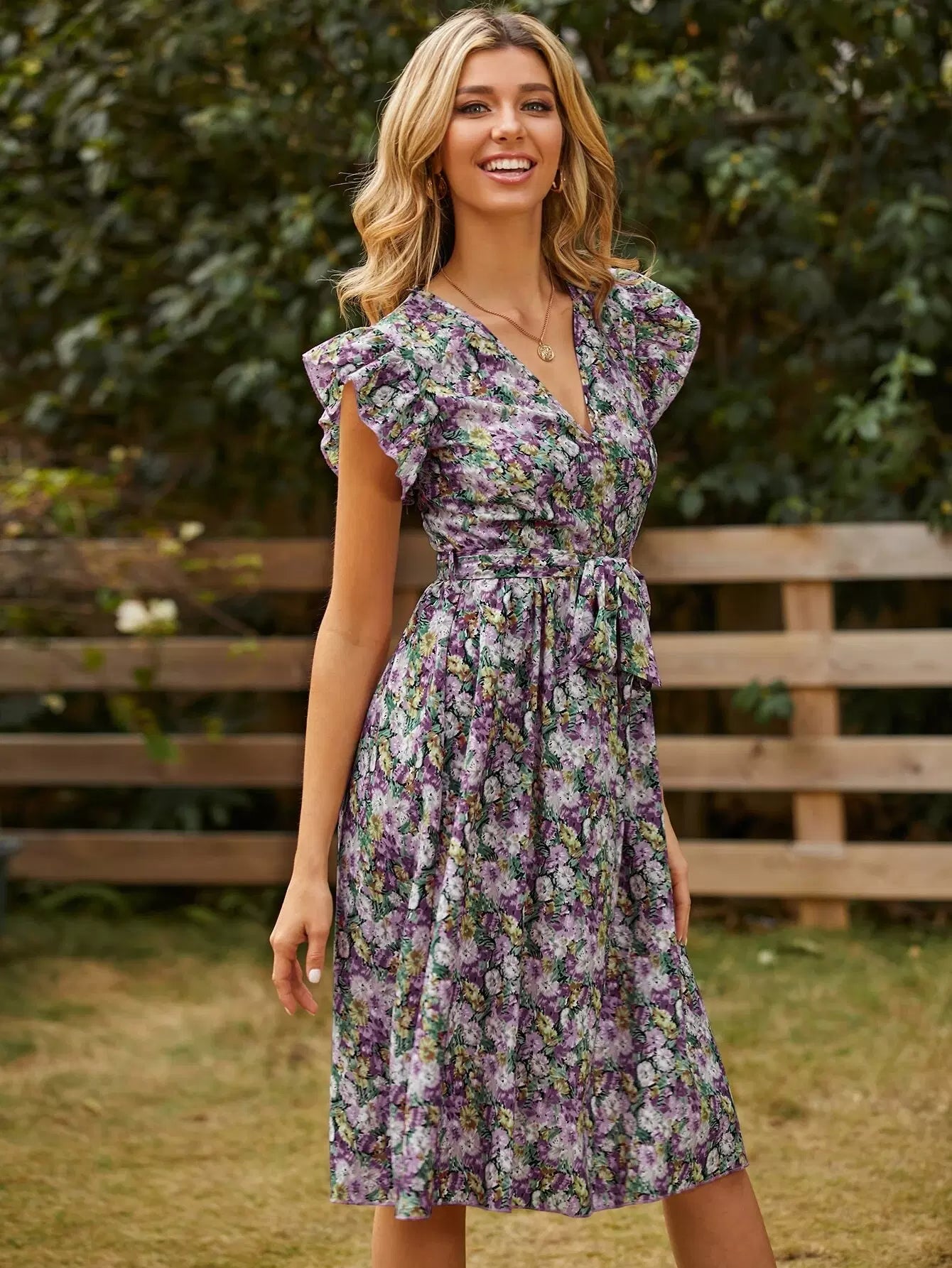 Ruffle Cuff Allover Floral Dress Without Belt