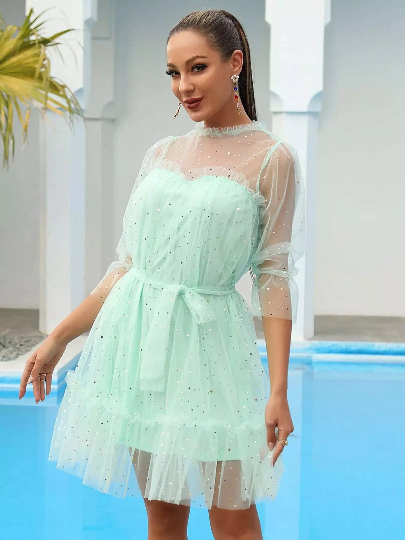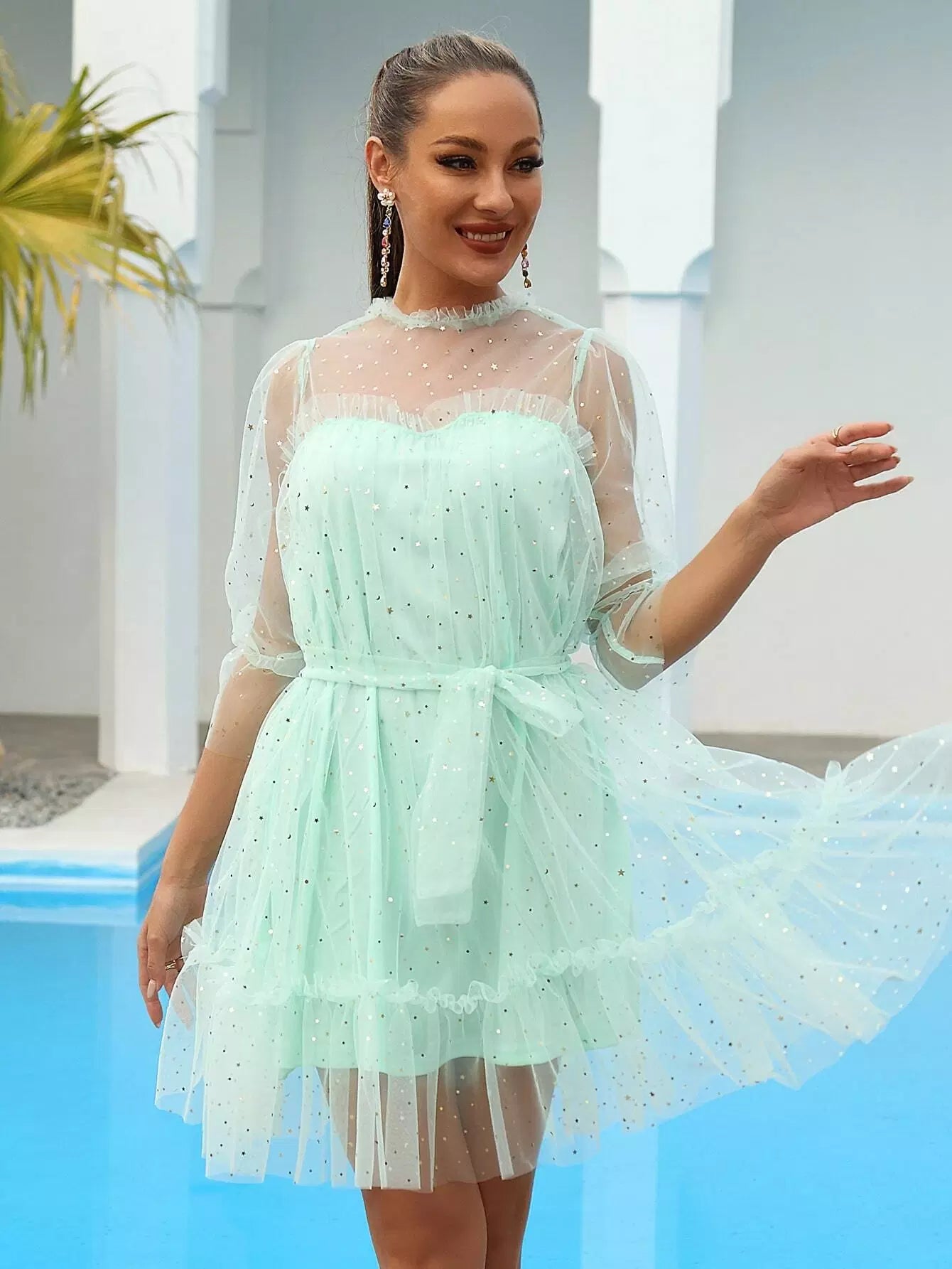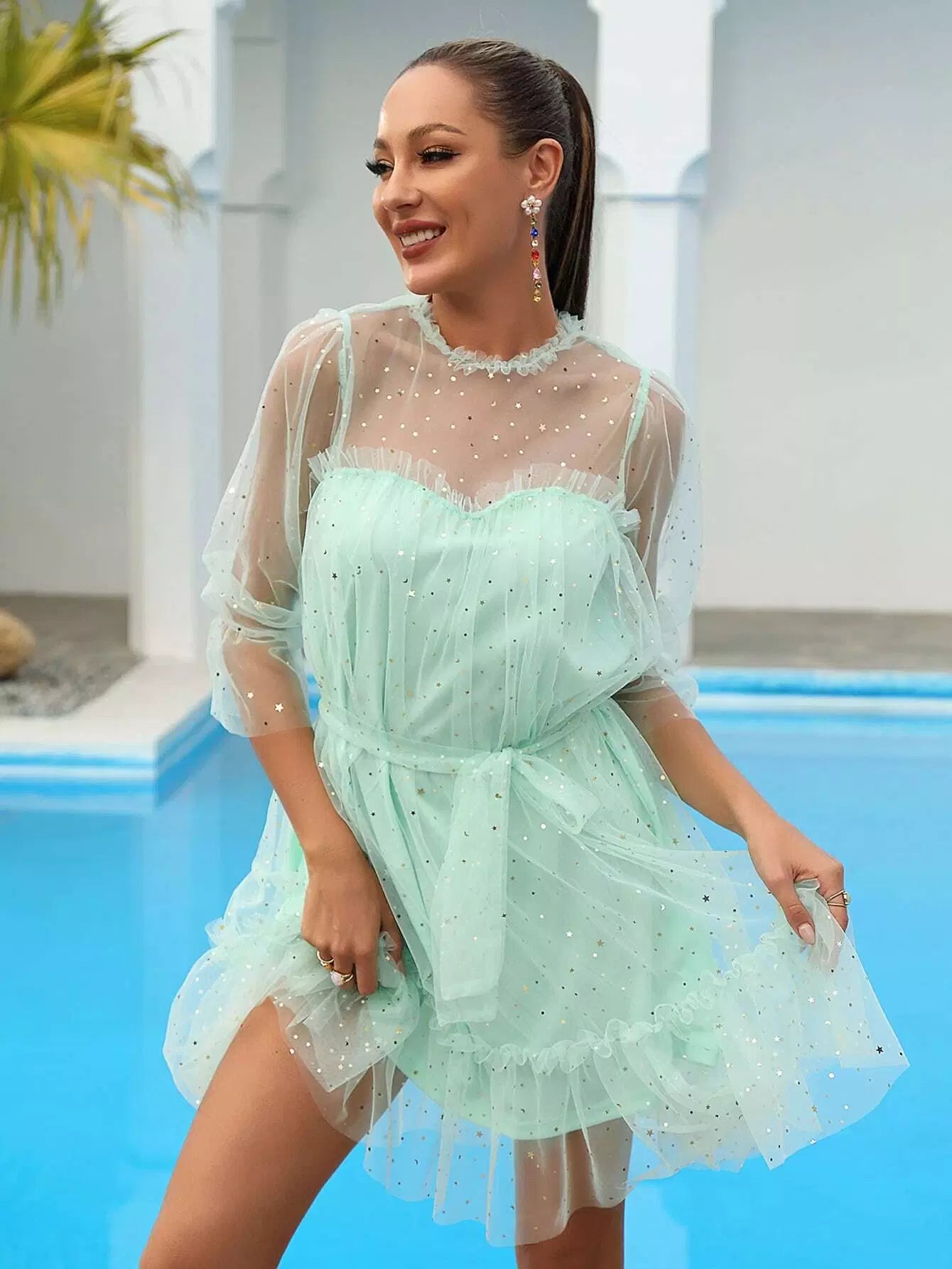 Ruffle Hem Sequin Mesh Dress Without Belt