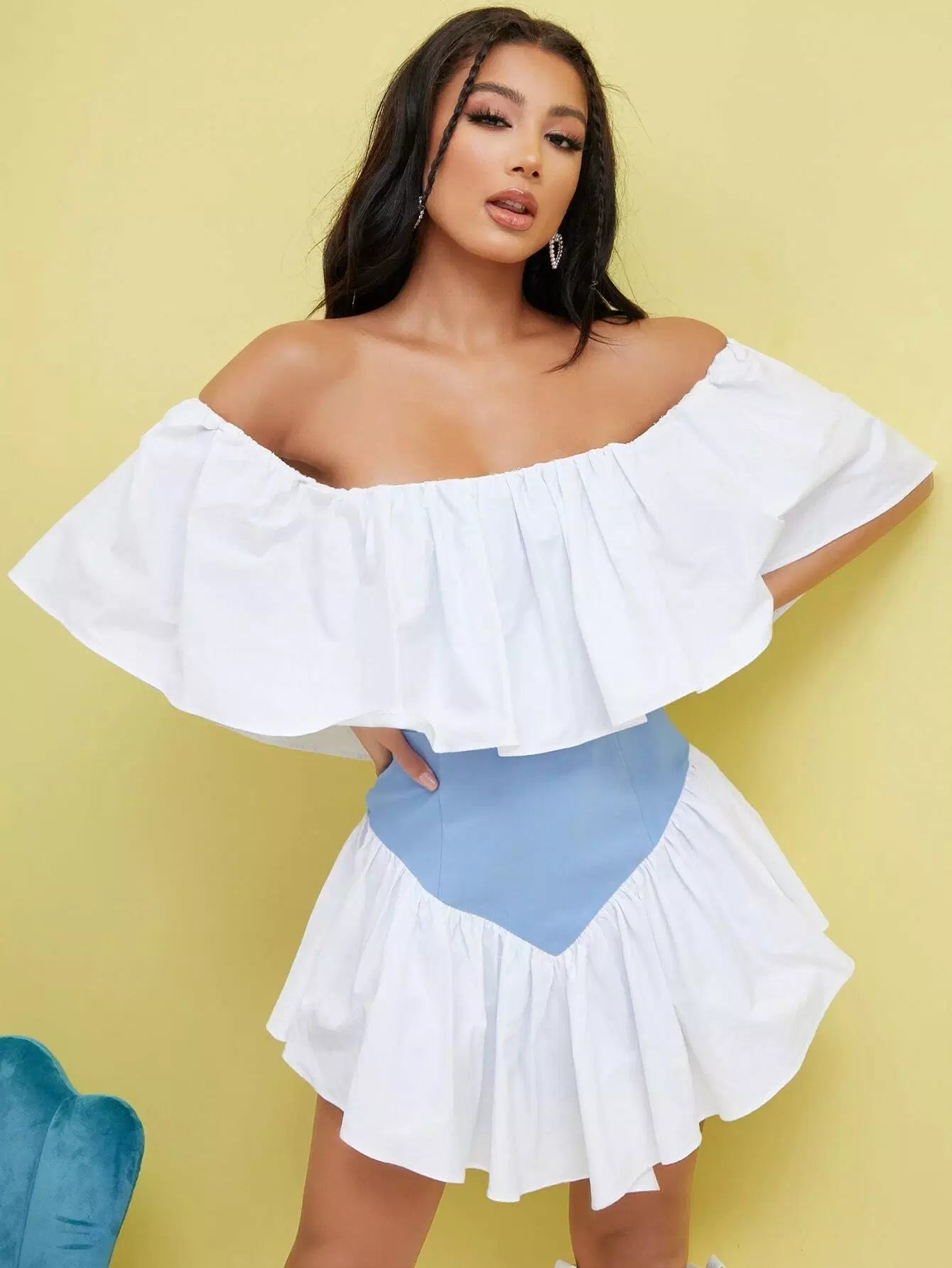 Ruffle Off Shoulder Colorblock Skater Dress