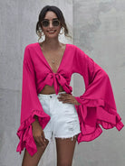 Ruffle Trim Flounce Sleeve Tie Front Crop Top