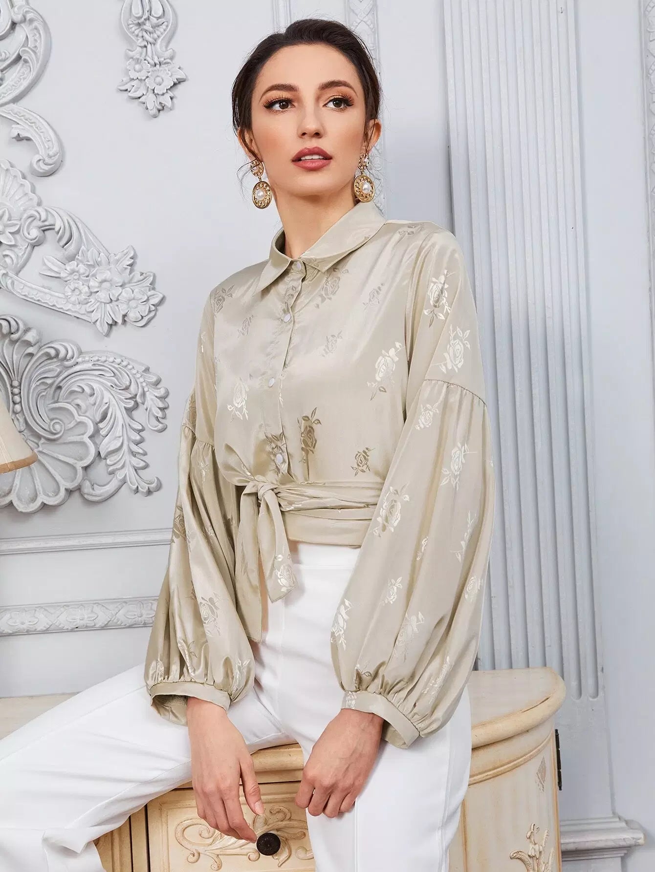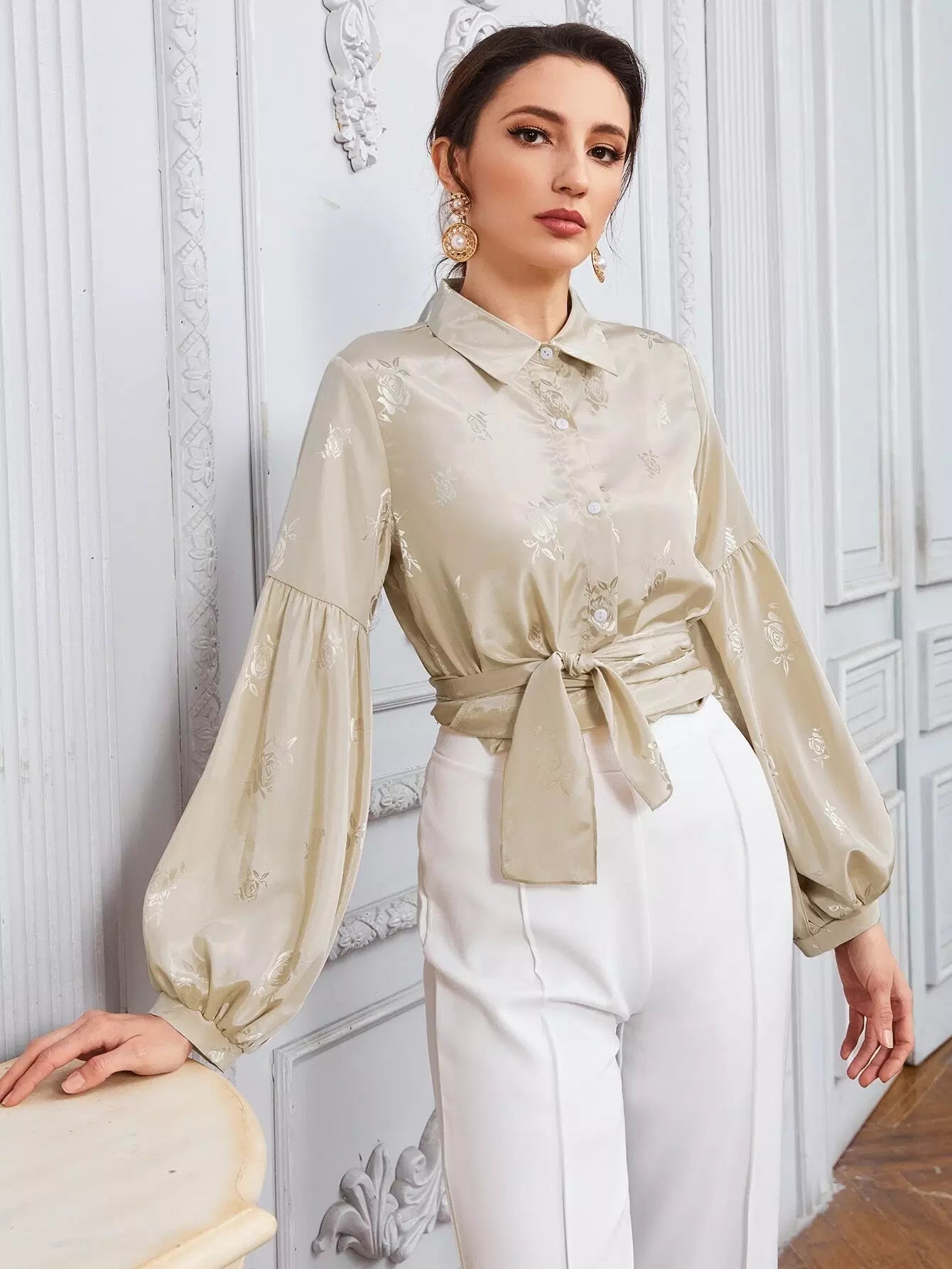 Satin Jacquard Bishop Sleeve Tie Front Shirt