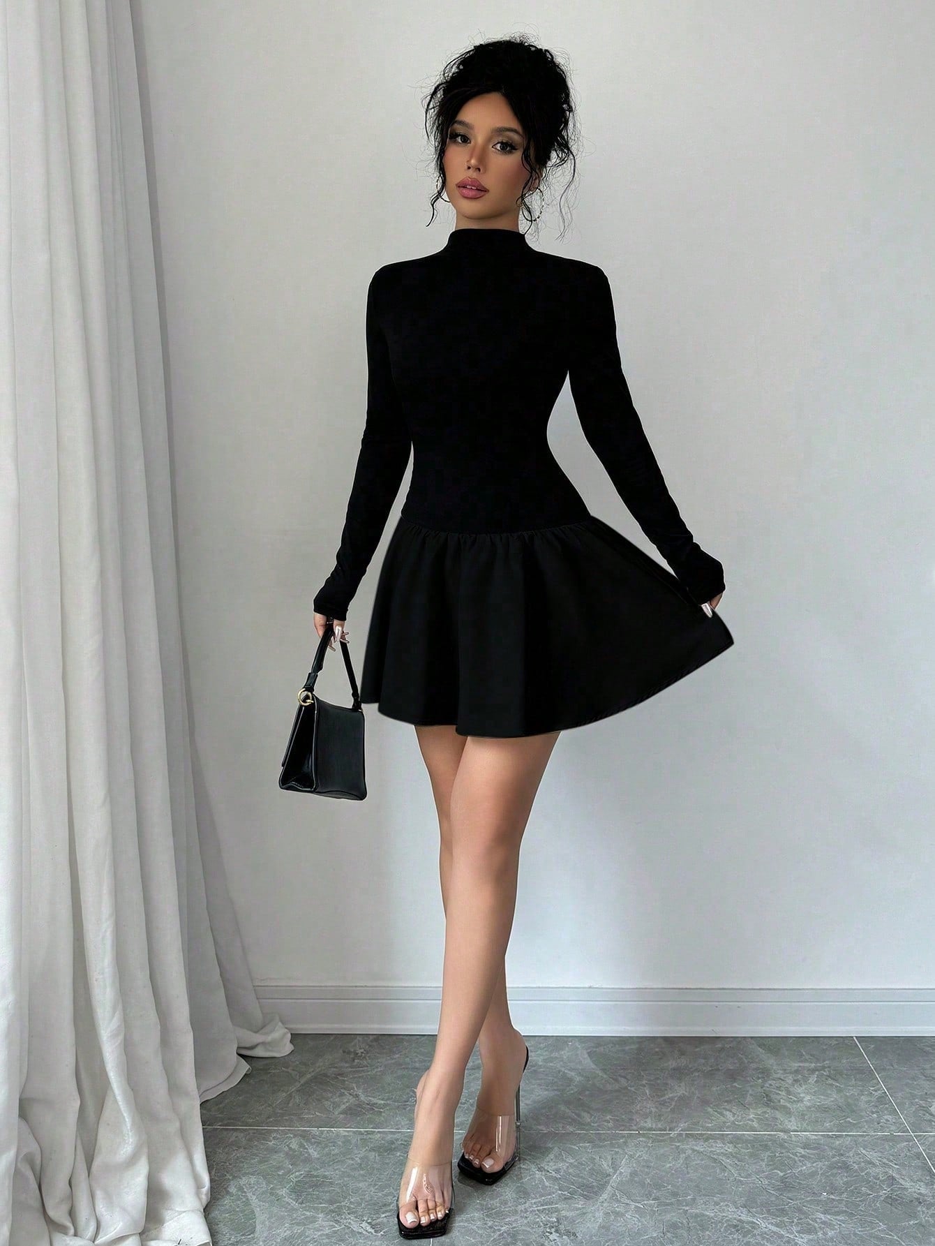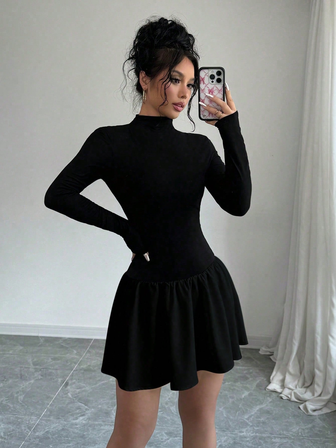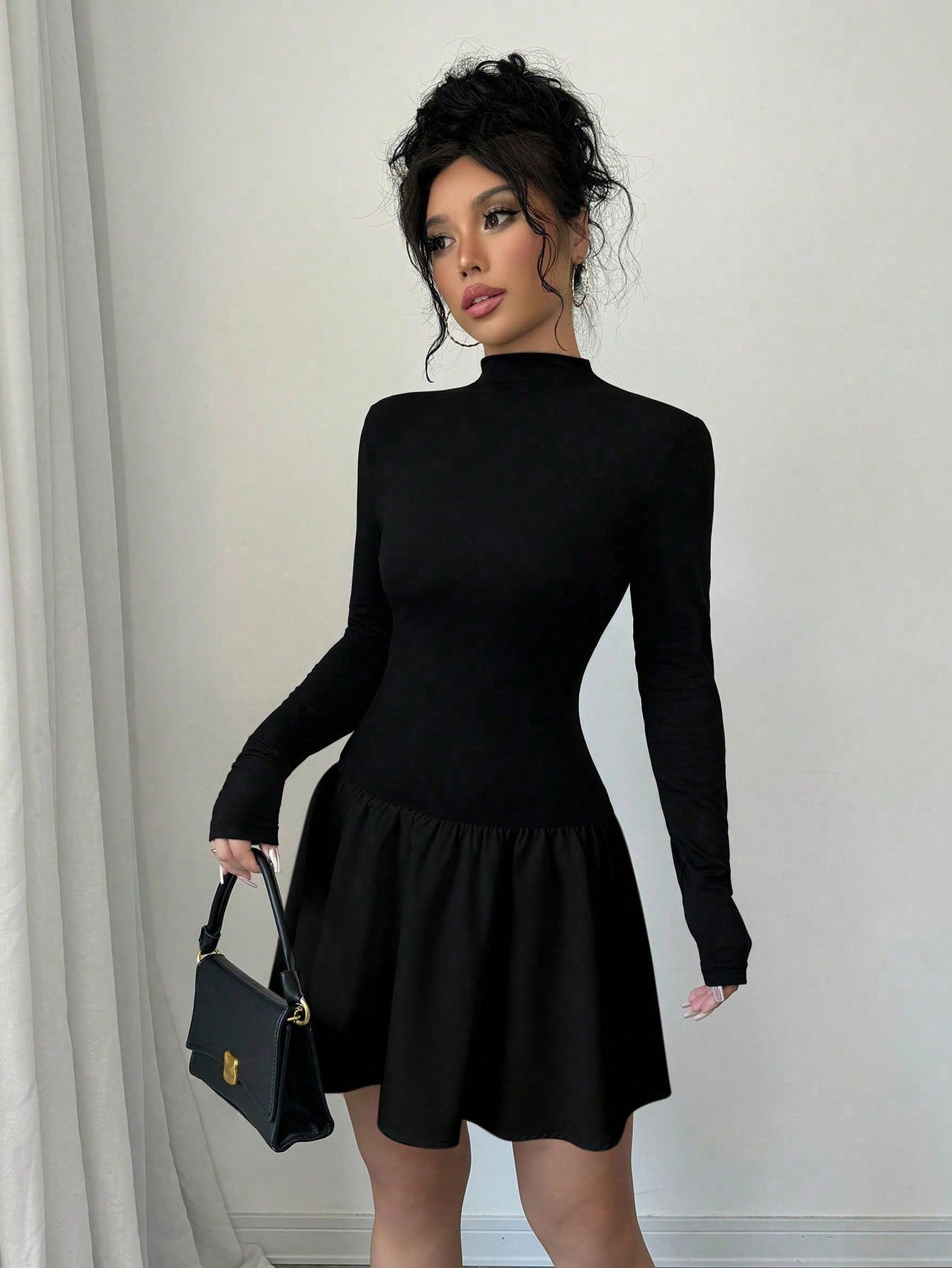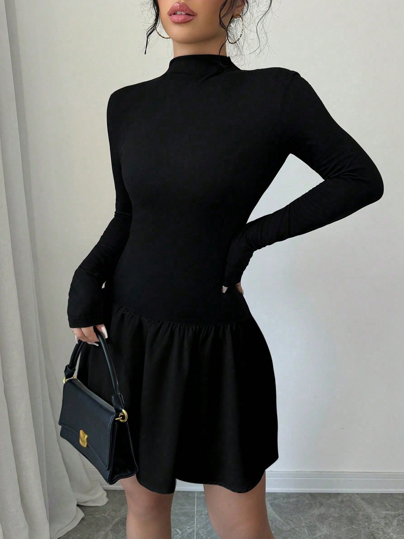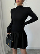 Selianne Women Autumn Solid Color Stand Collar Long Sleeve Ruffle Hem Mini Dress Fall Cloth For Women