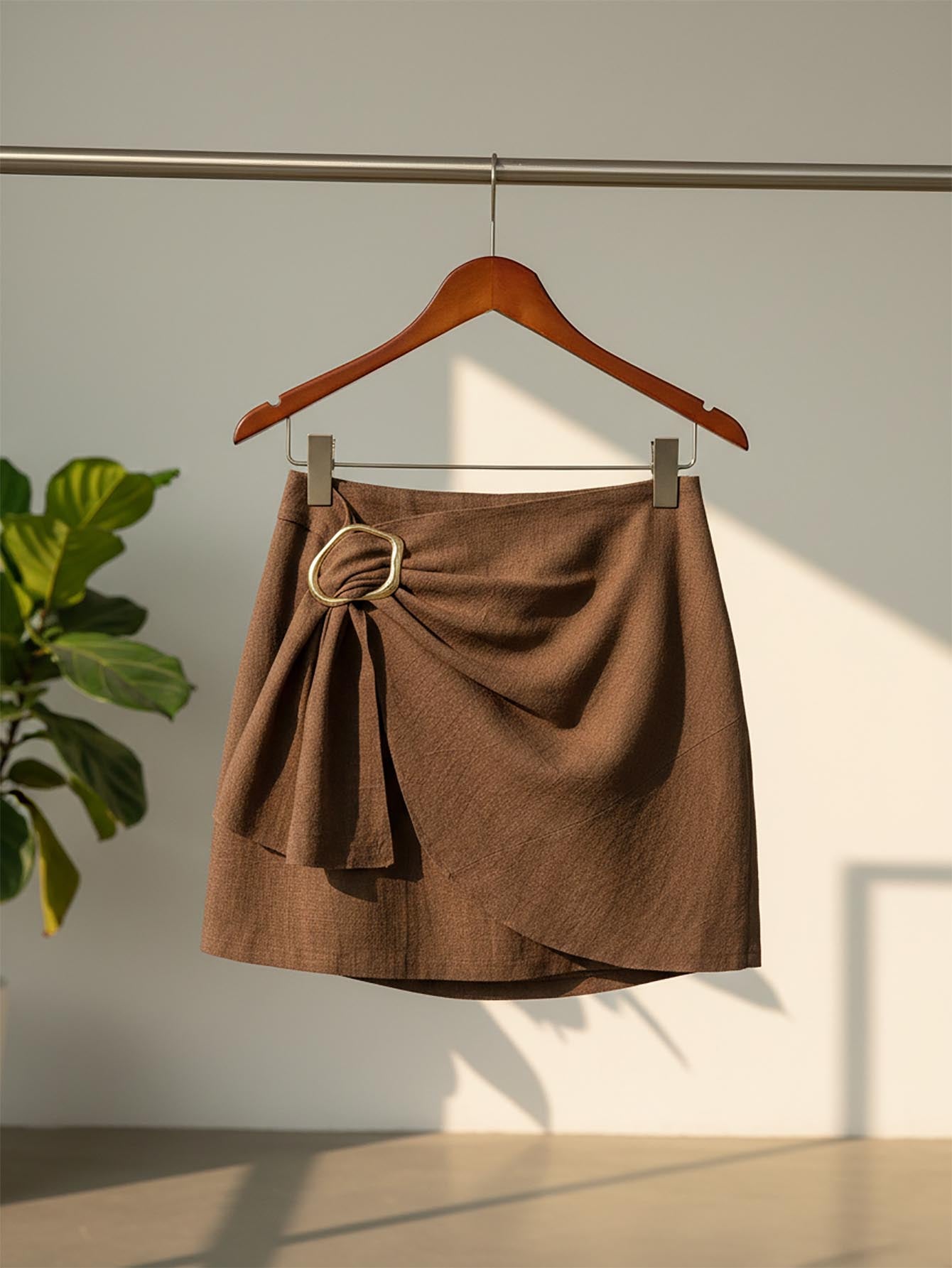 Serisse Women's Solid Color Metal Decor Pleated Mini Skirt Brown Summer Brown Casual