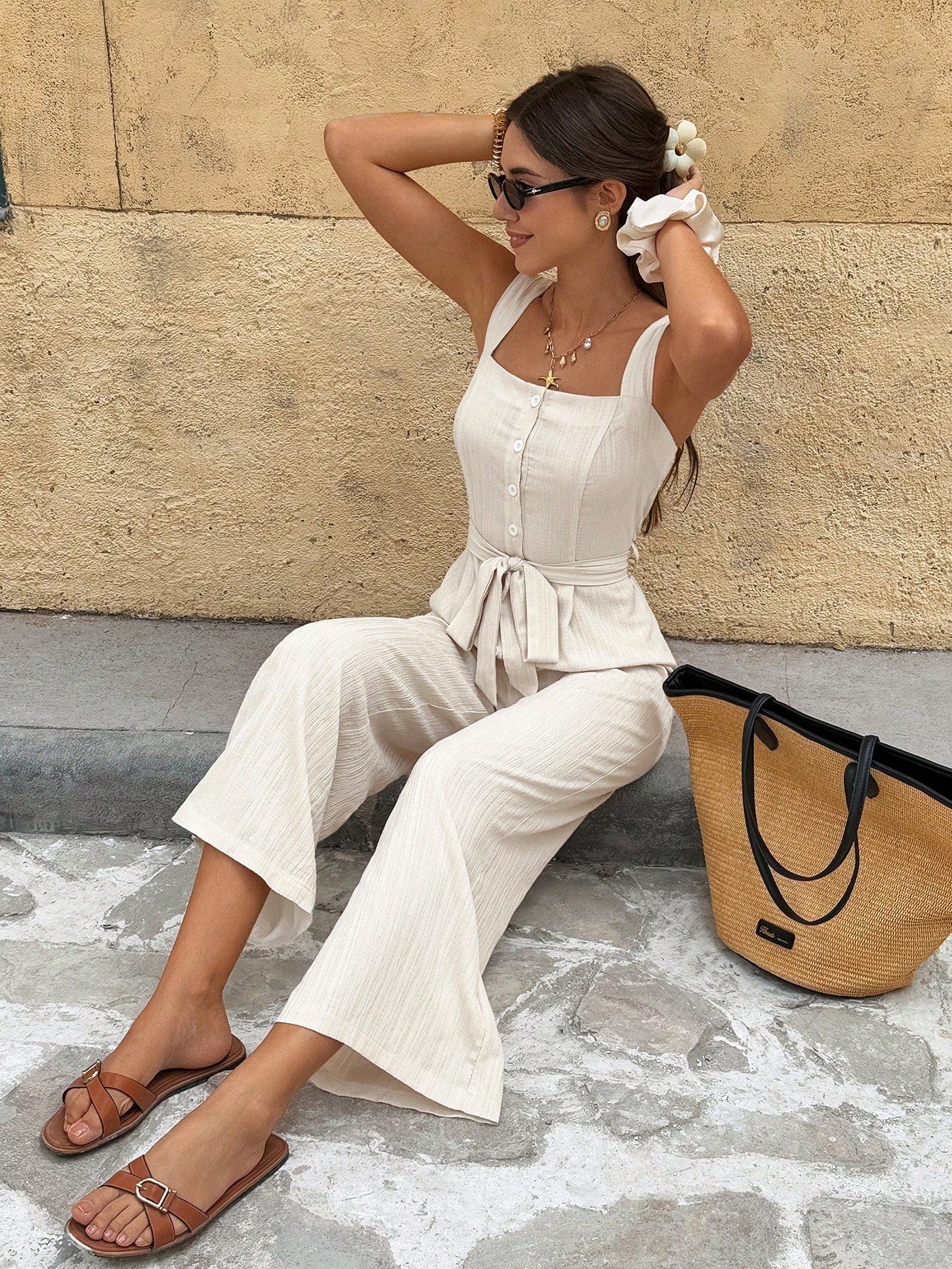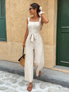 Serisse WWomen's Summer Casual Solid Color Linen Elegant Chic Commuter Front Button Tie-Waist Wide-Leg Jumpsuit