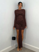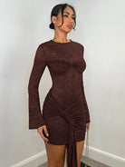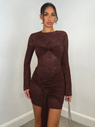 SHEIN BAE Sexy Wine Red Lace Sheer Long Sleeve Ribbon Christmas Dress, Suitable For Club, Date Night,