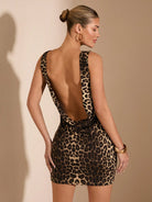 SHEIN BAE Spring & Summer Solid Khaki Leopard Print Sleeveless Backless & Draped Neck Bodycon Mini Dress For Women