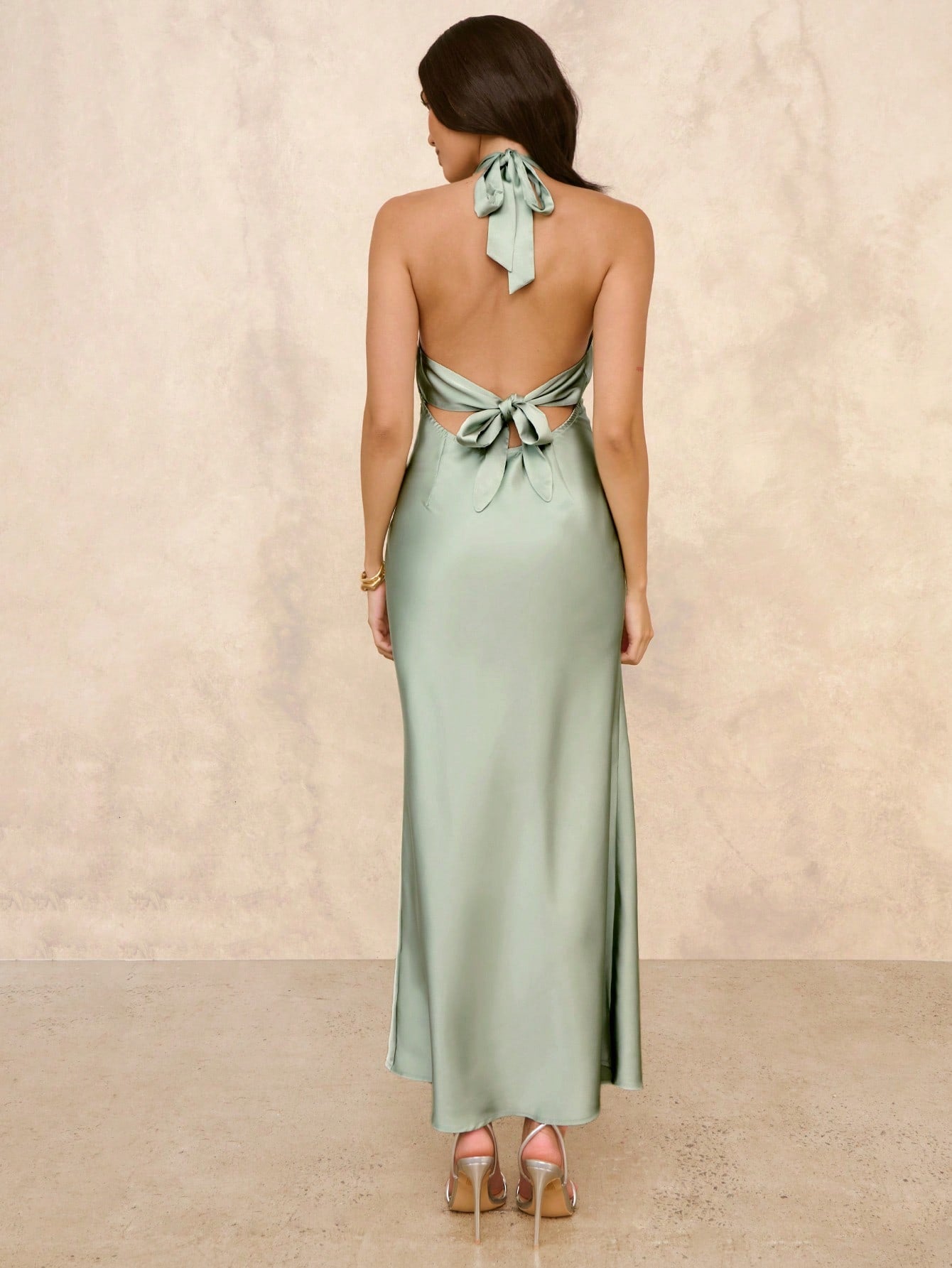 women SHEIN BAE Summer Women's Green Backless Sexy Lace-Up Bow Fishtail Hem Satin Ladies Maxi Dress/Summer Dresses For Women/Prom Dress/Graduation Dress/Wedding Guest Dress Women