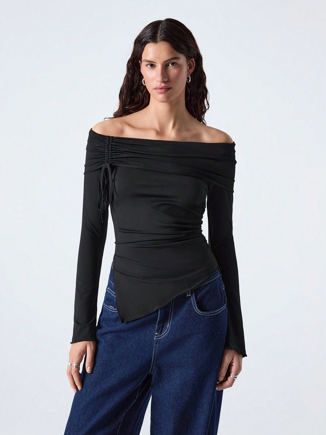 SHEIN EZwear Women's Solid Color Off Shoulder Long Sleeve Pleated Casual T-Shirt Top