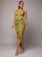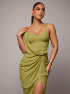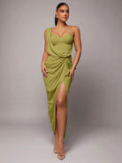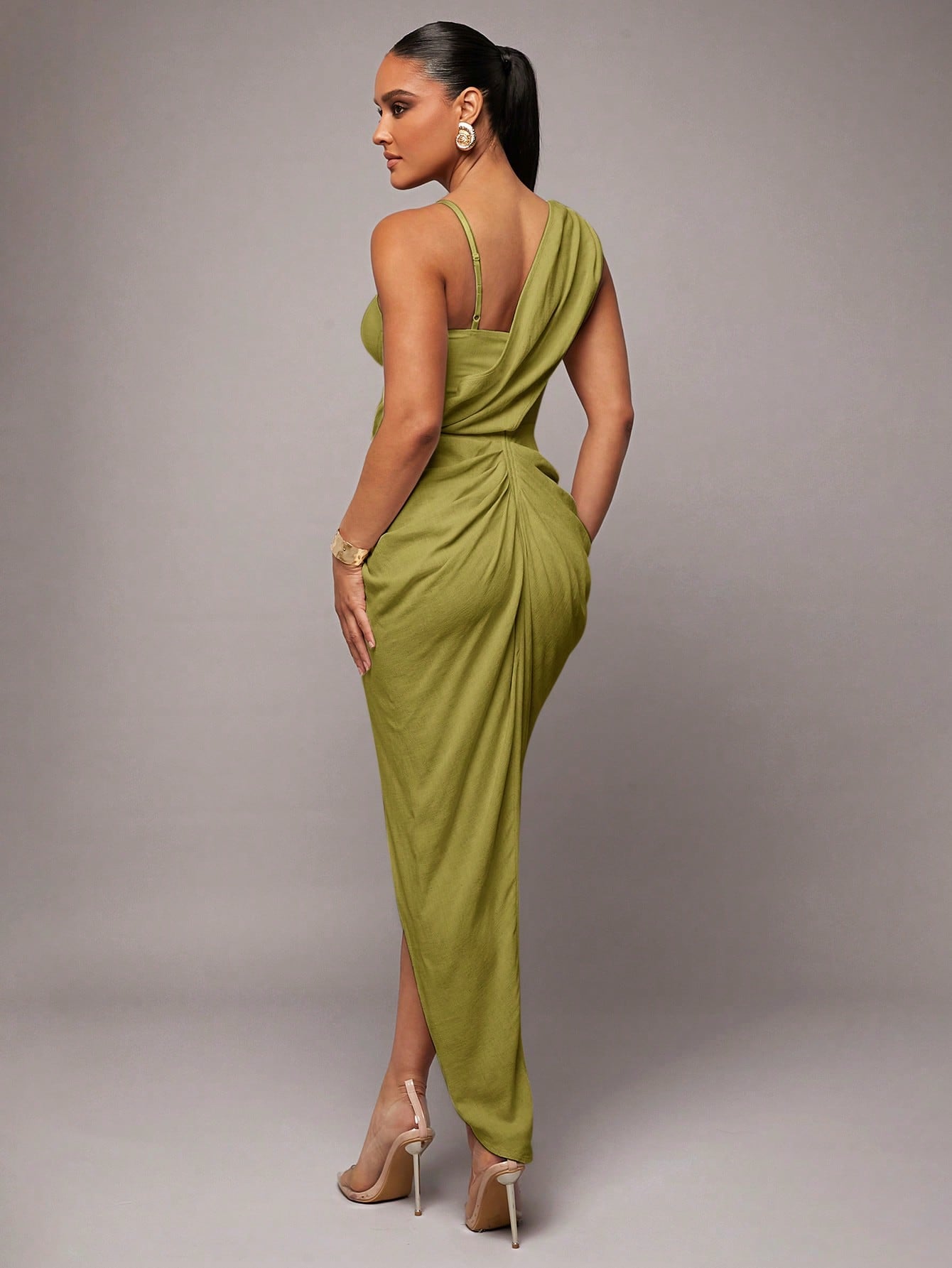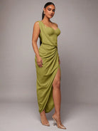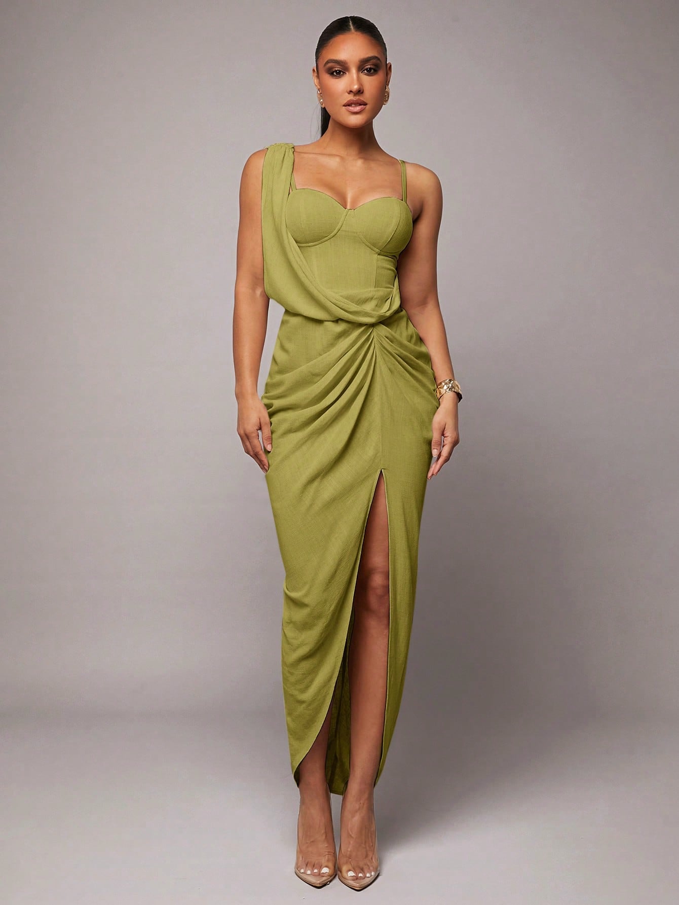 Silquee Romantic Valentine's Day & Dating Apricot Linen Asymmetric Draped Neckline High Slit Dress